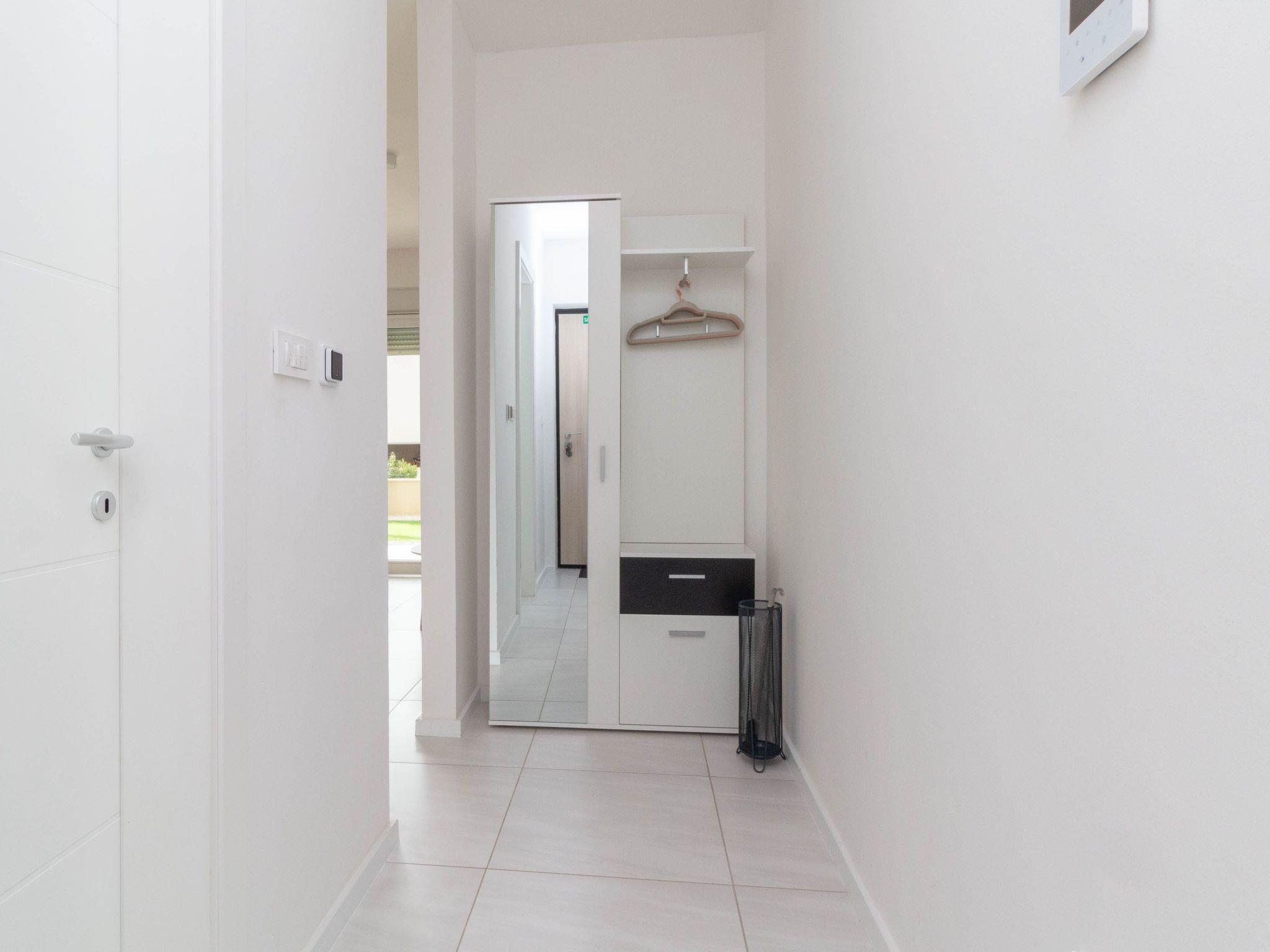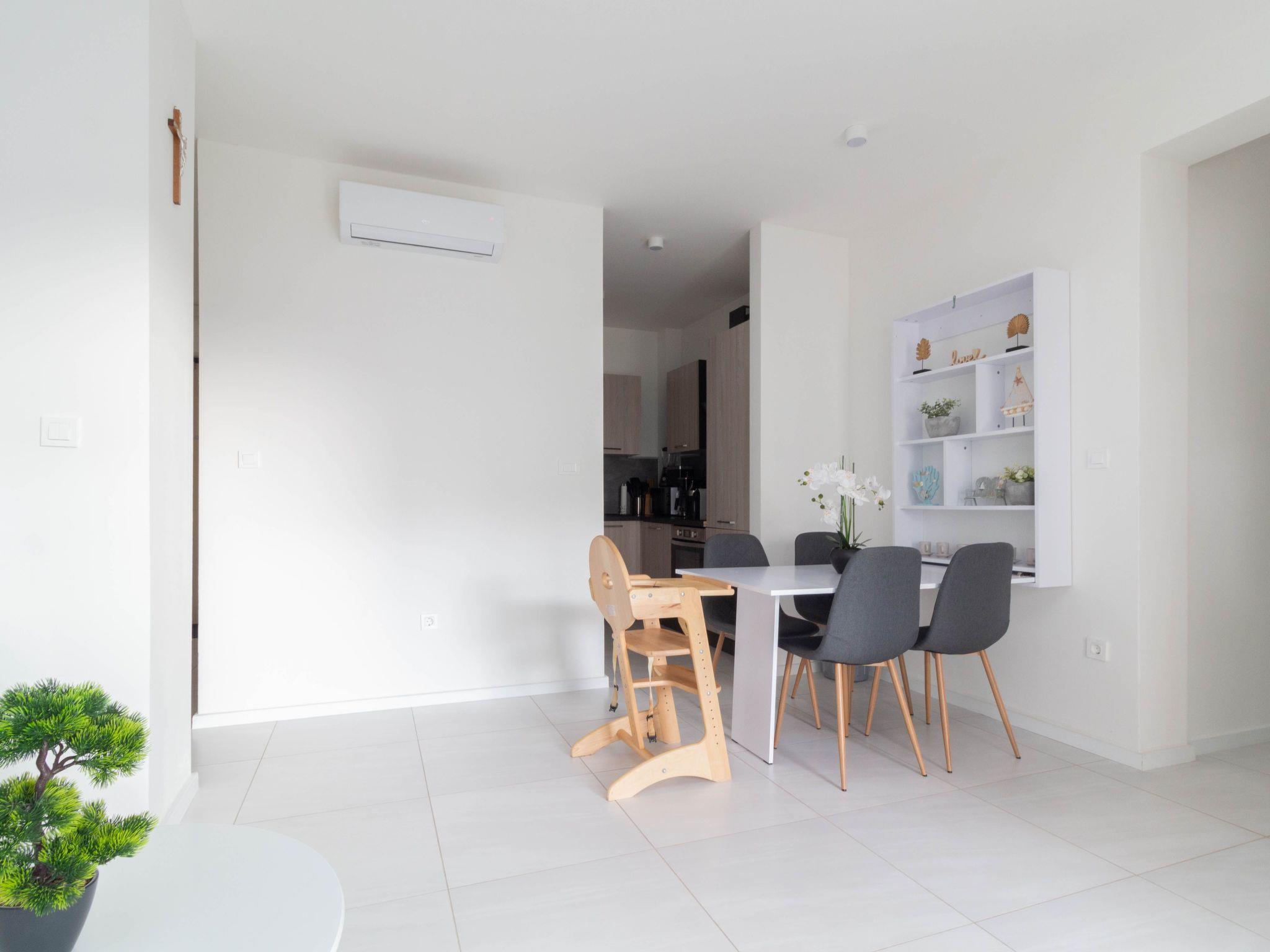 Inside, the apartment is outfitted with essential features designed for your comfort and convenience. Each of the two bedrooms is equipped with air conditioning, ensuring restful sleep even on the warmest nights. The sole bathroom is fully fitted, catering to your needs. For your convenience, a washing machine is provided for your exclusive use, making it easy to keep beachwear fresh throughout your stay. Meal preparation is a breeze in the modern kitchen, which comes complete with an induction hob, coffee machine, dishwasher, and electric kettle.