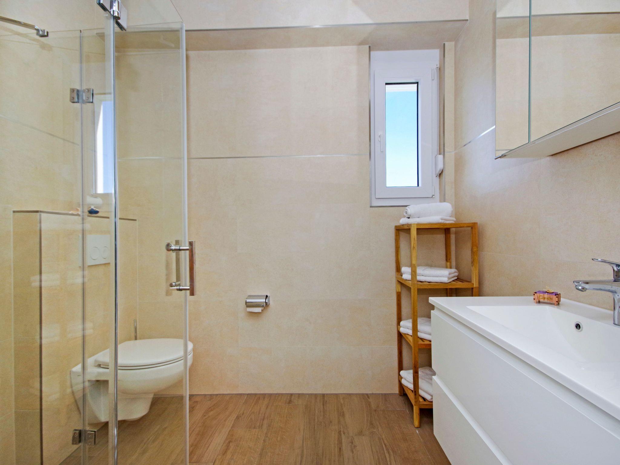 There is a ca. 20m² terrace with a sea view, along with a heated outdoor pool and a furnished sunny terrace. There is an additional shared terrace with a fireplace grill. You can use the parking spaces by the accommodation free of charge.