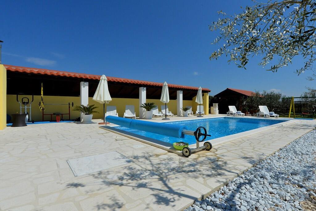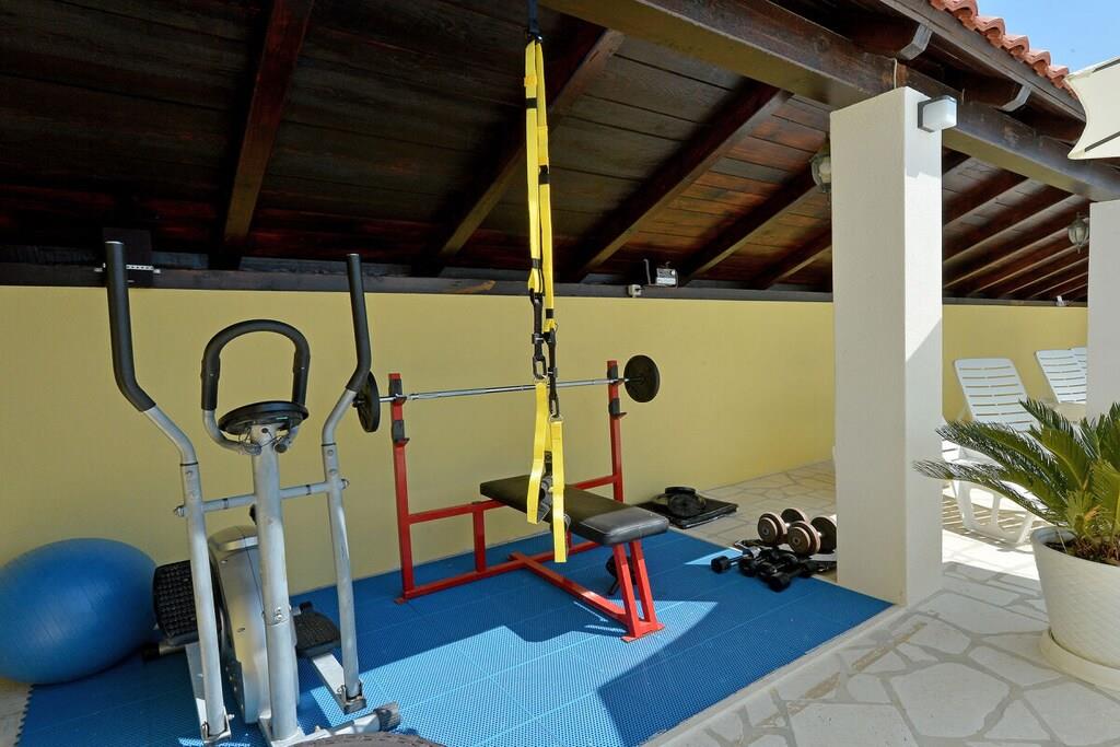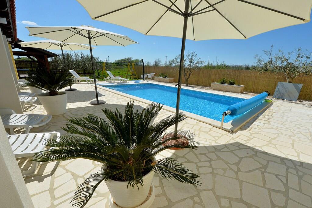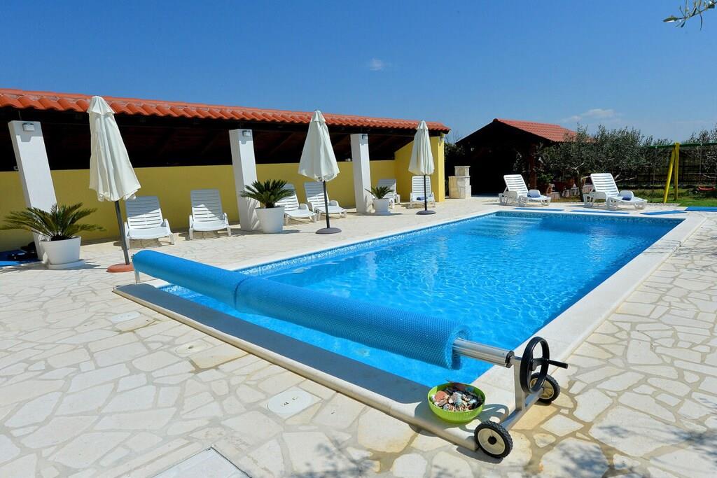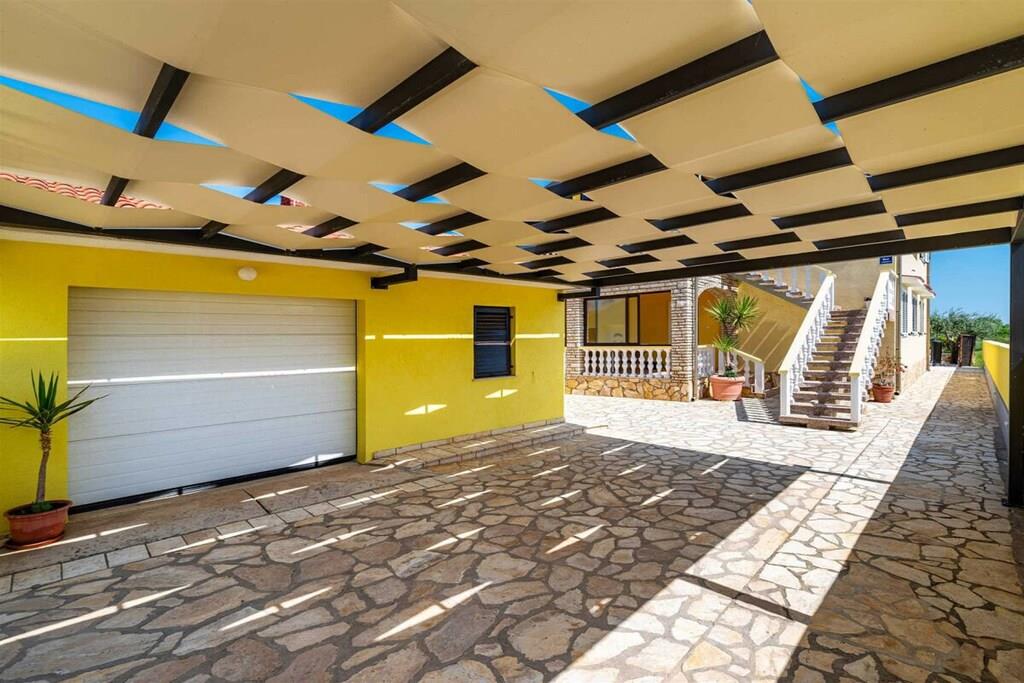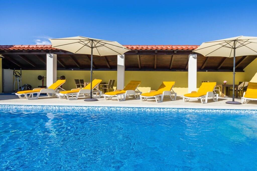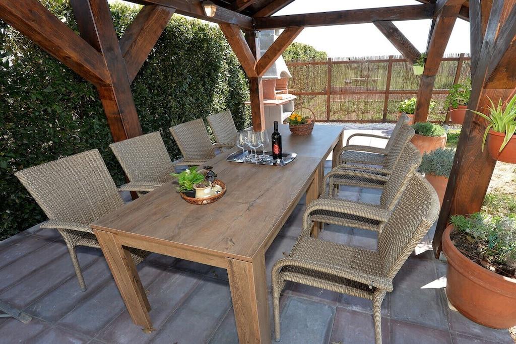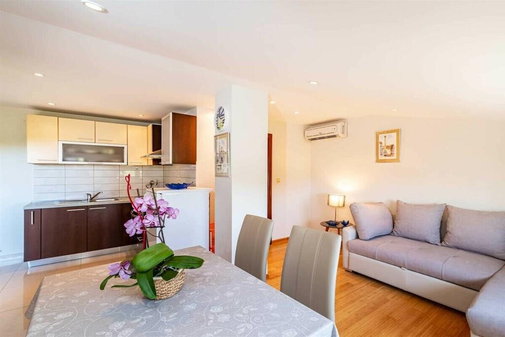 Das Haus besteht aus zwei Apartments mit einem Schlafzimmer, die zusammen vermietet werden. Sie befinden sich im ersten Stock des Hauses. Jedes Apartment verfügt über ein Schlafzimmer mit Doppelbett, ein Schlafsofa für zwei Personen im Wohnzimmer, eine gut ausgestattete Küche und ein Badezimmer mit Dusche. Im Garten gibt es einen Grillplatz mit Essbereich im Freien, einen großen Pool von 32 m2, geschlossen und privat.