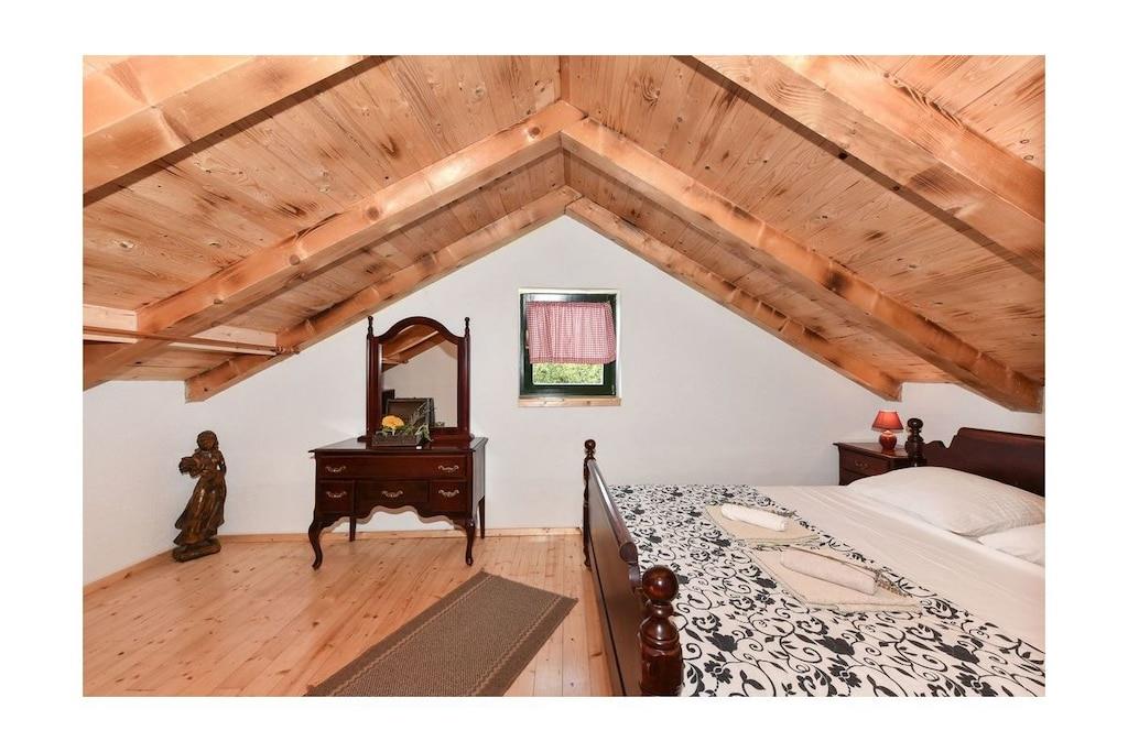 Feriehuset har en stor have. Det består af to etager: stueetagen har køkken, badeværelse og spise-/opholdsstue, mens øverste etage har to soveværelser og en stor balkon. Det har plads til 5-6 personer. Parkering og grill er tilgængelig lige foran huset.