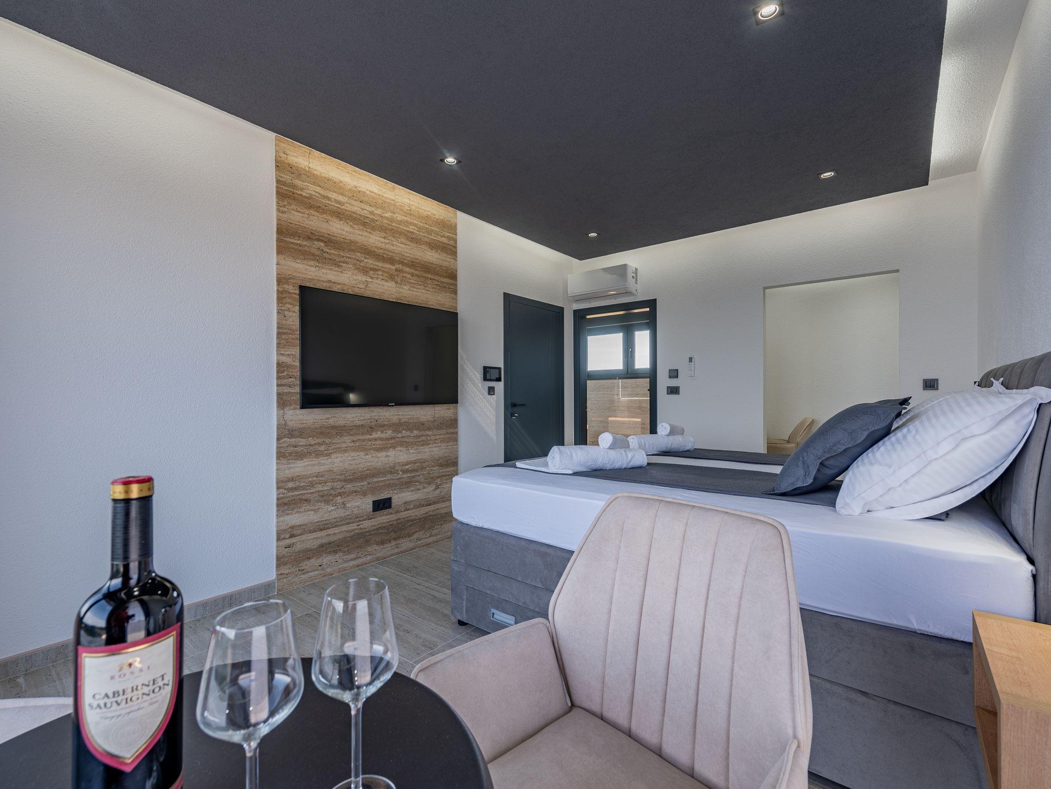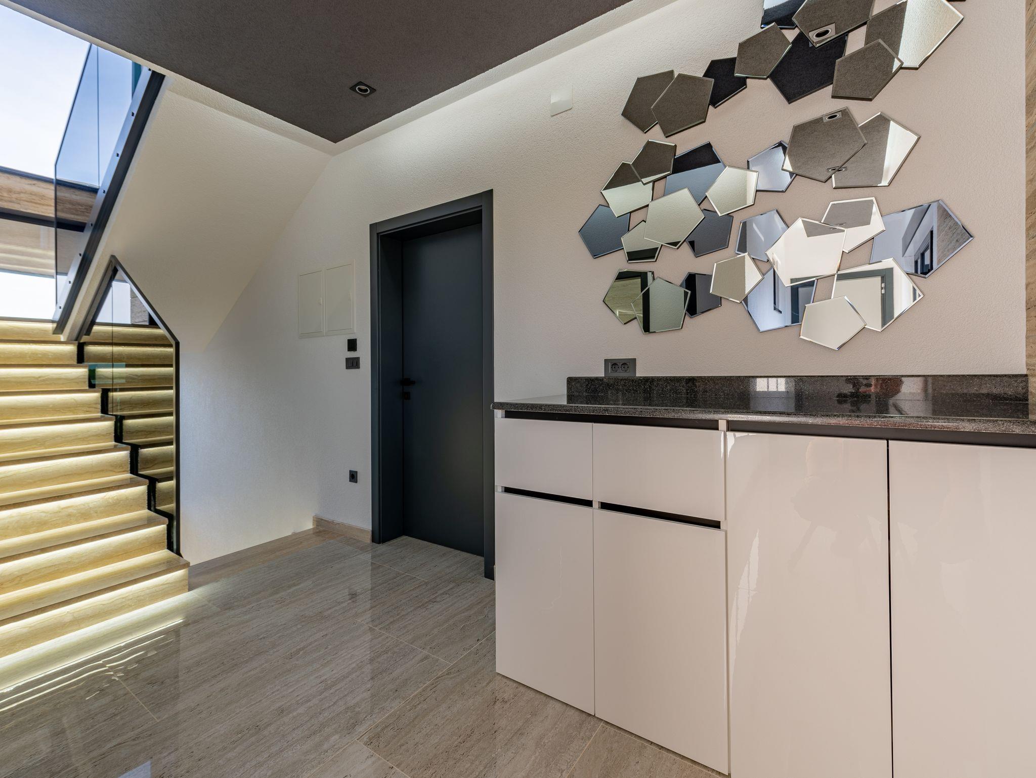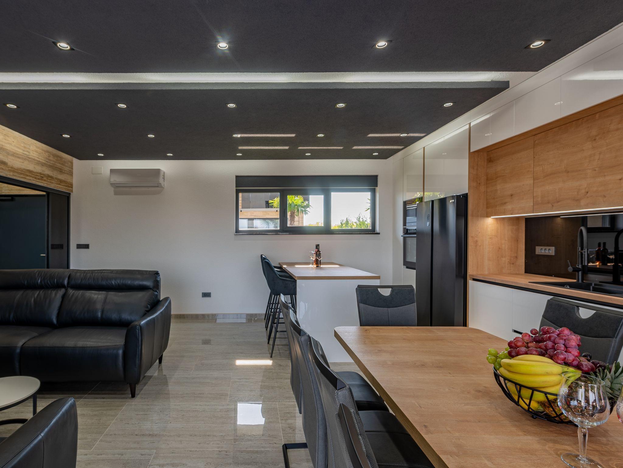 Haus bietet Platz für 10 Gäste. Die Betten sind in Schlafzimmern, die es 5 gibt, innerhalb einer Gesamtfläche von 182m2, angeordnet. Die Gäste haben eine eigene Terrasse zur Verfügung, auf der sie in warmen Sommernächten genießen können. Das Haus bietet Meerblick. Für vollen Genuss und Entspannung gibt es einen privaten Grill für Gäste dieser Unterkunft. Während ihres Aufenthalts können sich Gäste im privaten Schwimmbad entspannen. IM PREIS INBEGRIFFEN: Kurtaxe, Endreinigung, Klimatisierung, Pool, Parkplatz, Garage, Internet, Kinderbett, Bügeleisen, Bügelbrett, Föhn. VERBINDLICHE ZUSÄTZLICHE KOSTEN: Aufzahlung für Kurzaufenthalte (prozentualer Zuschlag pro Nächtigungsanzahl: 30% - 1, 20% - 2, 10% - 3). Die Verfügbarkeit zusätzlicher Dienstleistungen in Ihrem reservierten Termin und die Preise derselben (falls nicht aufgeführt) müssen im Voraus überprüft werden. Zusätzliche Dienstleistungen die in der Zahlungsaufforderung nicht aufgeführt sind werden direkt beim Vermieter bezahlt, angenommen der Gast nutzt auch diese.
