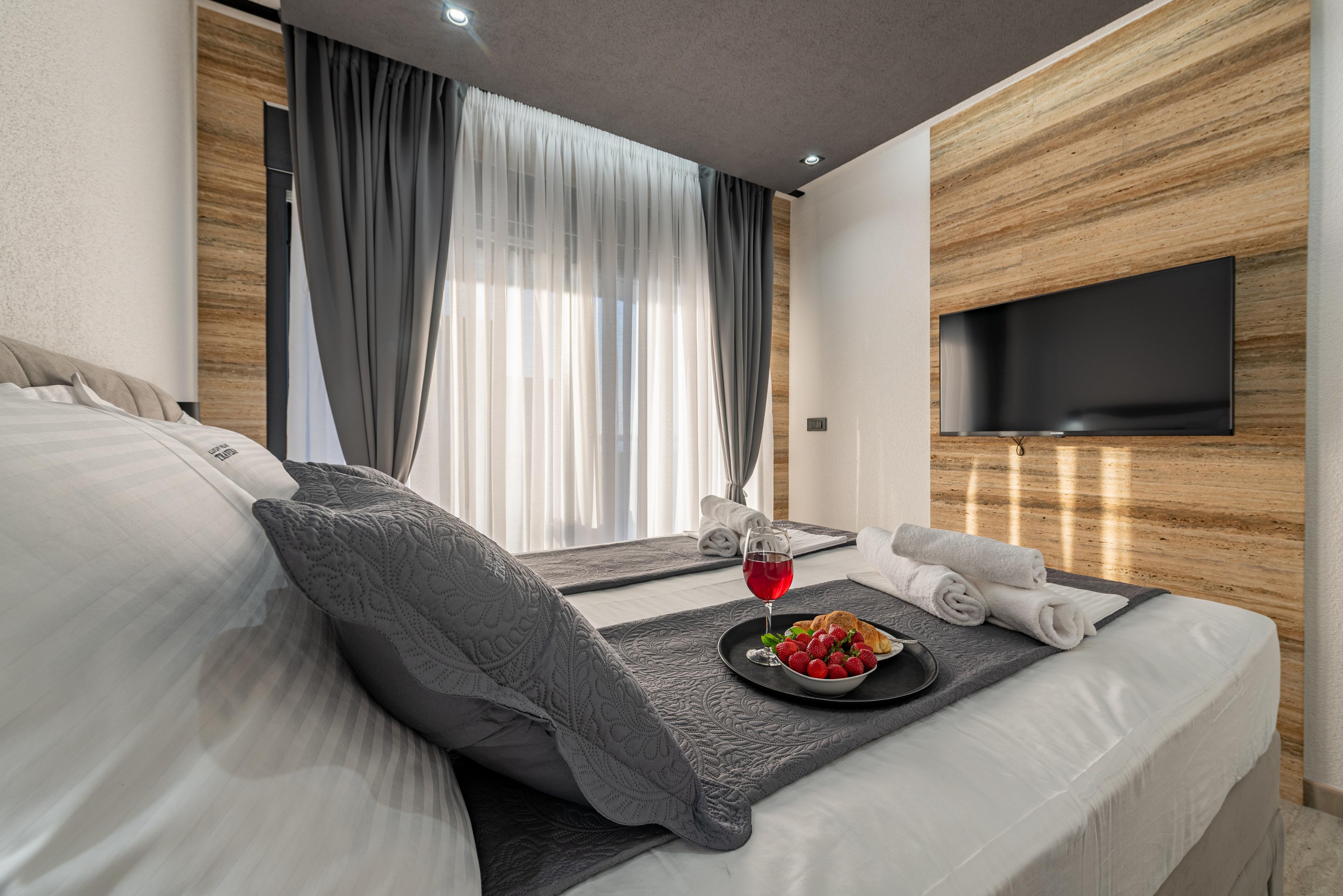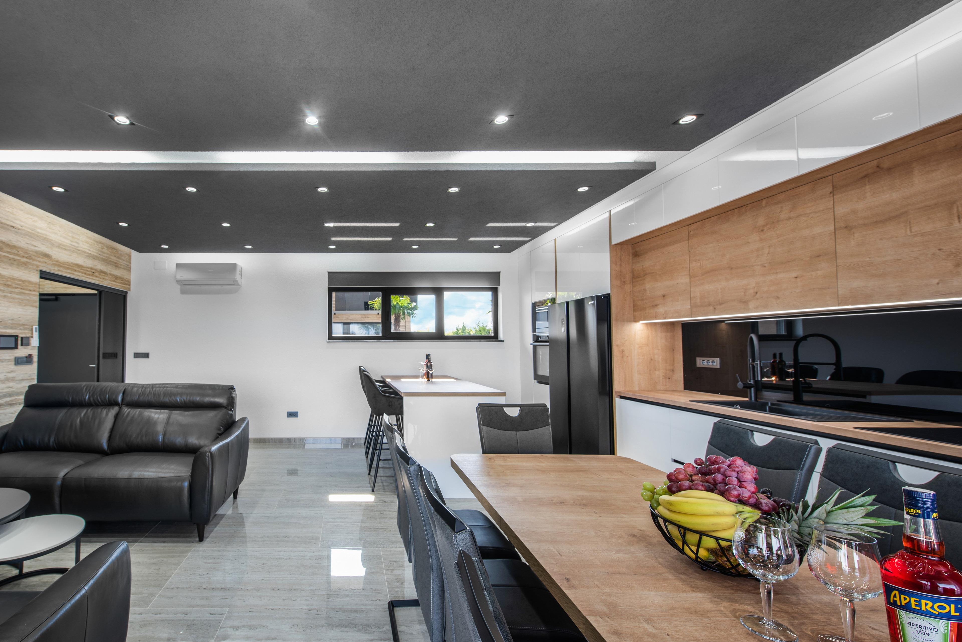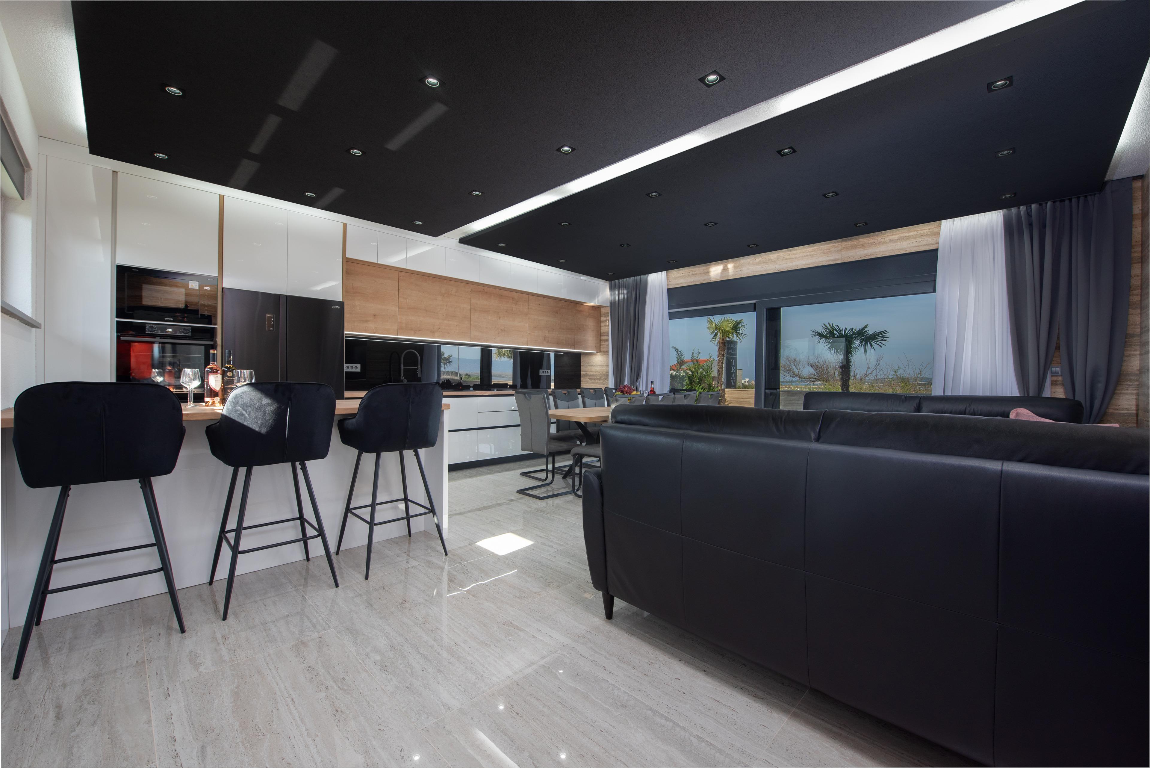 Im Erdgeschoss befindet sich ein stilvolles Wohnzimmer mit Poolblick, Esszimmer mit voll ausgestattete Küche, ein Schlafzimmer mit Doppelbett und eigenem Badezimmer mit Dusche. Im ersten Stock der Villa befinden sich drei Schlafzimmer mit Doppelbetten, jeweils mit eigenem Bad mit Dusche, während sich im zweiten Stock ein Schlafzimmer mit Doppelbett und eigenem Bad mit Dusche befindet. Jedes Schlafzimmer verfügt über Meerblick und einen Zugang zur Terrasse/Balkon und alle sind mit Satellitenfernsehen und Klimaanlage ausgestattet. Zur Villa gehören eine Dachterrasse mit Panorama Meerblick sowie Sitzbereich.
