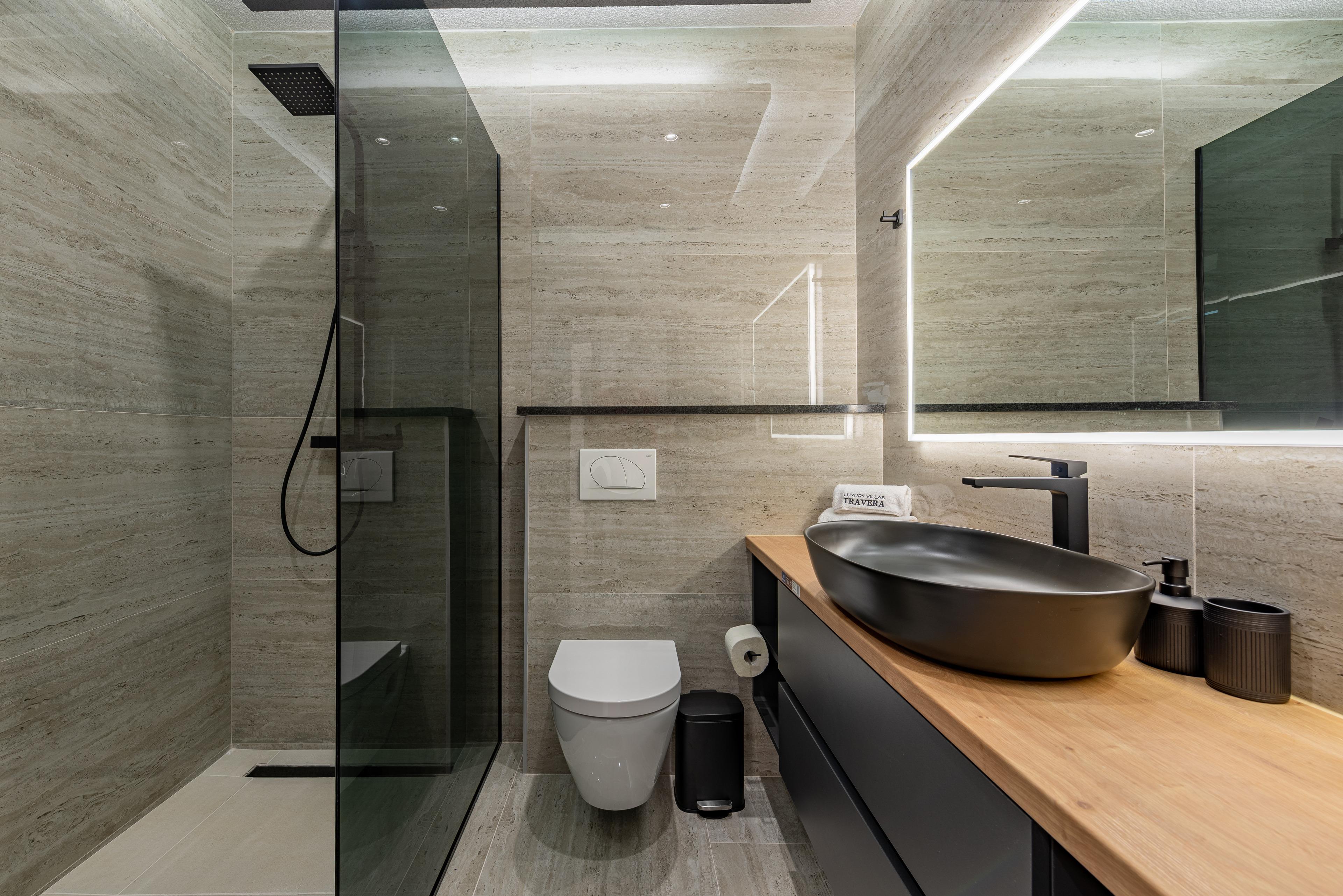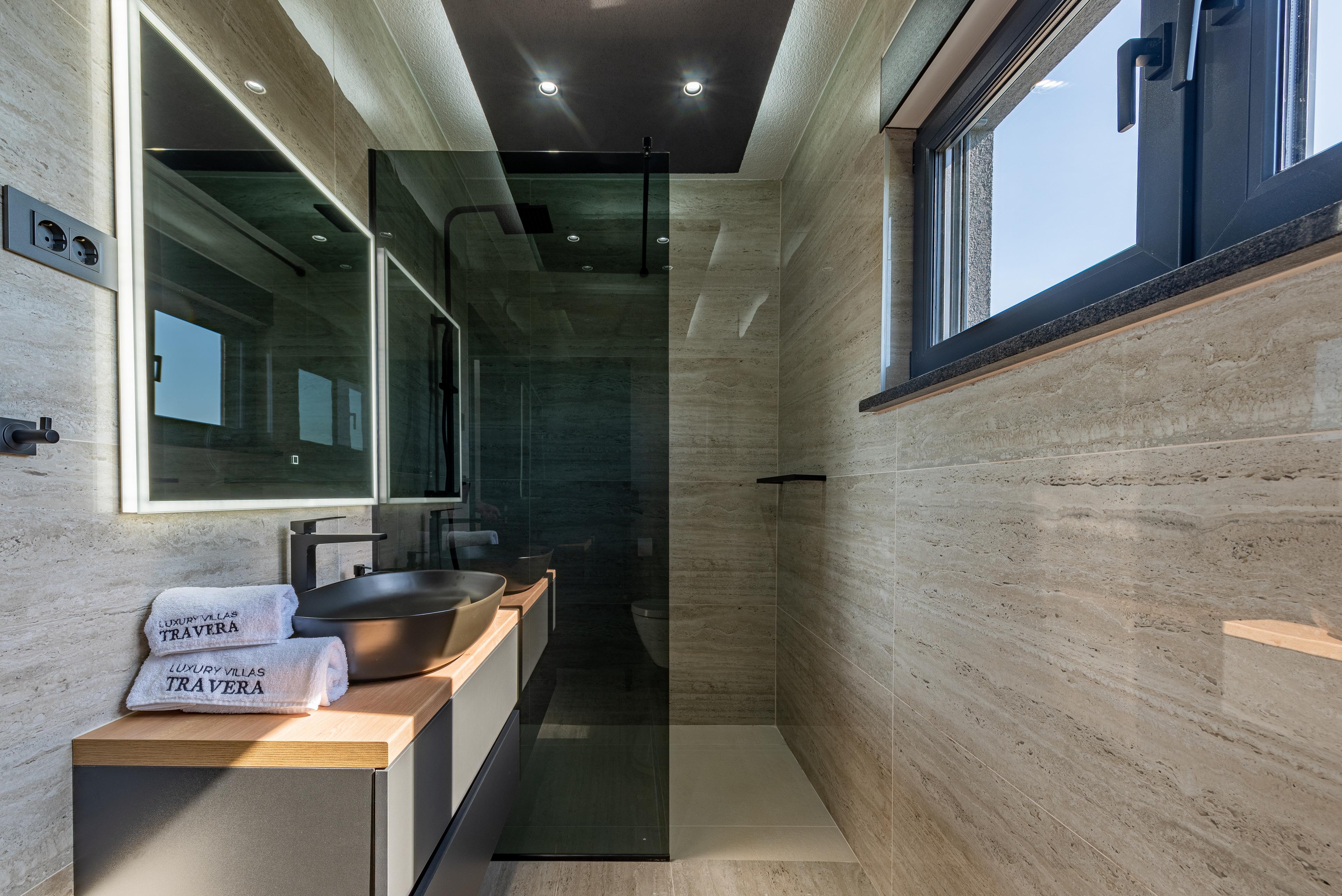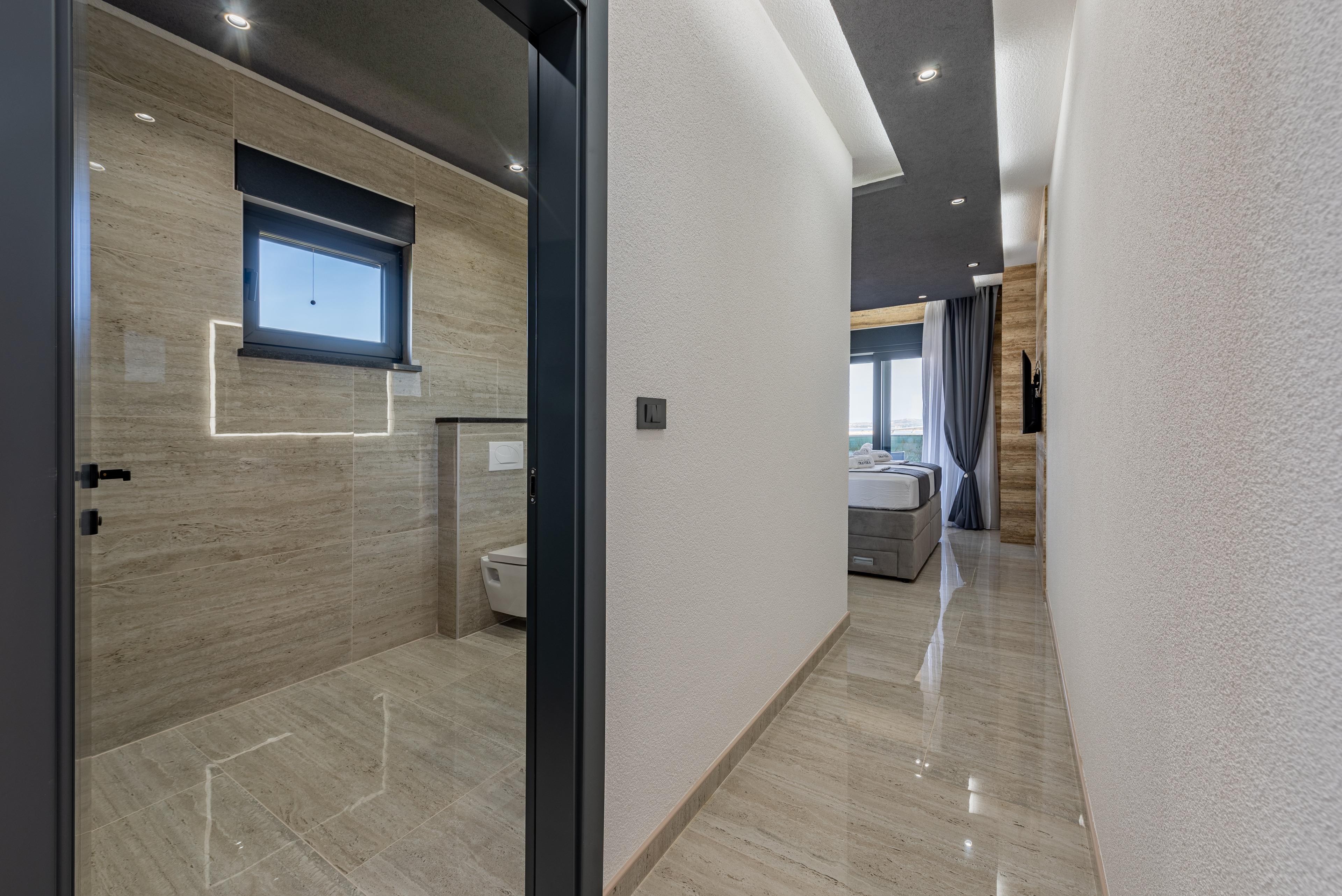 Im Erdgeschoss befindet sich ein stilvolles Wohnzimmer mit Poolblick, Esszimmer mit voll ausgestattete Küche, ein Schlafzimmer mit Doppelbett und eigenem Badezimmer mit Dusche. Im ersten Stock der Villa befinden sich drei Schlafzimmer mit Doppelbetten, jeweils mit eigenem Bad mit Dusche, während sich im zweiten Stock ein Schlafzimmer mit Doppelbett und eigenem Bad mit Dusche befindet. Jedes Schlafzimmer verfügt über Meerblick und einen Zugang zur Terrasse/Balkon und alle sind mit Satellitenfernsehen und Klimaanlage ausgestattet. Zur Villa gehören eine Dachterrasse mit Panorama Meerblick sowie Sitzbereich.