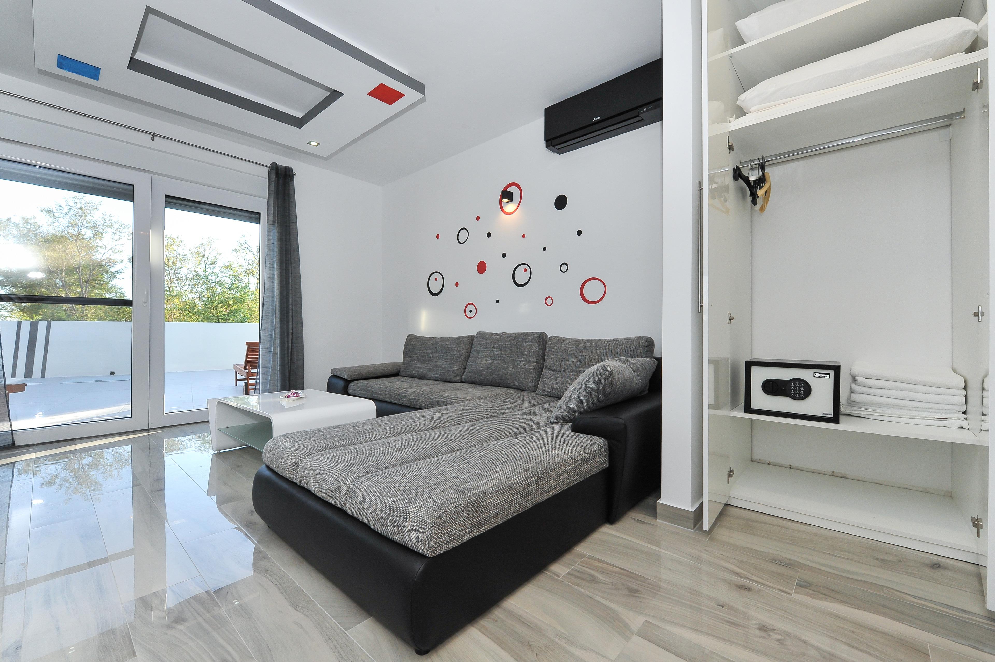 Der nächste Strand befindet sich in einer Entfernung von 300 m. Die Entfernung zum Supermarket beträgt 100 m und das nächste Restaurant ist 200 m von der Wohnung entfernt. Die Entfernung zum Privlaka Zentrum beträgt 2000 m.
