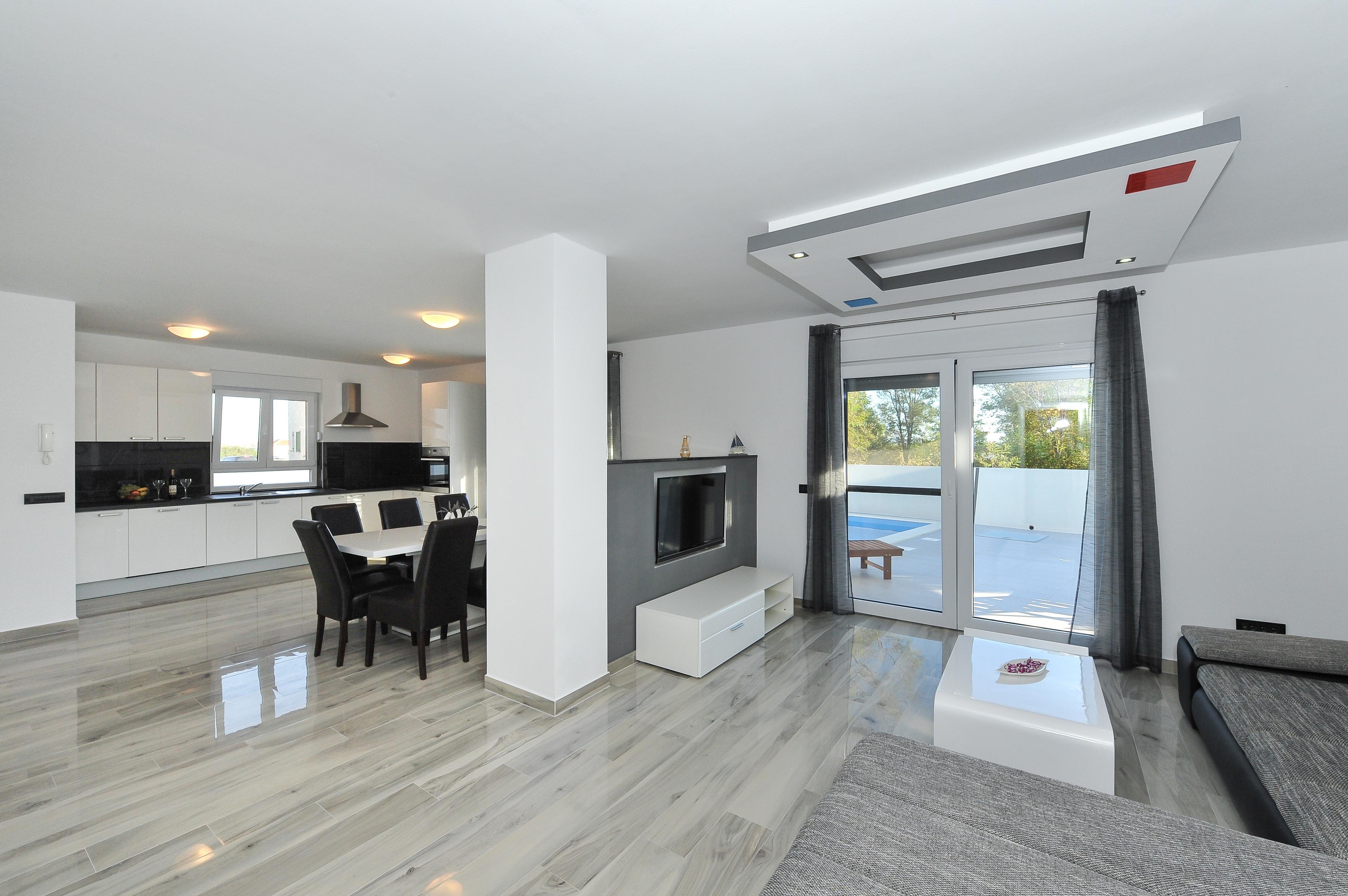 Diese moderne Villa mit Swimmingpool befindet sich in einer ruhigen Gegend der Gemeinde Privlaka. Die 150 m² Villa erstreckt sich über zwei Etagen und ist ideal für 8 Personen.