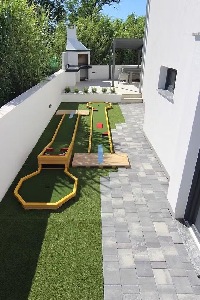 Die 25 m² große Terrasse im Erdgeschoss bietet einen Pavillon mit Grill, Tisch, Stühlen und Sitzgelegenheiten. Angrenzend an die Terrasse befinden sich eine Minigolfanlage und der Zugang zu einem einzigartigen, 6 Meter langen, beheizten Swimmingpool. Neben dem Pool stehen Liegestühle, Sonnenschirme und eine Außendusche bereit.