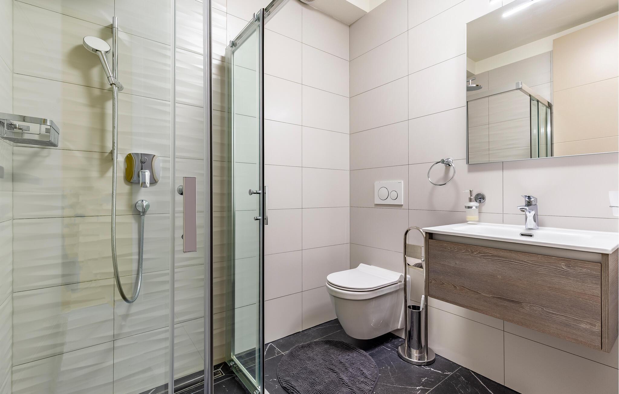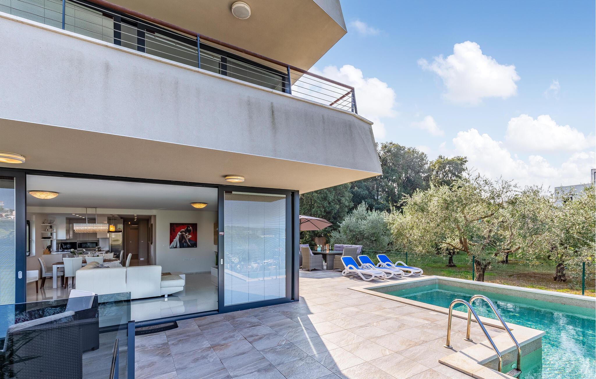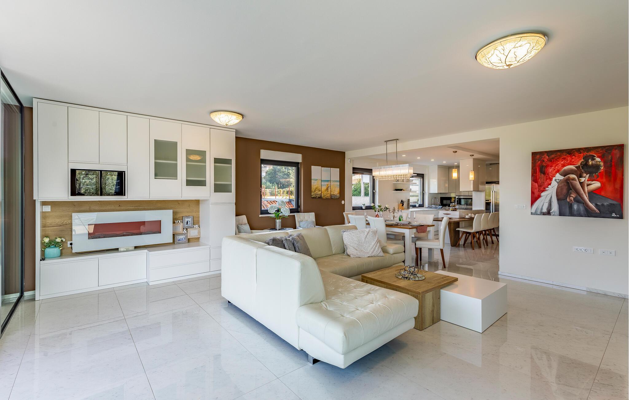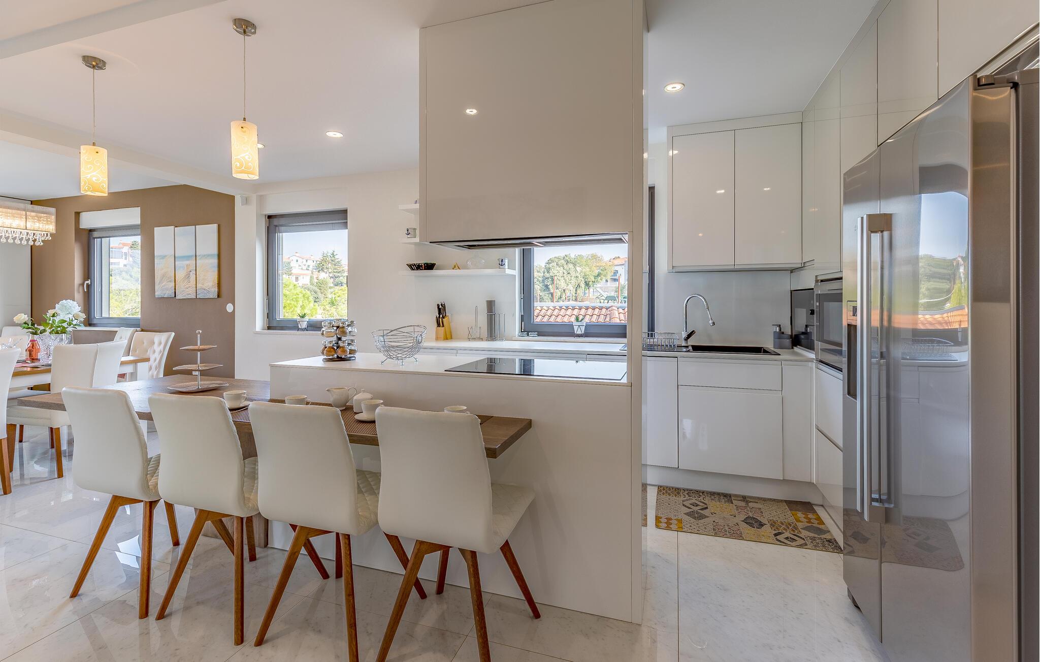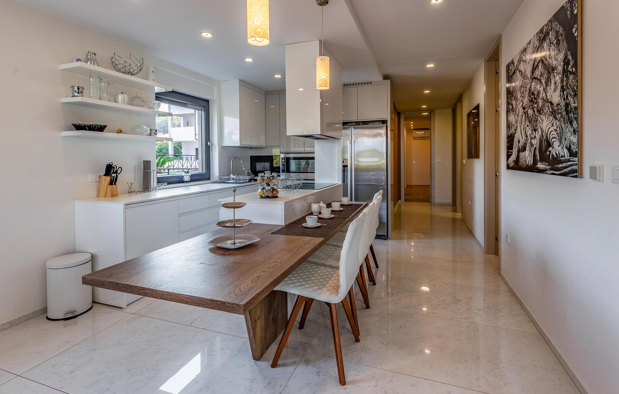Forkæl jer selv med en fantastisk ferie i denne luksuriøse lejlighed lige ved stranden. Denne lejlighed kan ikke kun prale af en førsteklasses beliggenhed ved stranden, men imponerer også med sine elegante møbler og moderne komfort. Store vinduer oversvømmer interiøret med varmt naturligt lys, mens I kan nyde en storslået udsigt over de omkringliggende grønne områder fra den komfortable sofa. Uanset om I streamer jeres yndlingsprogrammer, nyder en sjov spilleaften eller tilbereder lækre måltider sammen, vil I hurtigt glide ind i ferietilstand. Gå ud på terrassen som det første om morgenen og lad jeres blik vandre over den smukke bugt. Tag en dukkert i poolen, svøm et par baner, eller spil vandpolo med børnene. Nyd solen på en af liggestolene eller slap af i det skyggefulde loungeområde med en kølig drink og en god bog. Stranden ligger lige uden for døren, så I kan tage en svømmetur, når I har lyst. Oplev farverige fisk og rev, mens I snorkler eller dykker i Adriaterhavets krystalklare vand. Udforsk omgivelserne til fods eller på cykel, og lad jer fortrylle af middelhavsduften fra fyrreskovene omkring Pješcana Uvala. Tag en slentretur langs havnepromenaden og prøv lokale specialiteter på en af de charmerende restauranter.