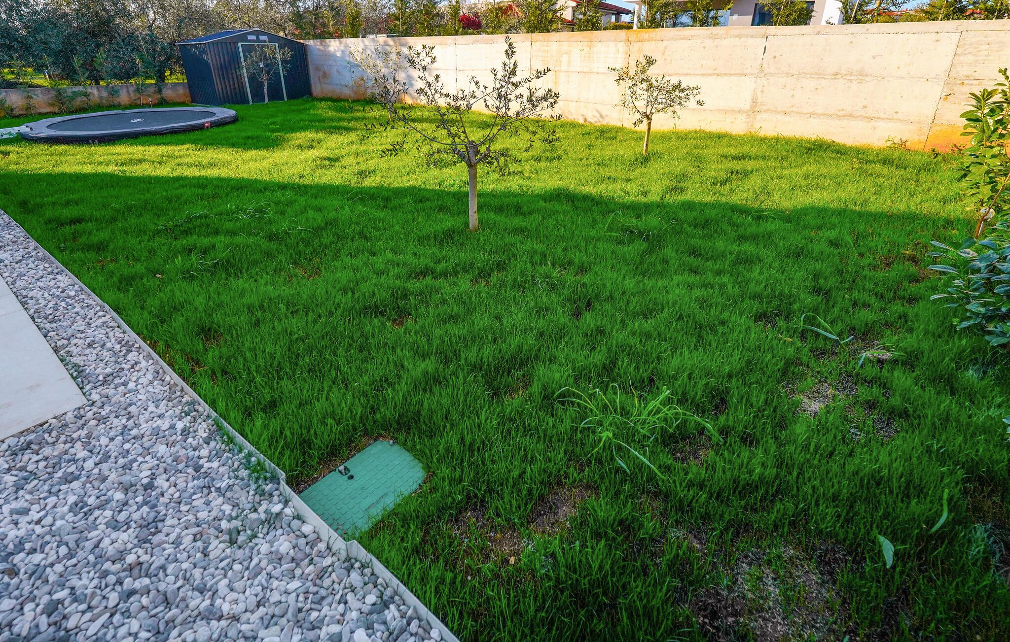 Udendørs venter en fantastisk, privat poolzone. Placer jeres komfortable liggestole enten i skyggen under parasollerne eller under den varme middelhavssol. Brug den kvalitetsgrill til at tilberede lækre måltider, og nyd hyggelige barbecue-aftener under den overdækkede terrasse med udsigt til den stemningsfuldt oplyste pool. De yngre gæster vil elske legezonen med klatrestativ og trampolin.