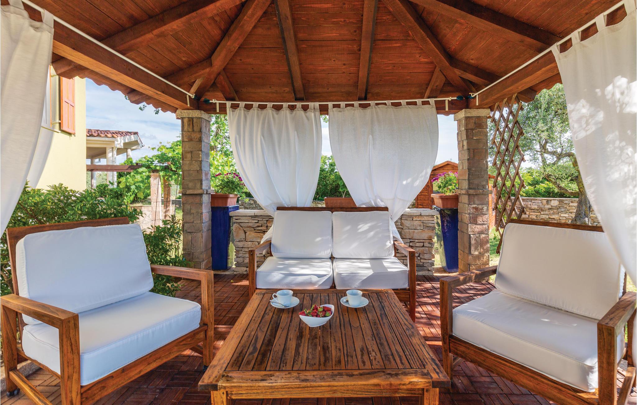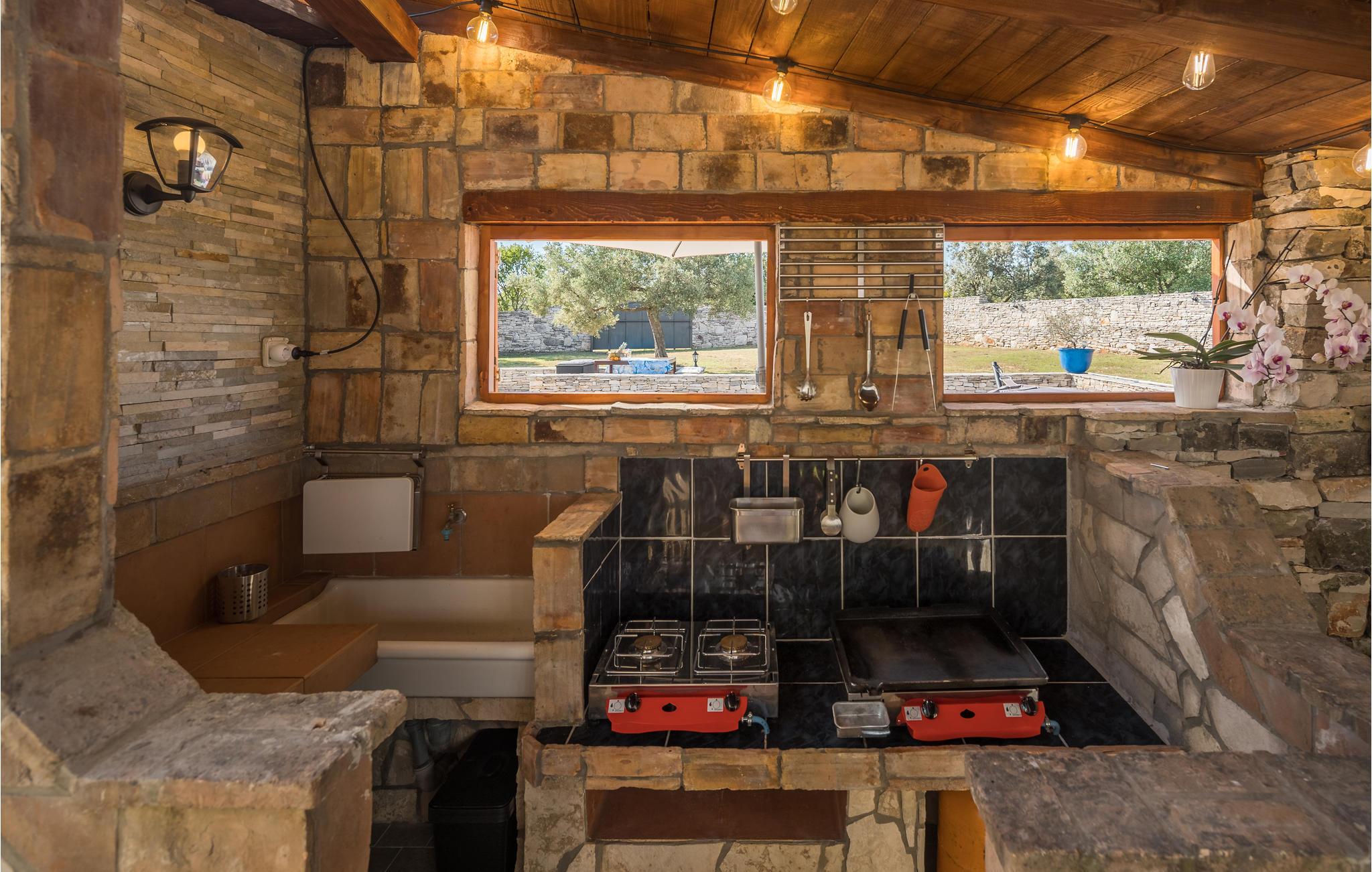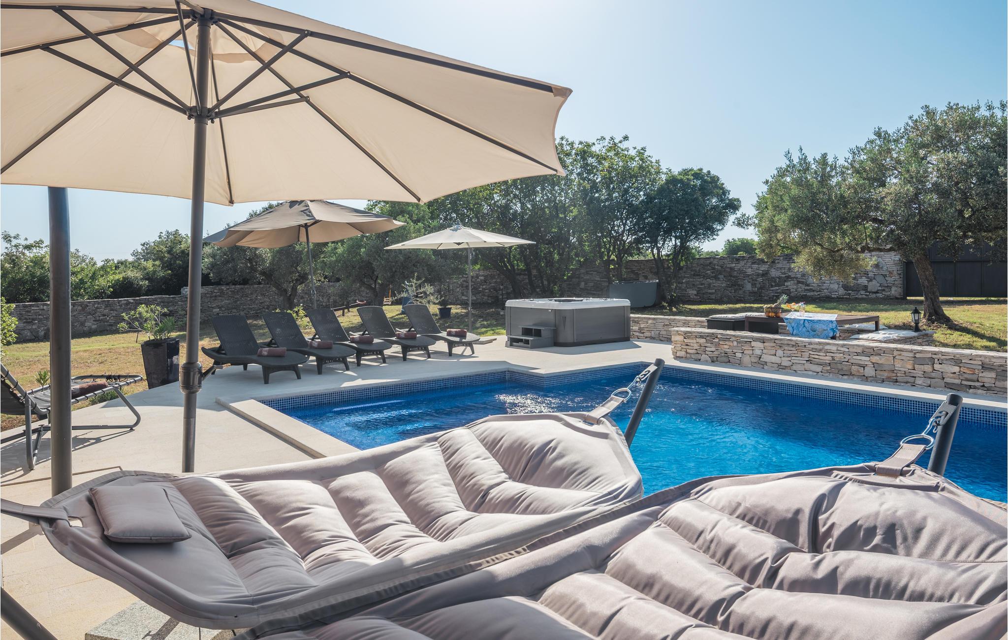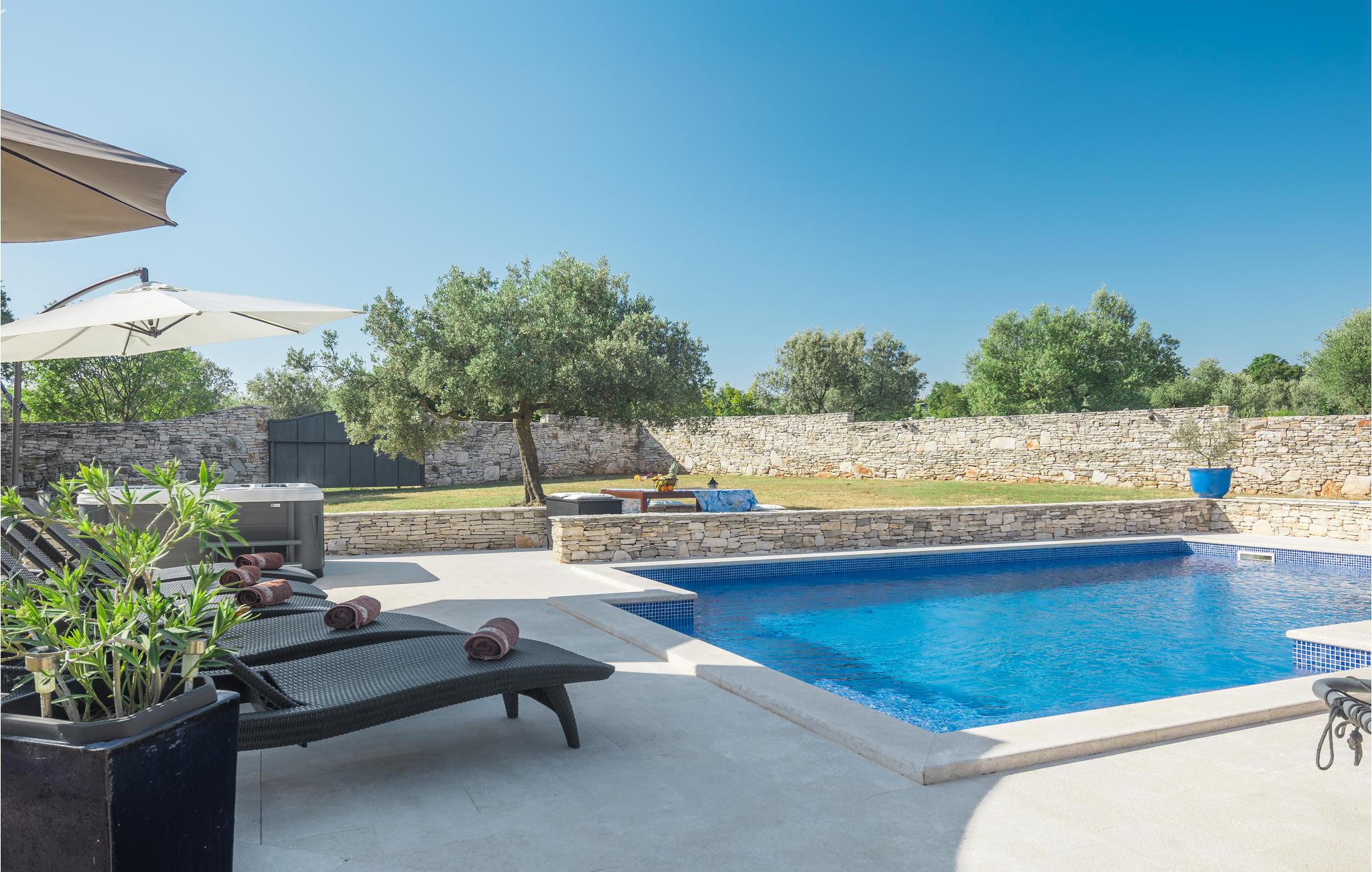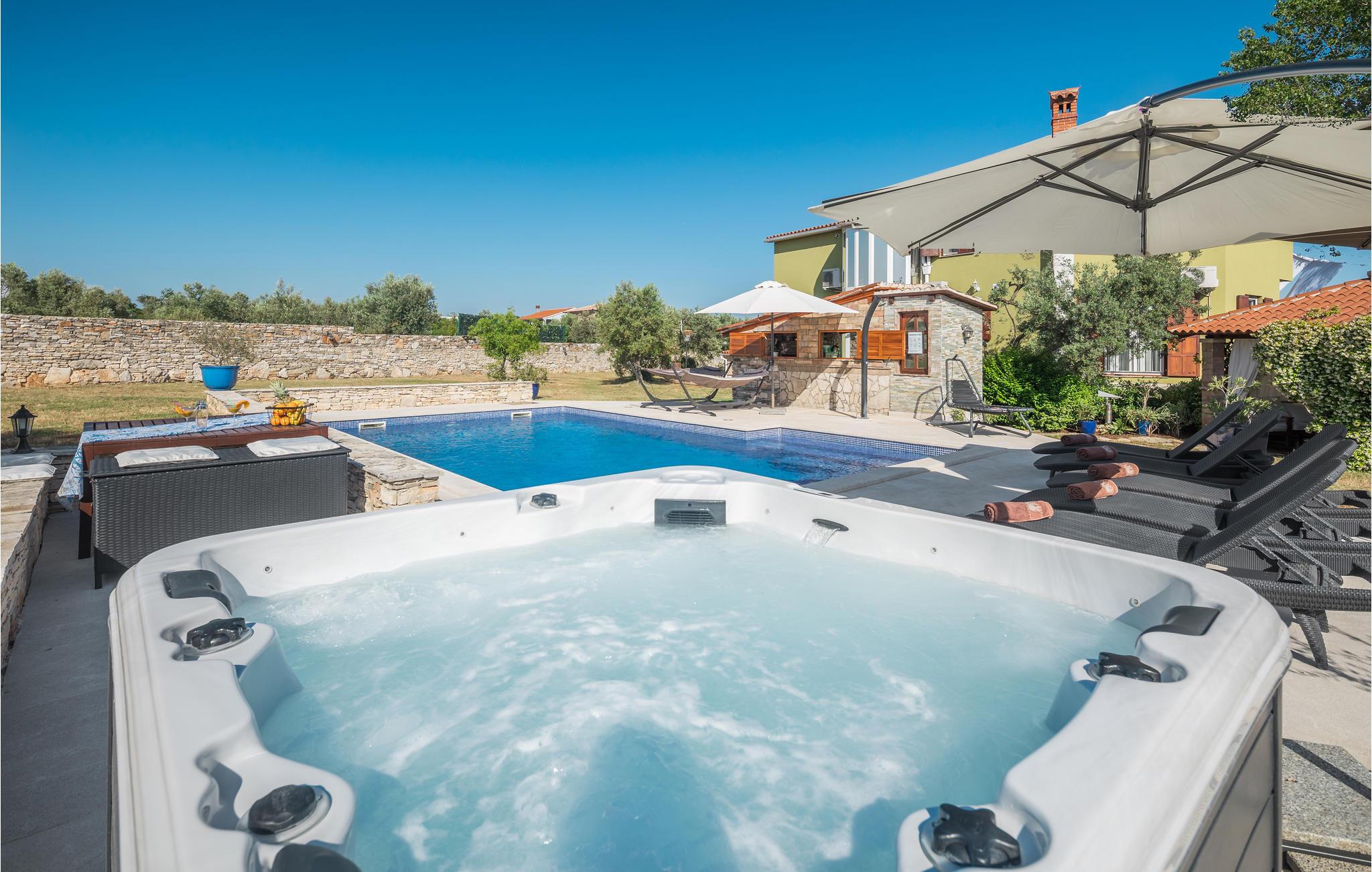 Feriehus med pool og god plads, der fordeler sig på stueplan og første sal. I haven er der oliventræer og meget grønt. Indretningen er komfortabel og praktisk hvad end I kommer som familie eller en gruppe gode venner. Der er en taverne til gæsterne, hvor I kan hygge jer sammen omkring et godt måltid men også spille dart. På den overdækkede terrasse er der et bord af sten og tilsvarende bænke til hyggelige udendørs stunder. Den høje stenmur sørger for jeres privatsfære og for børnenes sikkerhed. På grunden er der en parkeringsplads parat til jer. Se den antikke by Pula med dens kulturelle seværdigheder. Der er tre parkeringspladser på grunden.