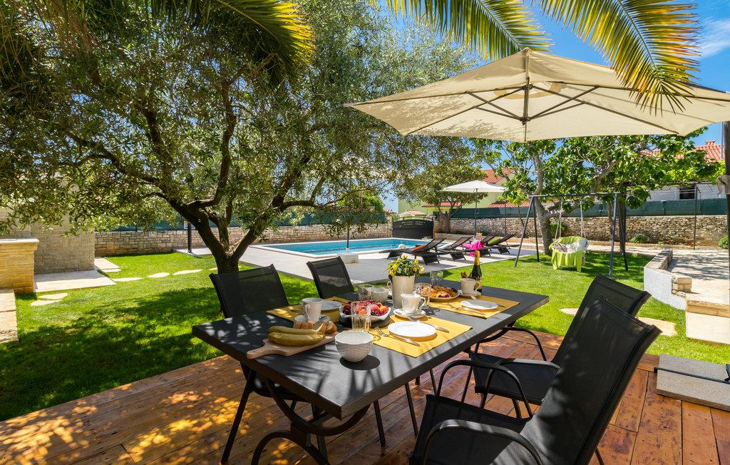 Elegant rækkehus med velplejet have og et svømmebassin der står på jorden, med beliggenhed i en lille forstad til Pula. Huset er solidt bygget og godt udstyret, bl.a. med stue og køkken med klimaanlæg i stuelan og to soveværelser på øverste etage, et komfortabelt valg til en dejlig ferie. På den velplejede og indhegnede grund er der en dejlig terrasse, grill og havemøbler og et svømmebassin som er dejligt at forfriske sig i når solen står højt. Da her også er rutsjebane og gynge er huset oplagt til familieferie med mindre børn.