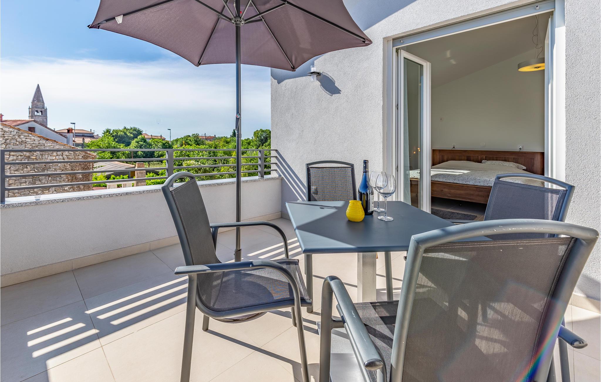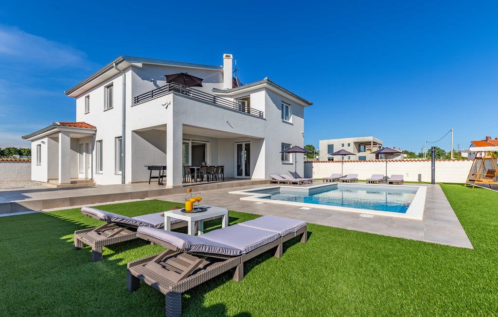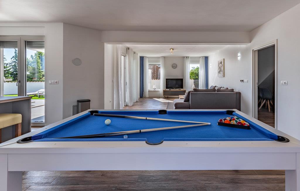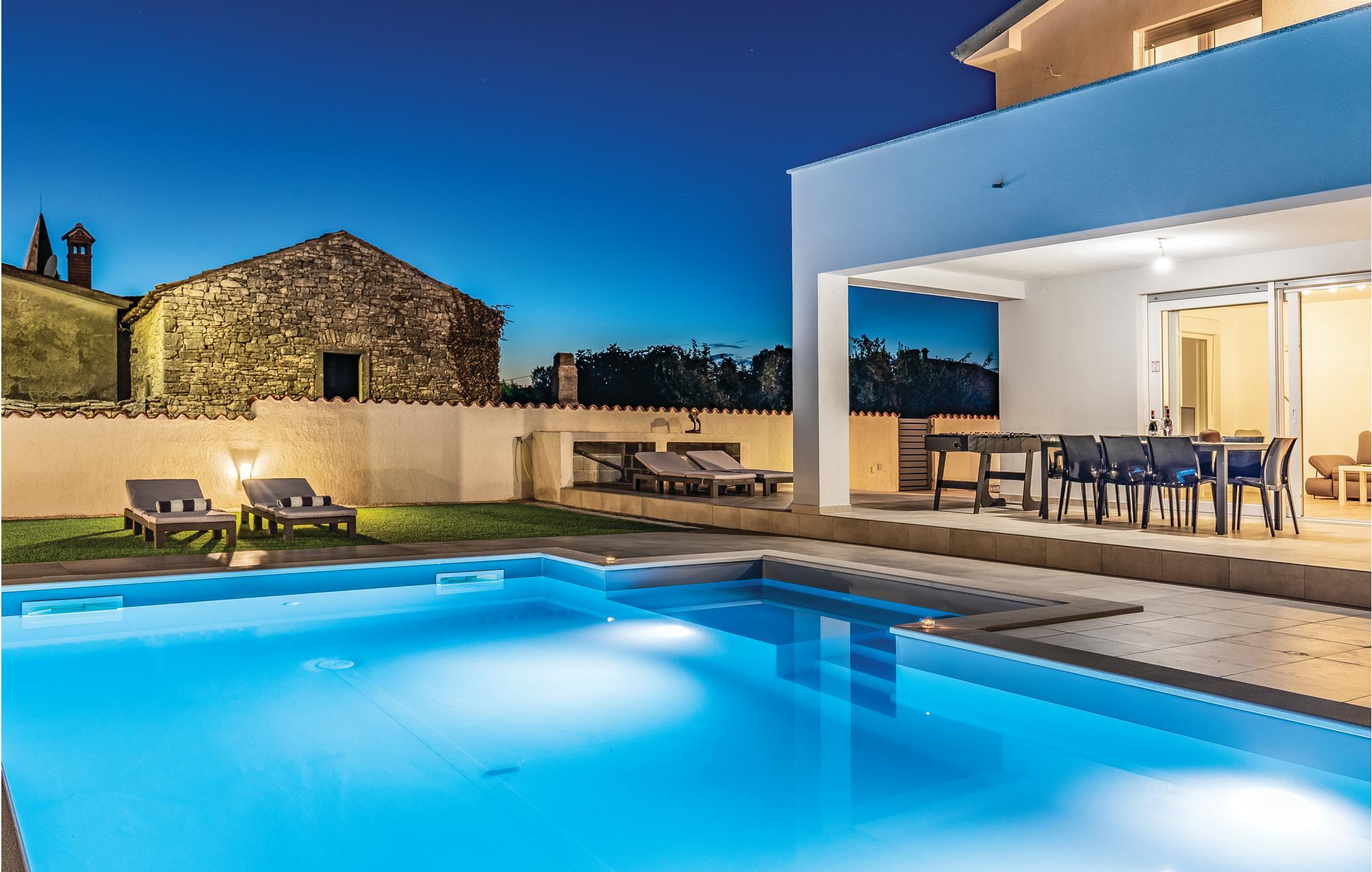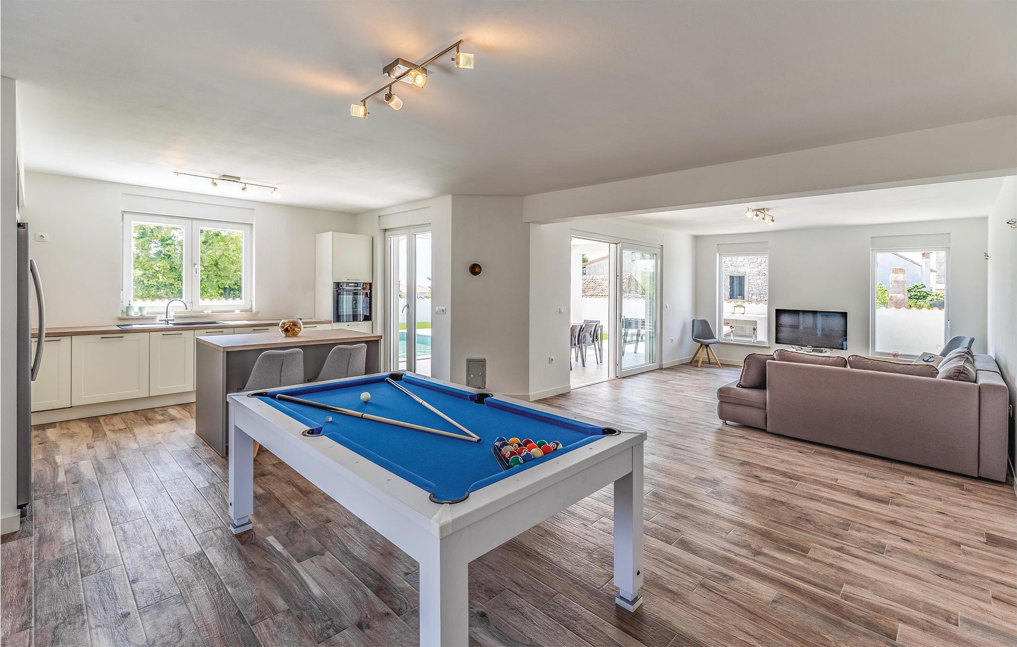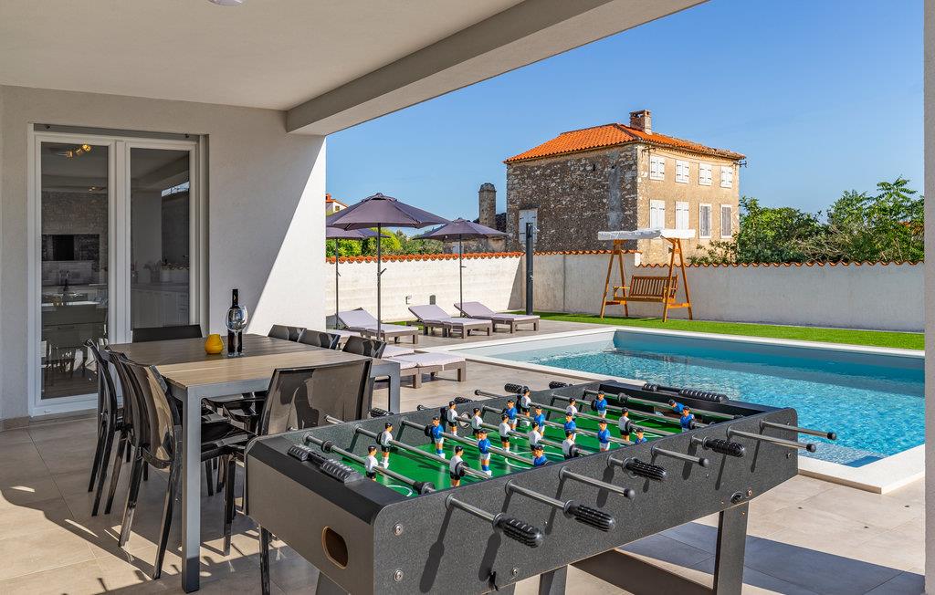 Nyd din ferie i dette smukke og moderne feriehus med swimmingpool. Dette elegante og veludstyrede feriehus i Galizana tilbyder jer og dine kære det perfekte tilflugtssted for en afslappende ferie. Den moderne indretning og det lyse interiør skaber en indbydende, luksuriøs atmosfære. Særligt bemærkelsesværjert er den multifunktionelle spiseplads, hvor dit bord også fungerer som et poolbord - et højdepunkt for selskabelige aftener. På øverste etage finder I en anden stue med et komplet køkken og en rummelig terrasse med delvis havudsigt samt et overblik over naturen, byen og kirketårnet. Den lukkede ejendom tilbyder jer fuldstænjer privatliv og plads til afslapning, mens børn kan lege udenfor uforstyrret. Kom sammen for at svømme i swimmingpoolen og afslutte aftenen med grillretter fra sommerkøkkenet på den overdækkede terrasse. Galizana er det ideelle udgangspunkt for at opdage Istrien. På kun ti minutter i bil kan I nå smukke strande og forfriske jer i det krystalklare vand. En tur til den historiske gamle bydel i Vodnjan vil glæde jer med dens rige kultur og charmerende gader. Til en mere livlig dag anbefaler vi kystbyen Fazana, som tiltrækker med sin havn og talrige restauranter. Det omkringliggende område byder også på adskillige aktiviteter såsom cykling, vandreture og kulturelle besøg - perfekt for aktive feriegæster!