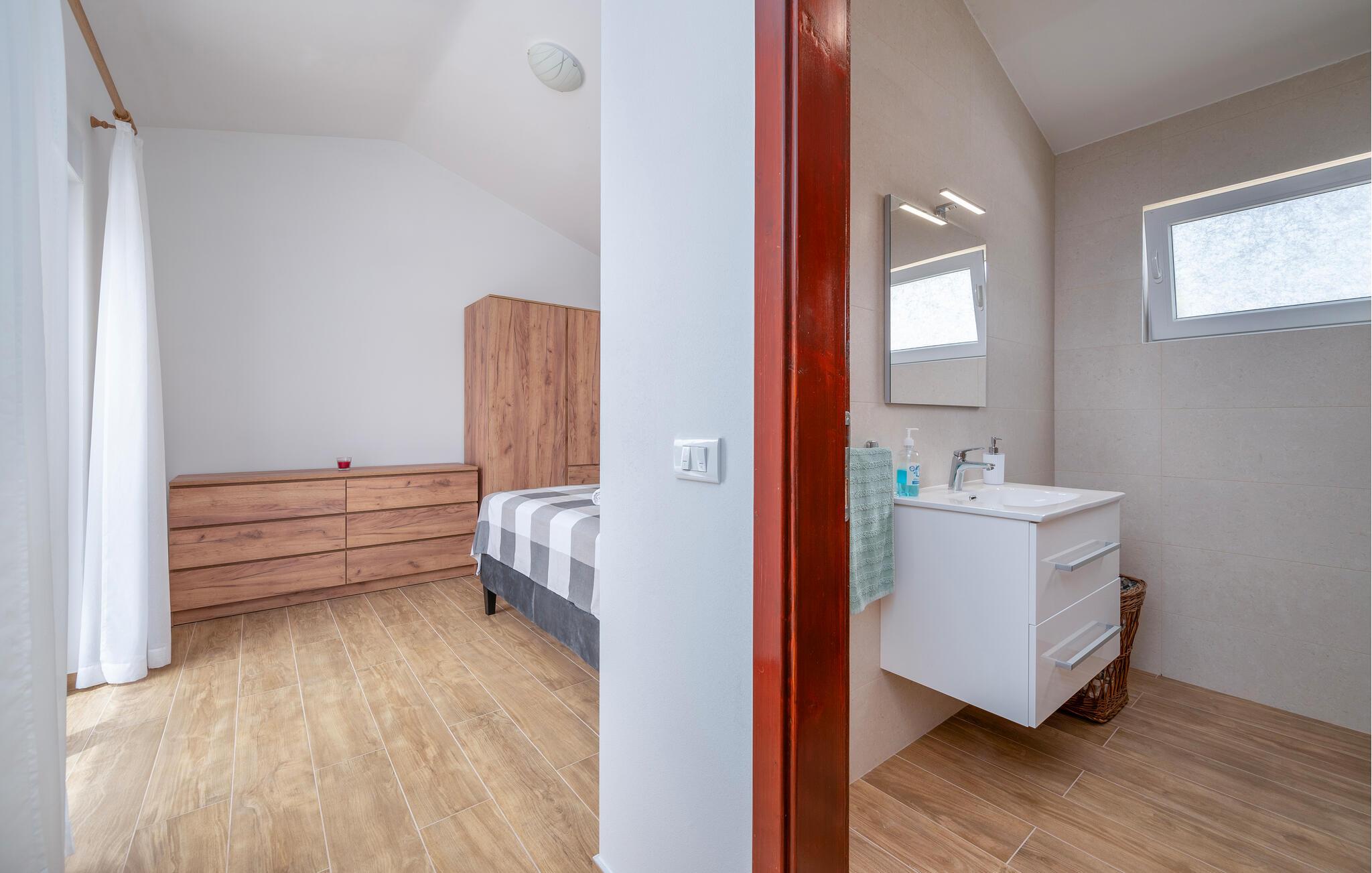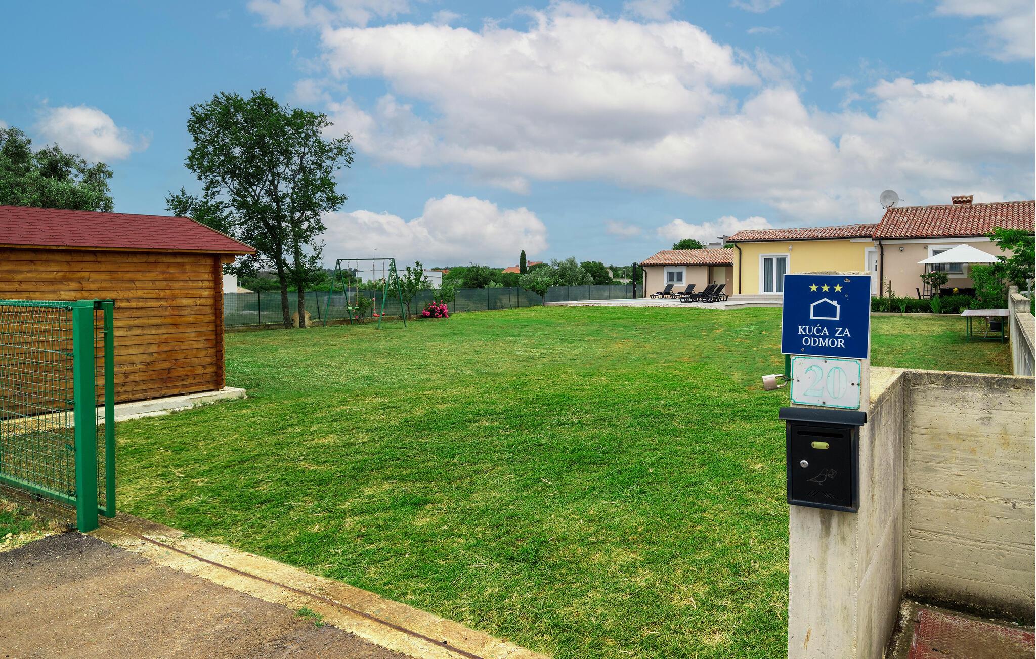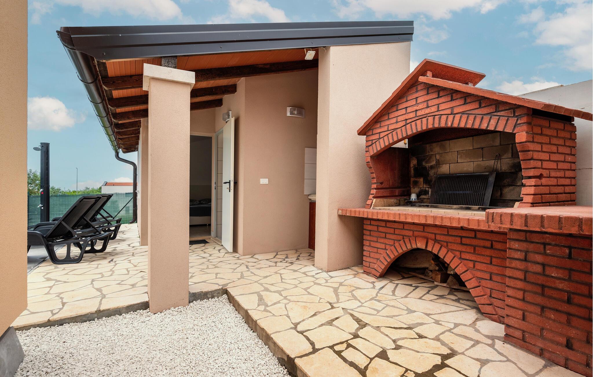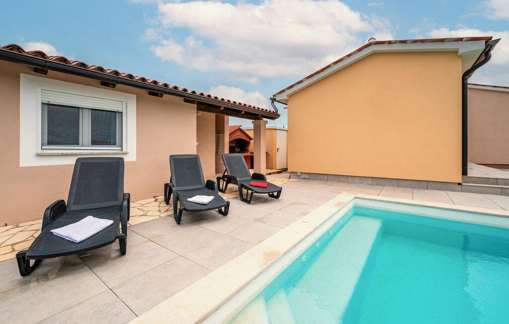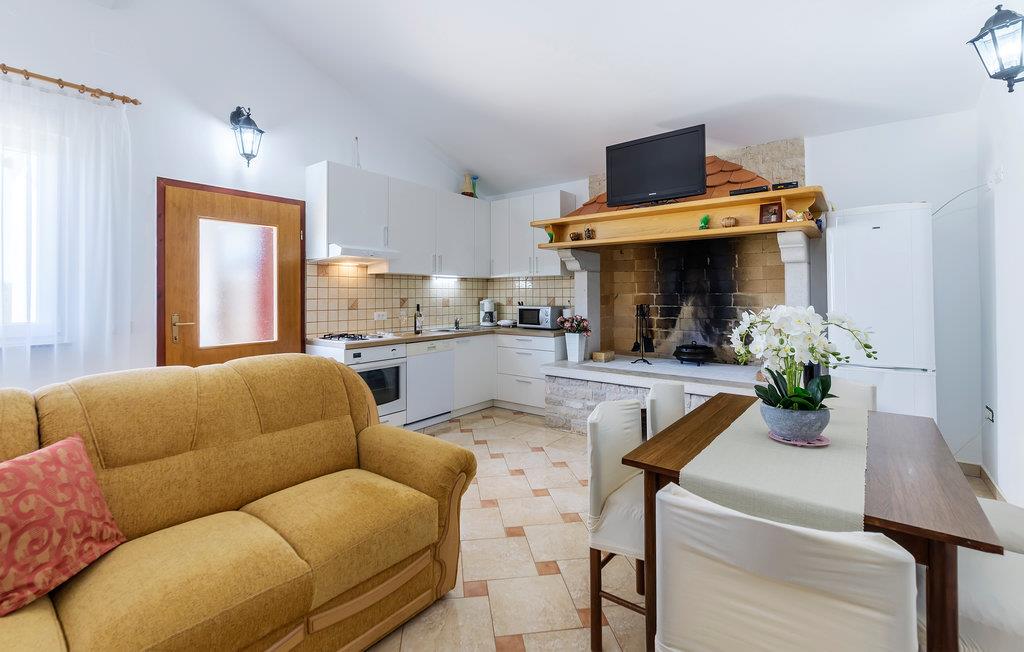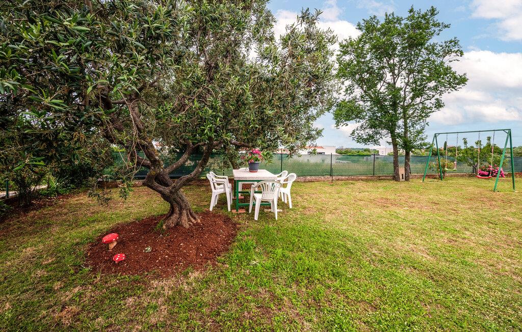 Dette feriehus venter jer på en stor grund i udkanten af ??Pula. Dobbelthuset tilbyder plads i 2 soveværelser, 2 badeværelser og en stue med køkken - ideelt til en lille familie med kæledyr.