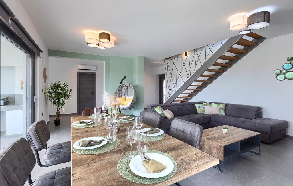 Flot og moderne villa med pool og udsigt til havet fra tagterrassen.