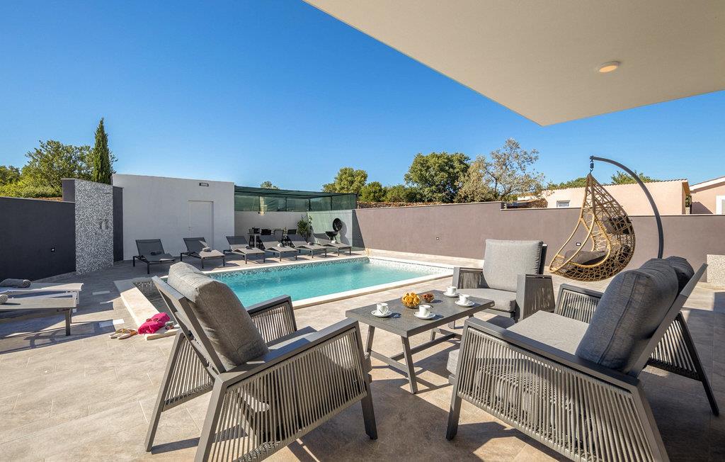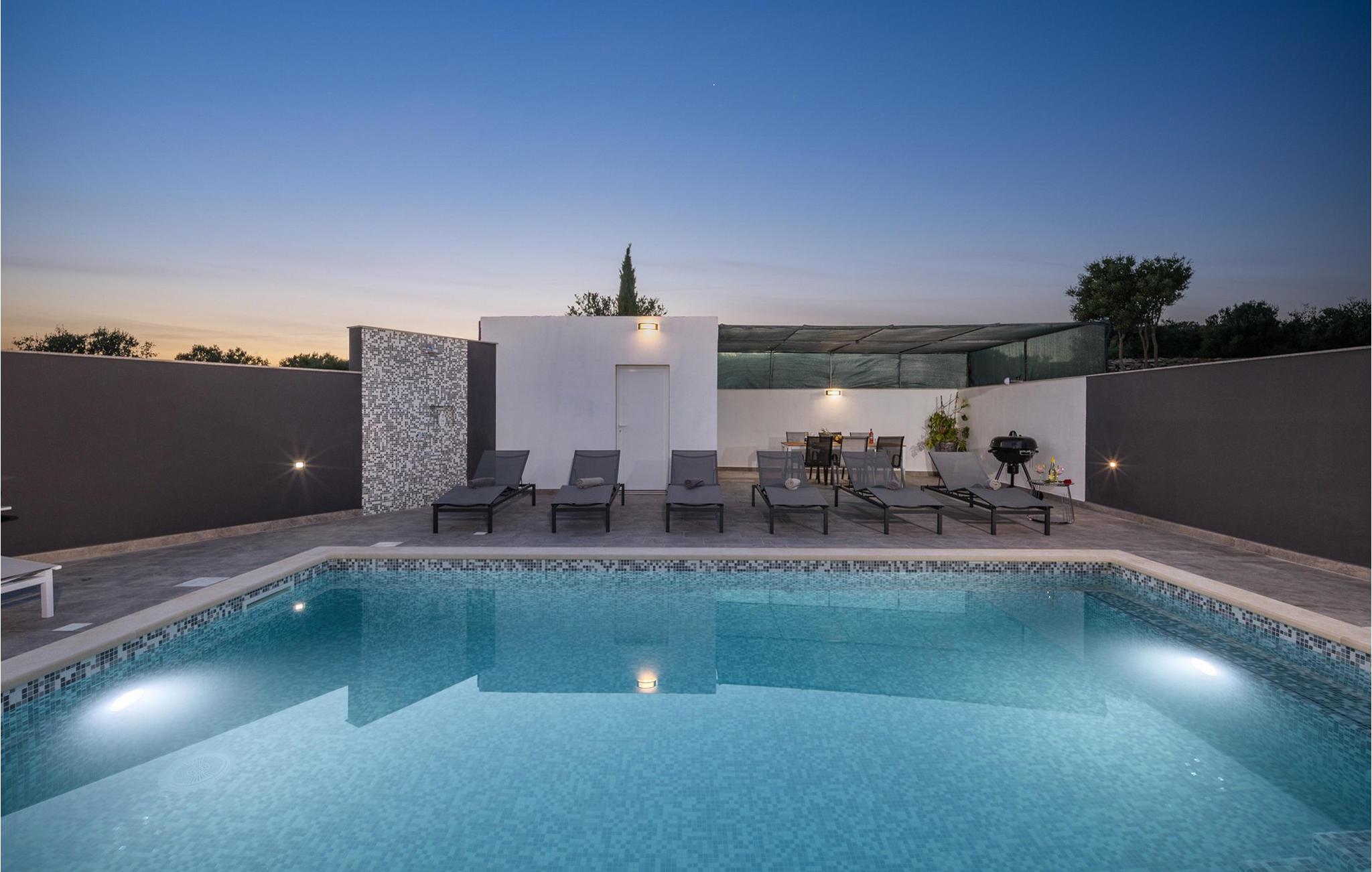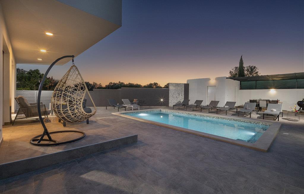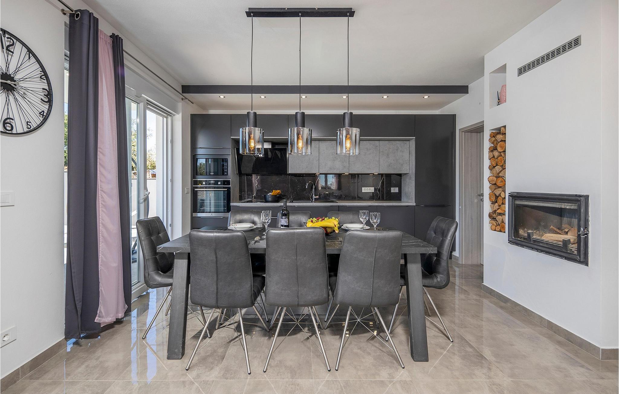 Smukke Villa Valentina Galižana ligger i Istrien, i en lille landsby Galižana, som ligger på den gamle vej, der forbinder Pula og Vodnjan. På de gamle romeres tid var dette sted ekstremt vigtigt som en landbrugsbebyggelse og er i dag kendetegnet ved sine cirkulære grundplaner med stenplader. Villa Valentina Galižana er moderne bygget, fuldt airconditioneret, med sit areal på 200 m2 kan den rumme maksimalt 8 gæster og er ideel til en afslappende ferie i selskab med venner eller familie. Med sit smukt dekorerede ydre tiltrækker det alle fans af moderne og moderne arkitektur. I stueetagen i denne villa finder du en stue med hjørnesofa, sofabord og TV, ved siden af er der udgang til udendørs terrasse. Nær stuen er der et moderne og fuldt udstyret køkken og en spisestue med bord til 8 gæster. Der er også et separat rum, hvor du kan bruge vaskemaskine, tørretumbler og strygejern. Et soveværelse er også i stueetagen, mens de resterende tre er på øverste etage. Alle værelser har eget bad, og selve villaen har 2 separate toiletter. Du kan svømme i fuldstændig privatliv i den 28m2 store pool omgivet af 8 liggestole. På terrassen er der et udendørs spisebord med en kul-/trægrill. For dem, der ønsker at holde en aktiv ferie, er der også et lokale med træningsudstyr. Der er 4 parkeringspladser til rådighed uden for gården. Placeringen af den moderne Villa Valentina Galižana vil give dig den tiltrængte hvile og vil helt sikkert forføre dig med sin enkelhed, elegance og følelsen af fred og ro. Du vil føle, at du er i dit eget paradis omgivet af uendelig middelhavsgrønt. Kun 5 km væk fra villaen ligger byen Pula, som er rig på interessant historie takket være Pulas arkitektur og fremmedsprog, især italiensk, som indbyggerne i Istrien taler på grund af nærheden til Italien. Der er to museer i Pula: Istriens arkæologiske museum og Istriens historiske museum. Byen er kendt for sine bevarede romerske bygninger såsom amfiteateret fra det 1. århundrede, også kaldet Arenaen, og Herkules-porten, det ældste overlevende monument for romersk arkitektur i Pula. Du vil bestemt ikke gå glip af indholdet og tage smukke billeder væk fra storslåede Istrien! Besøg Istrien, opdag dens skjulte skønheder, udforsk strandene og smag lækre traditionelle retter. Velkommen til Villa Valentina Galižana!