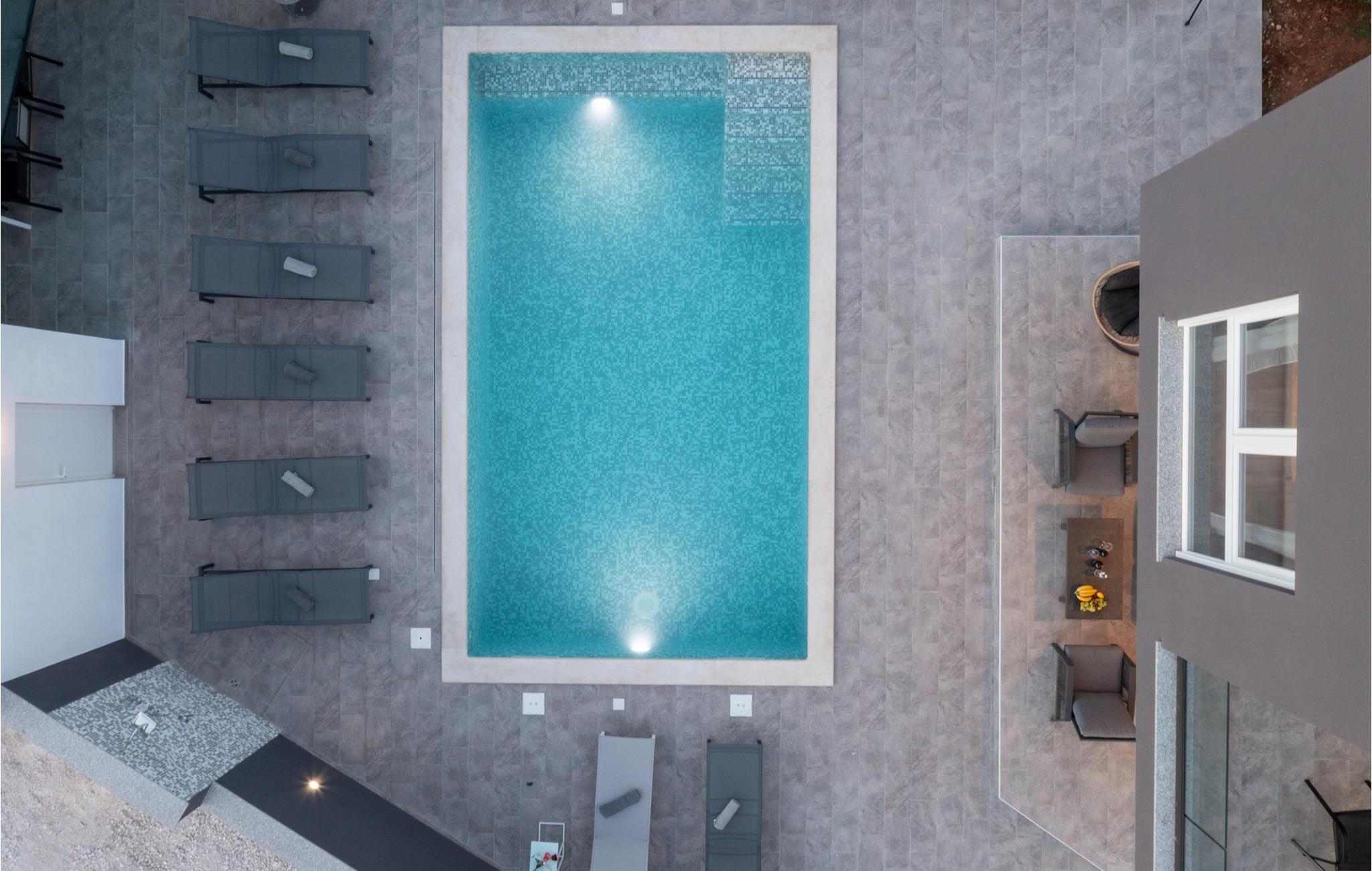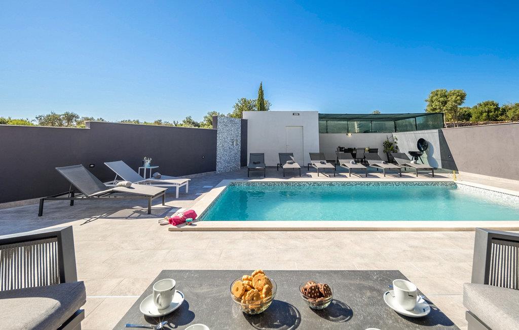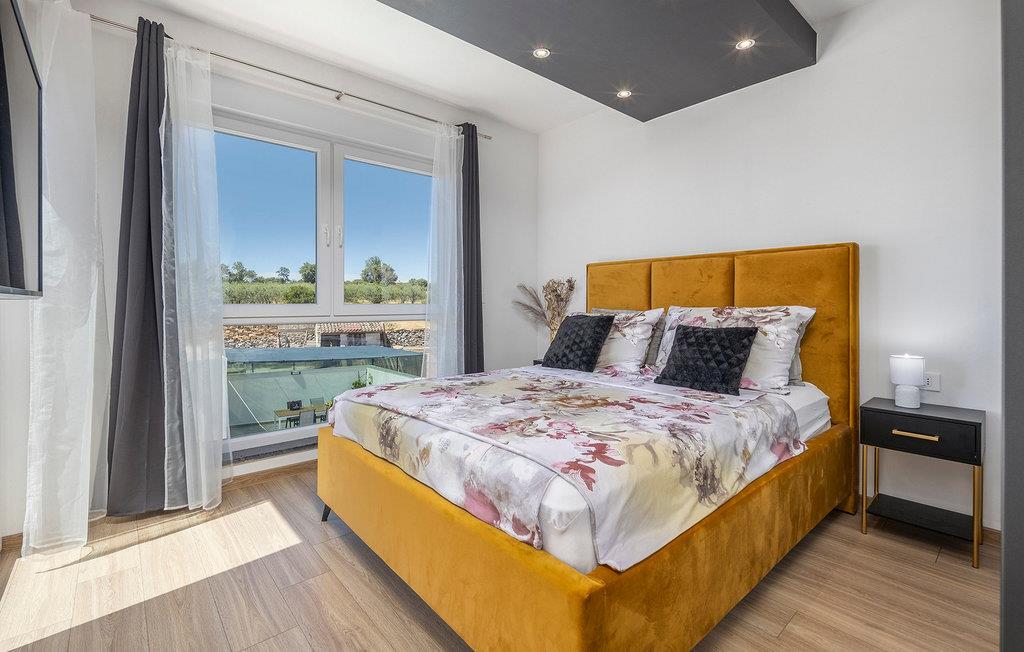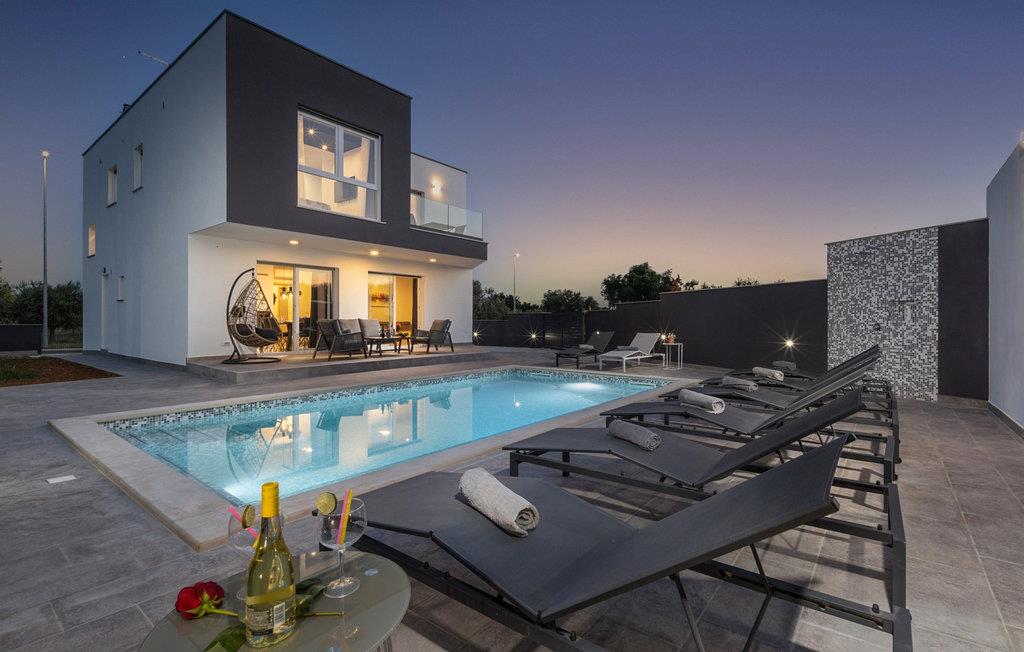 Smukke Villa Valentina Galižana ligger i Istrien, i en lille landsby Galižana, som ligger på den gamle vej, der forbinder Pula og Vodnjan. På de gamle romeres tid var dette sted ekstremt vigtigt som en landbrugsbebyggelse og er i dag kendetegnet ved sine cirkulære grundplaner med stenplader. Villa Valentina Galižana er moderne bygget, fuldt airconditioneret, med sit areal på 200 m2 kan den rumme maksimalt 8 gæster og er ideel til en afslappende ferie i selskab med venner eller familie. Med sit smukt dekorerede ydre tiltrækker det alle fans af moderne og moderne arkitektur. I stueetagen i denne villa finder du en stue med hjørnesofa, sofabord og TV, ved siden af er der udgang til udendørs terrasse. Nær stuen er der et moderne og fuldt udstyret køkken og en spisestue med bord til 8 gæster. Der er også et separat rum, hvor du kan bruge vaskemaskine, tørretumbler og strygejern. Et soveværelse er også i stueetagen, mens de resterende tre er på øverste etage. Alle værelser har eget bad, og selve villaen har 2 separate toiletter. Du kan svømme i fuldstændig privatliv i den 28m2 store pool omgivet af 8 liggestole. På terrassen er der et udendørs spisebord med en kul-/trægrill. For dem, der ønsker at holde en aktiv ferie, er der også et lokale med træningsudstyr. Der er 4 parkeringspladser til rådighed uden for gården. Placeringen af den moderne Villa Valentina Galižana vil give dig den tiltrængte hvile og vil helt sikkert forføre dig med sin enkelhed, elegance og følelsen af fred og ro. Du vil føle, at du er i dit eget paradis omgivet af uendelig middelhavsgrønt. Kun 5 km væk fra villaen ligger byen Pula, som er rig på interessant historie takket være Pulas arkitektur og fremmedsprog, især italiensk, som indbyggerne i Istrien taler på grund af nærheden til Italien. Der er to museer i Pula: Istriens arkæologiske museum og Istriens historiske museum. Byen er kendt for sine bevarede romerske bygninger såsom amfiteateret fra det 1. århundrede, også kaldet Arenaen, og Herkules-porten, det ældste overlevende monument for romersk arkitektur i Pula. Du vil bestemt ikke gå glip af indholdet og tage smukke billeder væk fra storslåede Istrien! Besøg Istrien, opdag dens skjulte skønheder, udforsk strandene og smag lækre traditionelle retter. Velkommen til Villa Valentina Galižana!