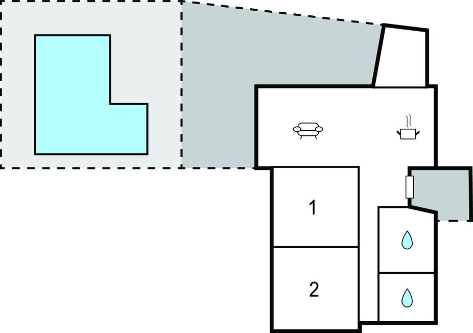 Den rummelige og luftige opholdsstue er forbundet med spisepladsen, og køkkenet har også direkte adgang til haven med pool. De to hyggelige dobbeltværelser er begge udstyret med AC og TV, så du kan slappe helt af under din ferie.