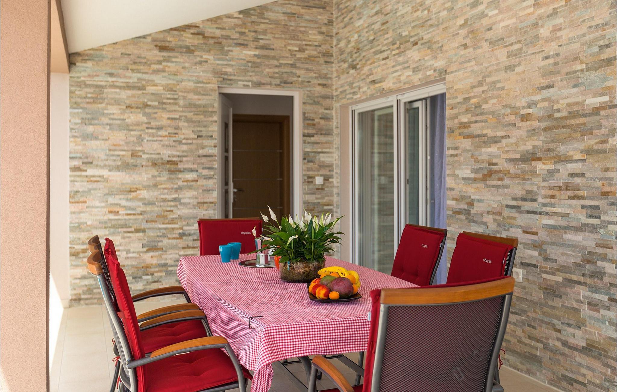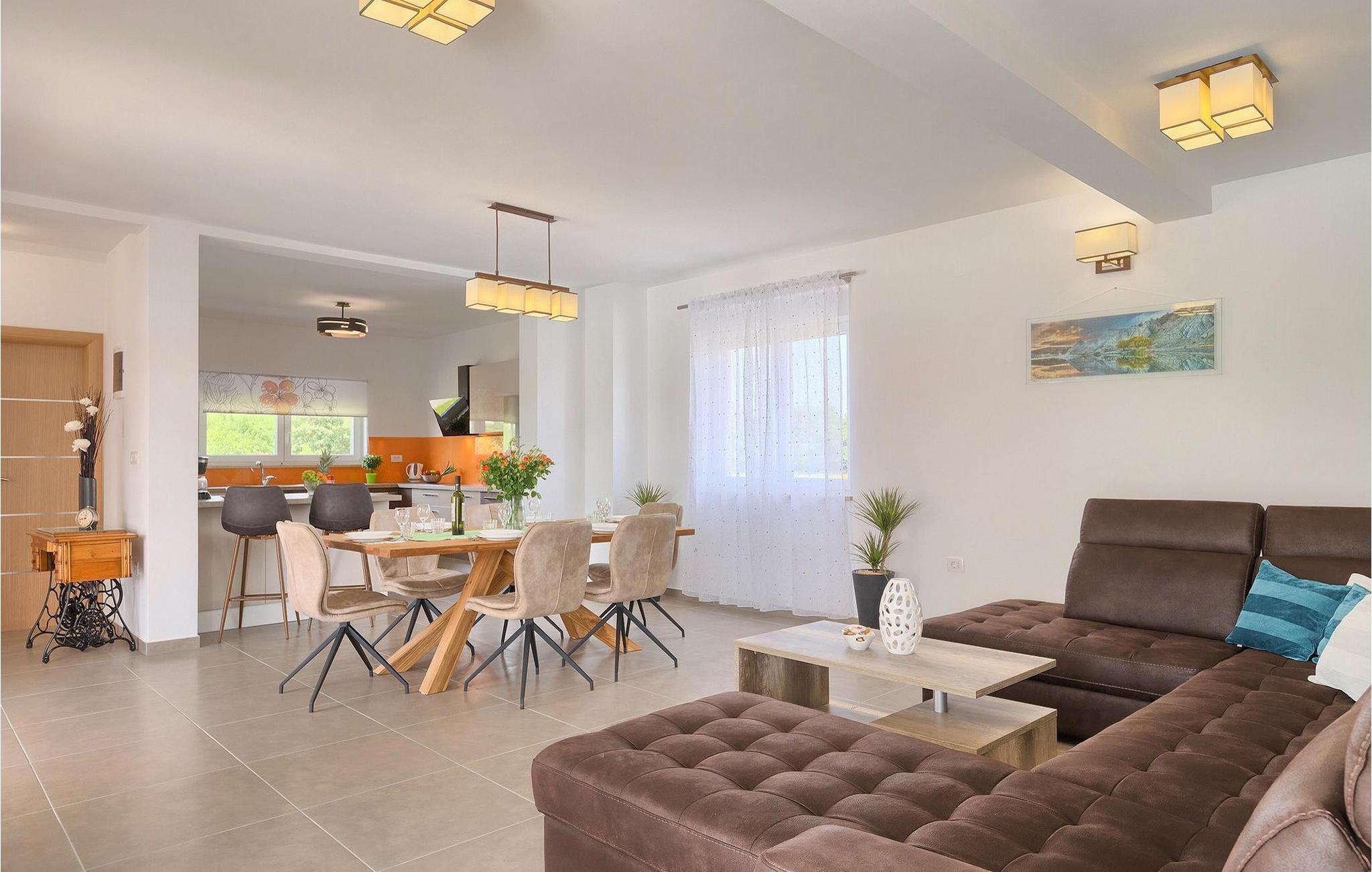 Villa Lena ist eine ideale Wahl für all diejenigen, die ihren Urlaub in einer natürlichen Umgebung ohne viele Nachbarn verbringen möchten, so dass sie sich richtig entspannen können. Die Villa bietet kann bis zu 6 + 2 Personen in 3 Schlafzimmern beherbergen. Das Interieur wurde mit sanften Naturfarben dekoriert, so dass Sie sich, sobald Sie die Villa betreten, wie zu Hause fühlen können. Das Erdgeschoss besteht aus einem offenen Wohnbereich mit komfortabler Eckgarnitur und TV, einem Essbereich und einer völlig ausgestatteten Küche mit Frühstücksbar. Ein Doppelzimmer und ein Badezimmer befinden sich ebenfalls auf dieser Etage. Die anderen beiden Schlafzimmer mit eigenem Bad sowie eine überdachte Terrasse befinden sich auf der ersten Etage. Die Terrasse bietet einen schönen Ort, von dem aus Sie die Aussicht auf die Umgebung genießen können.