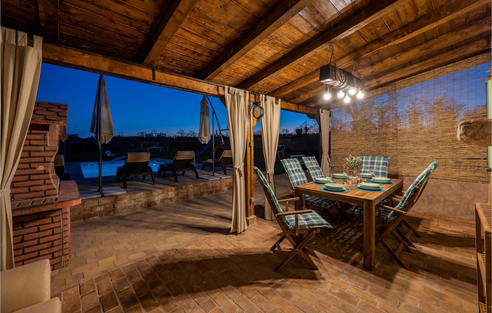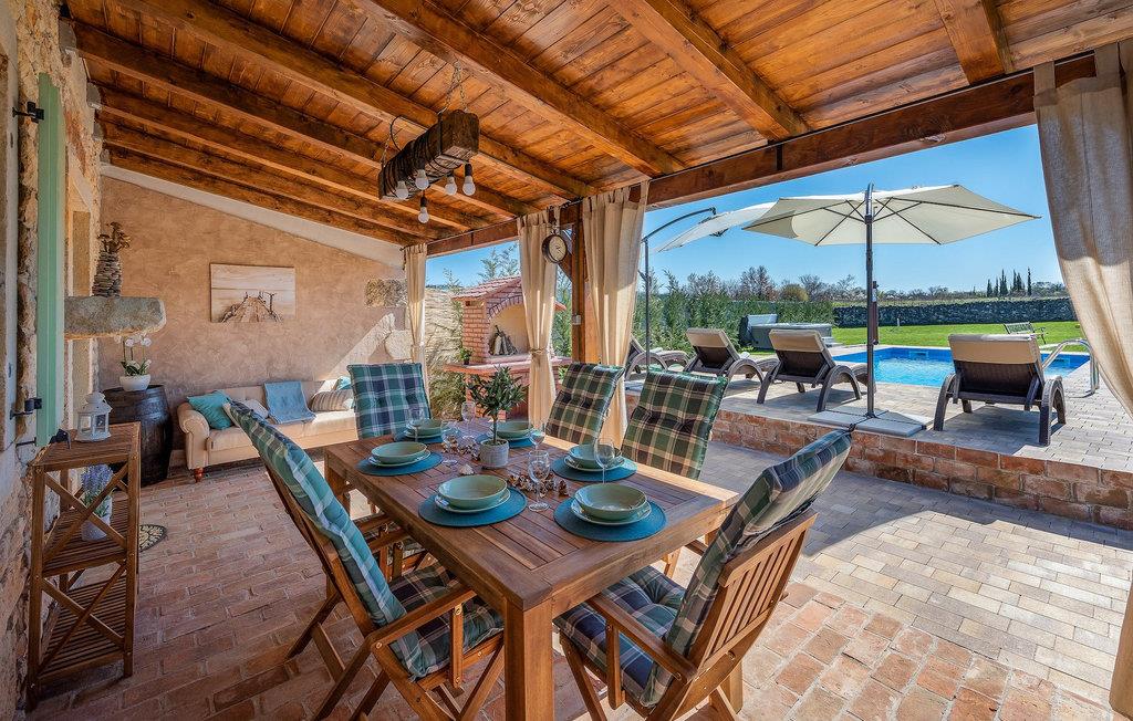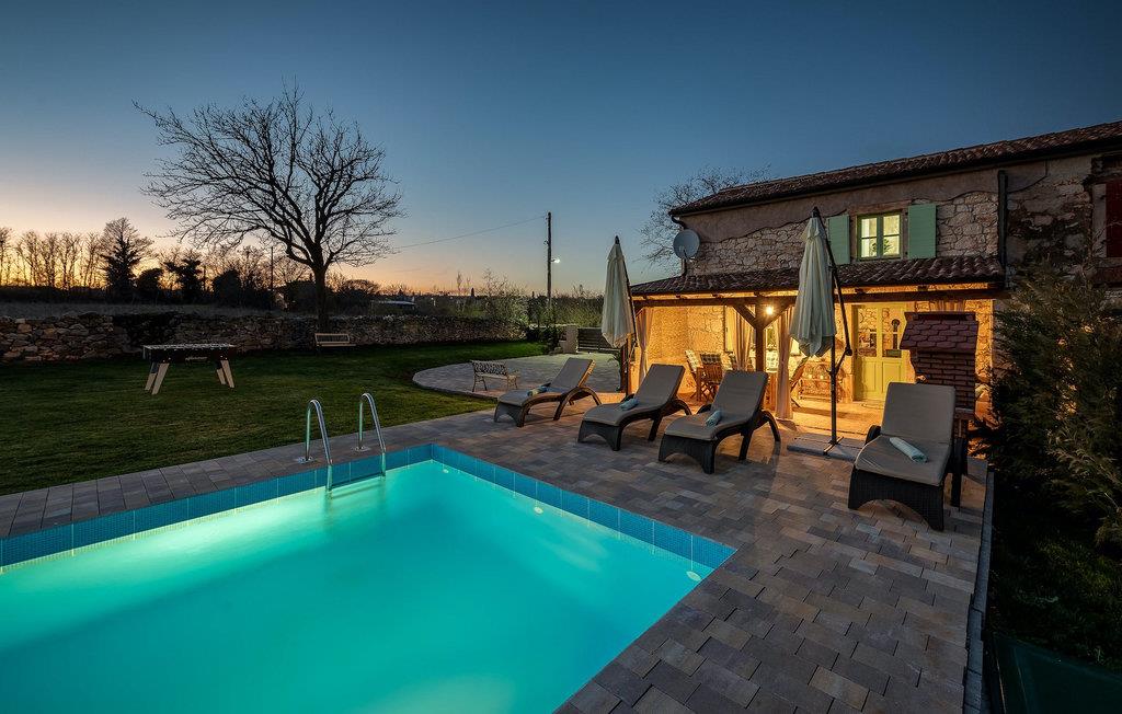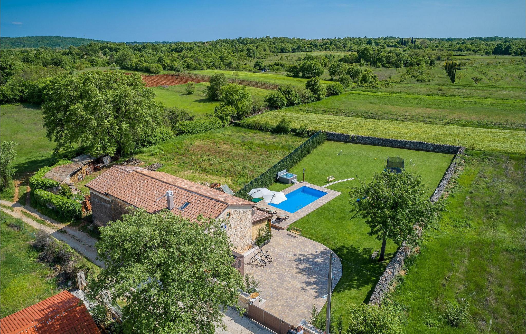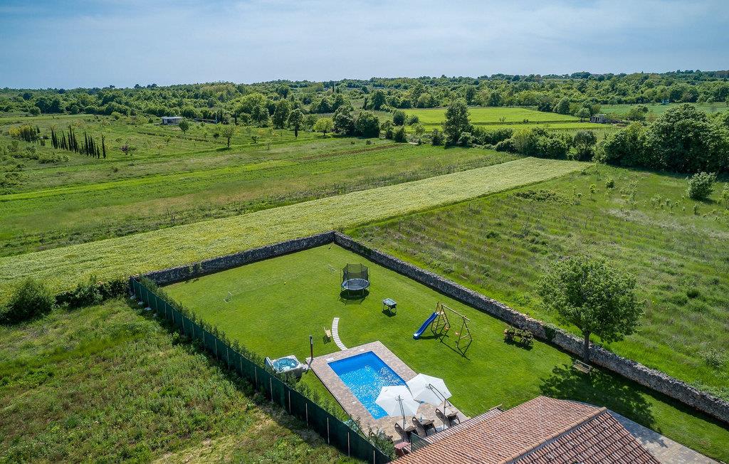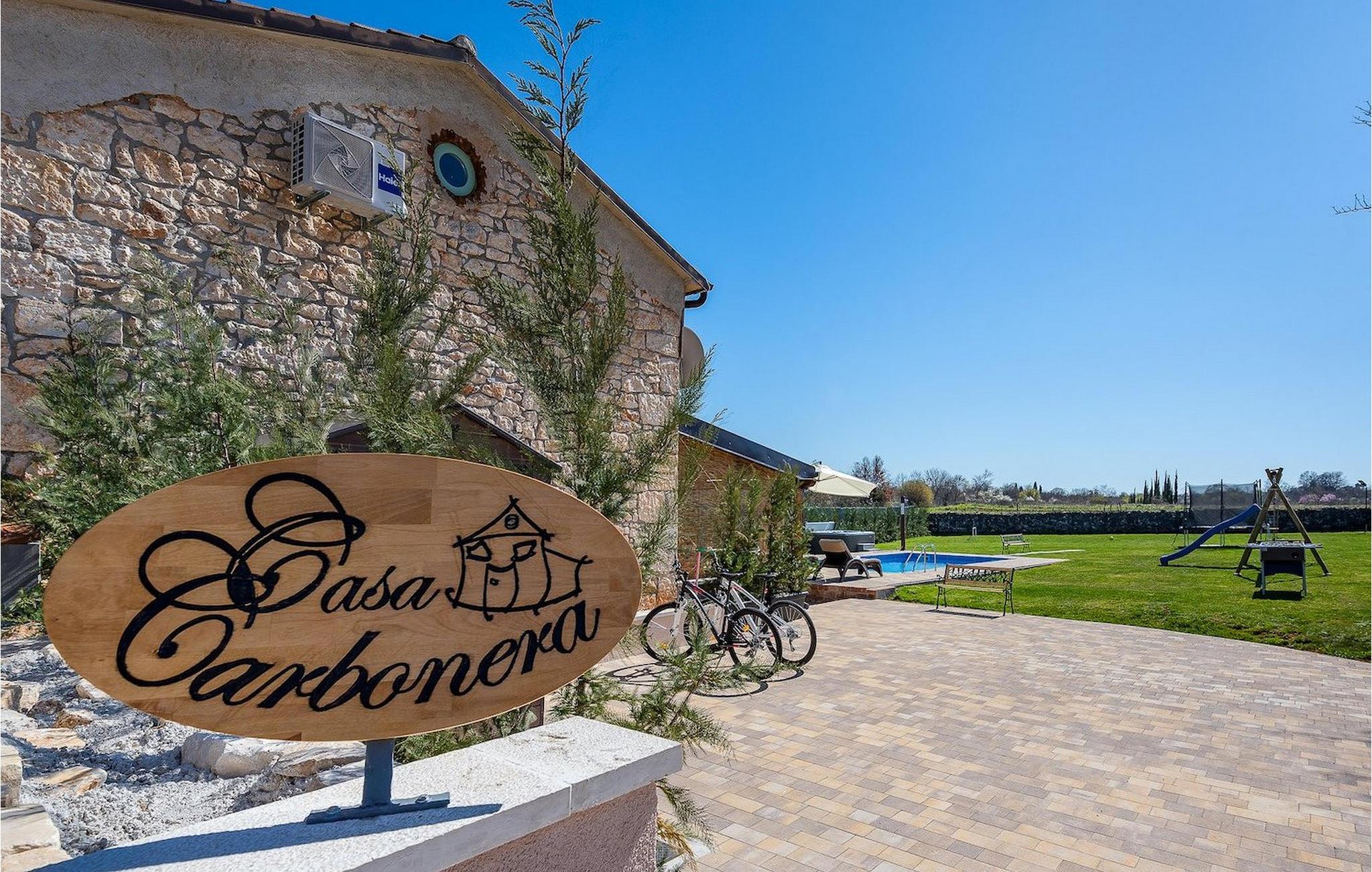 Das Interieur ist mit viel Liebe und Achtung zum Detail eingerichtet und ist in zwei Etagen aufgeteilt. Die zwei gemütliche Schlafzimmer mit Doppelbett und TV befinden sich im Obergeschoss, während Platz für zwei zusätzliche Personen auf dem Schlafsofa im Erdgeschoss ist. Die Küche ist völlig ausgestattet und das Wohnzimmer verfügt über SAT-TV und Stereoanlage. Diese Villa wird all diejenigen zufrieden stellen, die sich auf den Sonnenliegen am Pool oder im Whirlpool an kühlen Abenden entspannen möchten, als auch diejenigen, die gerne ein Fahrrad nehmen, um die Umgebung zu erkunden oder sich mit Tischfußball oder Darts herausfordern. Wenn Sie sich für einen Tag am Strand entscheiden, erwartet Sie nur 6 km von der Villa eine wunderschöne Bucht. Das nächste kleine Restaurant liegt 500 m von der Villa entfernt und eine größere Auswahl finden Sie ab 6 km von der Villa. Wenn Sie lieber zu Hause essen möchten, gibt es auf der herrlichen überdachten Terrasse einen Grill, Holzkohle und einen Essbereich mit Blick auf den schönen, geräumigen Garten mit Pool.Die Casa Carbonera befindet sich in der Nähe von Marcana. Marcana ist ein kleiner Ort und gleichnamige Gemeinde im südlichen Teil von Istrien, etwa 15 km nördlich von Pula, der größten Stadt Istriens. Die Villa befindet sich in ländlicher Lage und doch sind die Strände und Resorts entlang dieser Küstenlinie nur ein paar Kilometer entfernt. Der nächste Strand ist Duga Uvala (ca. 6 km). Der beliebte Ferienort Medulin und die wunderschönen Sehenswürdigkeiten und kulturellen Veranstaltungen von Pula sind auch nah und sind ideal für diejenigen, die Entertaining und Gastro- und Shoppingmöglichkeiten suchen.