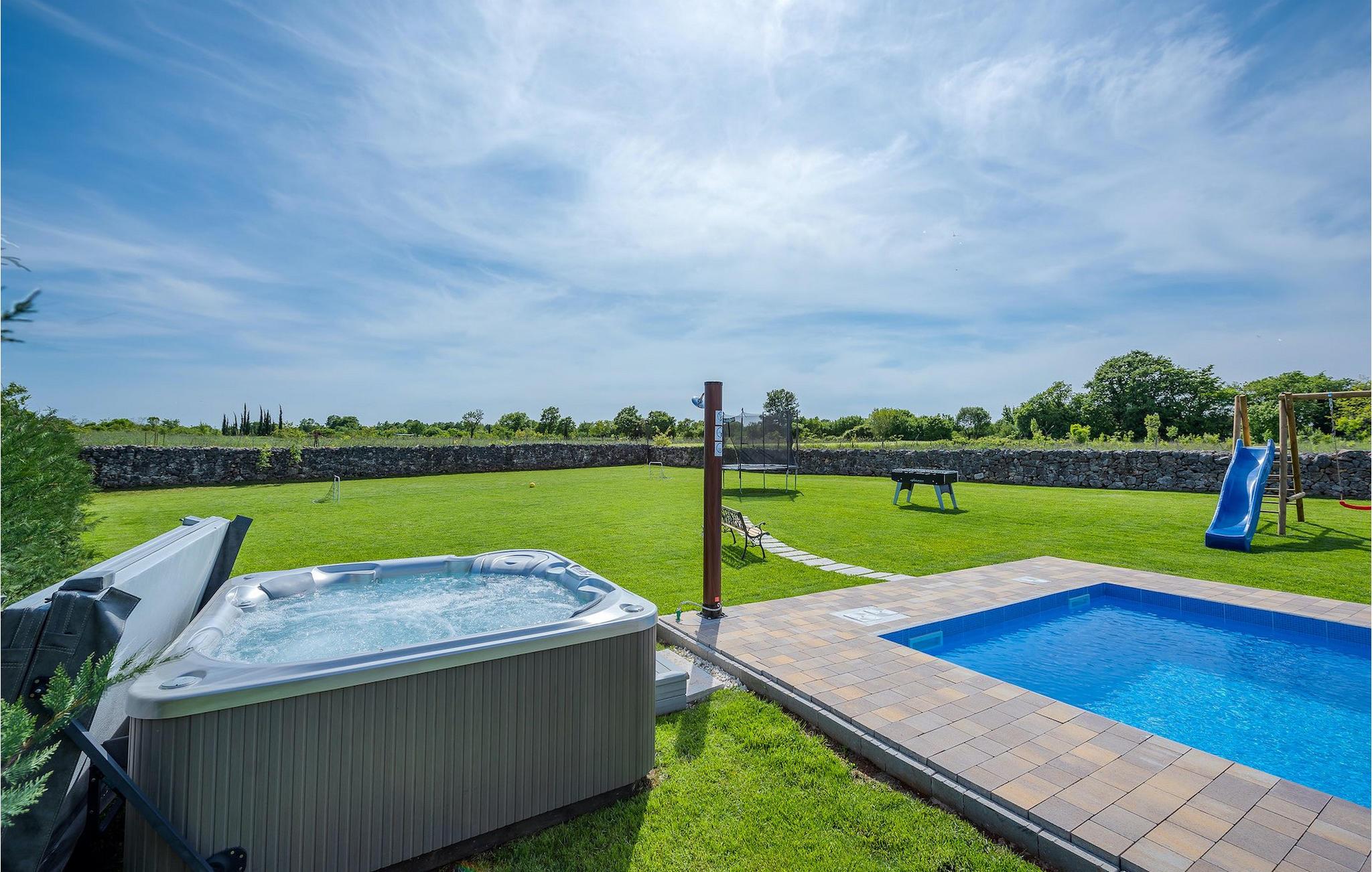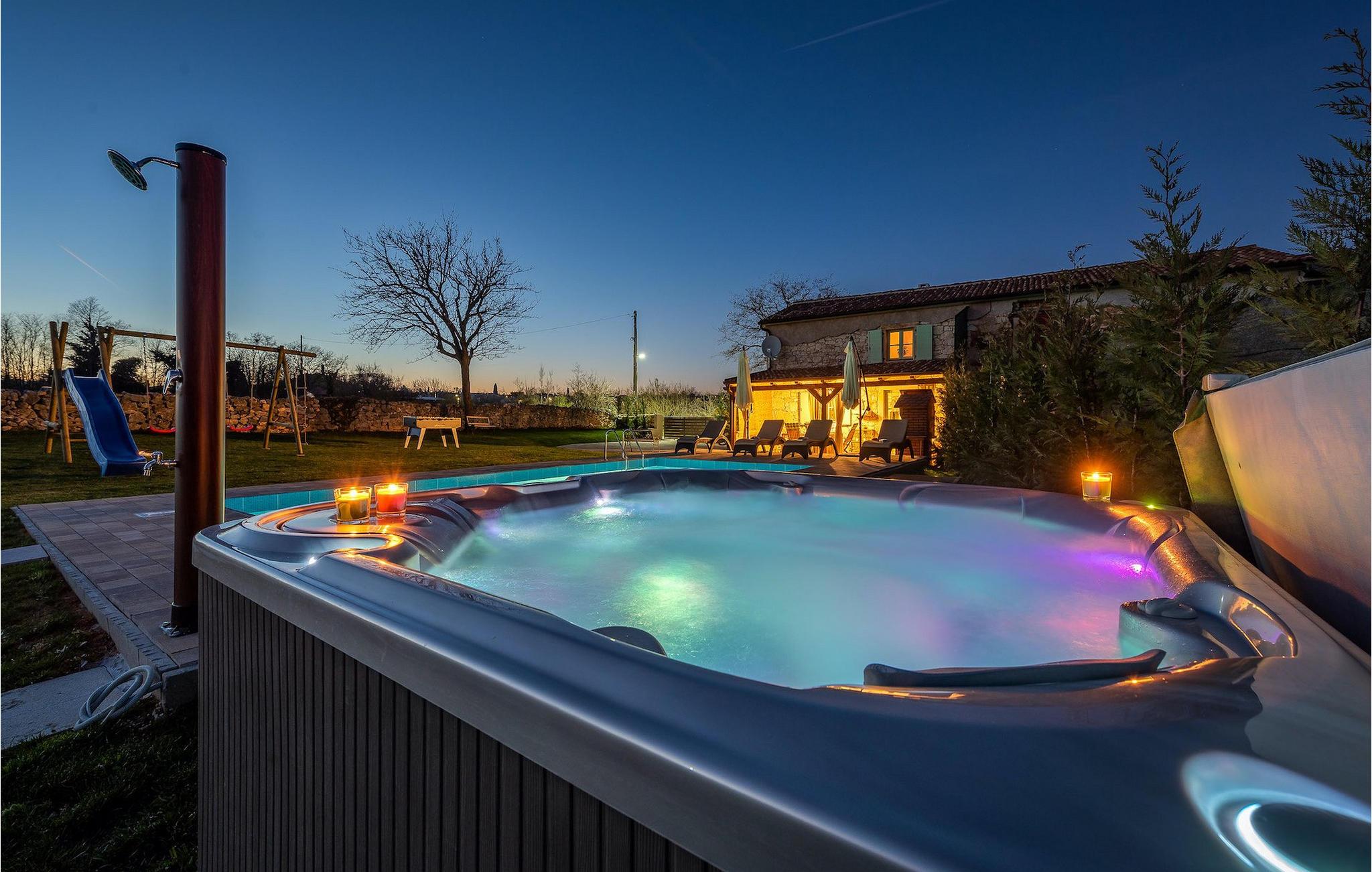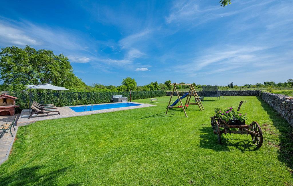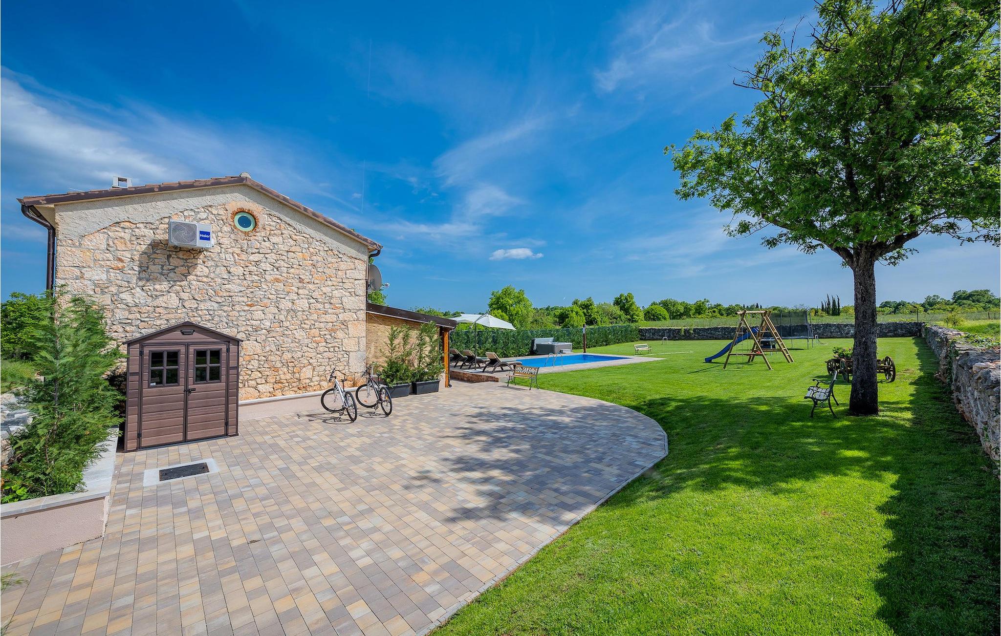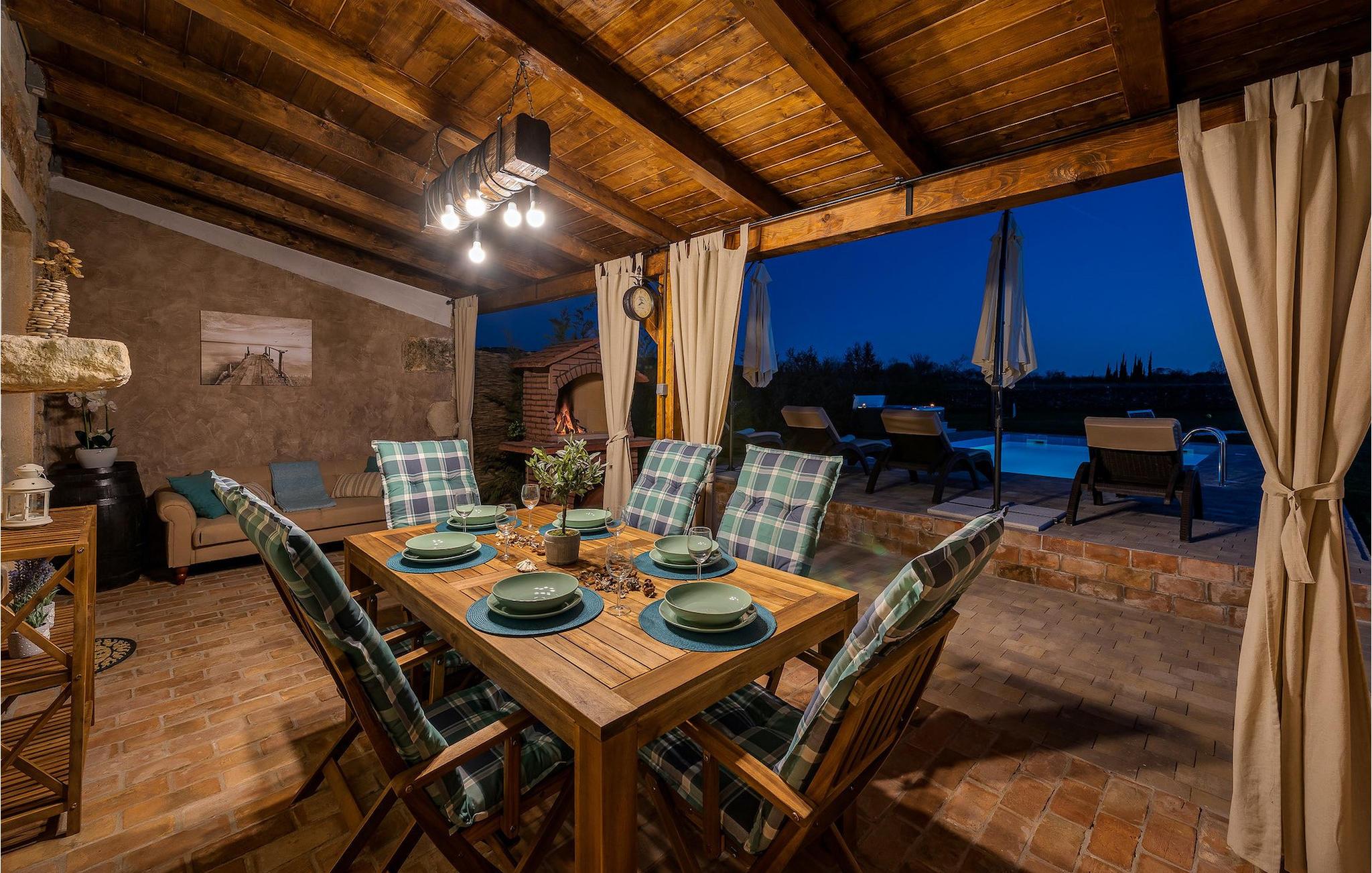 Das Interieur ist mit viel Liebe und Achtung zum Detail eingerichtet und ist in zwei Etagen aufgeteilt. Die zwei gemütliche Schlafzimmer mit Doppelbett und TV befinden sich im Obergeschoss, während Platz für zwei zusätzliche Personen auf dem Schlafsofa im Erdgeschoss ist. Die Küche ist völlig ausgestattet und das Wohnzimmer verfügt über SAT-TV und Stereoanlage. Diese Villa wird all diejenigen zufrieden stellen, die sich auf den Sonnenliegen am Pool oder im Whirlpool an kühlen Abenden entspannen möchten, als auch diejenigen, die gerne ein Fahrrad nehmen, um die Umgebung zu erkunden oder sich mit Tischfußball oder Darts herausfordern. Wenn Sie sich für einen Tag am Strand entscheiden, erwartet Sie nur 6 km von der Villa eine wunderschöne Bucht. Das nächste kleine Restaurant liegt 500 m von der Villa entfernt und eine größere Auswahl finden Sie ab 6 km von der Villa. Wenn Sie lieber zu Hause essen möchten, gibt es auf der herrlichen überdachten Terrasse einen Grill, Holzkohle und einen Essbereich mit Blick auf den schönen, geräumigen Garten mit Pool.Die Casa Carbonera befindet sich in der Nähe von Marcana. Marcana ist ein kleiner Ort und gleichnamige Gemeinde im südlichen Teil von Istrien, etwa 15 km nördlich von Pula, der größten Stadt Istriens. Die Villa befindet sich in ländlicher Lage und doch sind die Strände und Resorts entlang dieser Küstenlinie nur ein paar Kilometer entfernt. Der nächste Strand ist Duga Uvala (ca. 6 km). Der beliebte Ferienort Medulin und die wunderschönen Sehenswürdigkeiten und kulturellen Veranstaltungen von Pula sind auch nah und sind ideal für diejenigen, die Entertaining und Gastro- und Shoppingmöglichkeiten suchen.