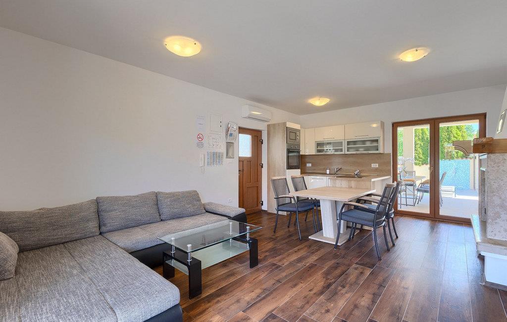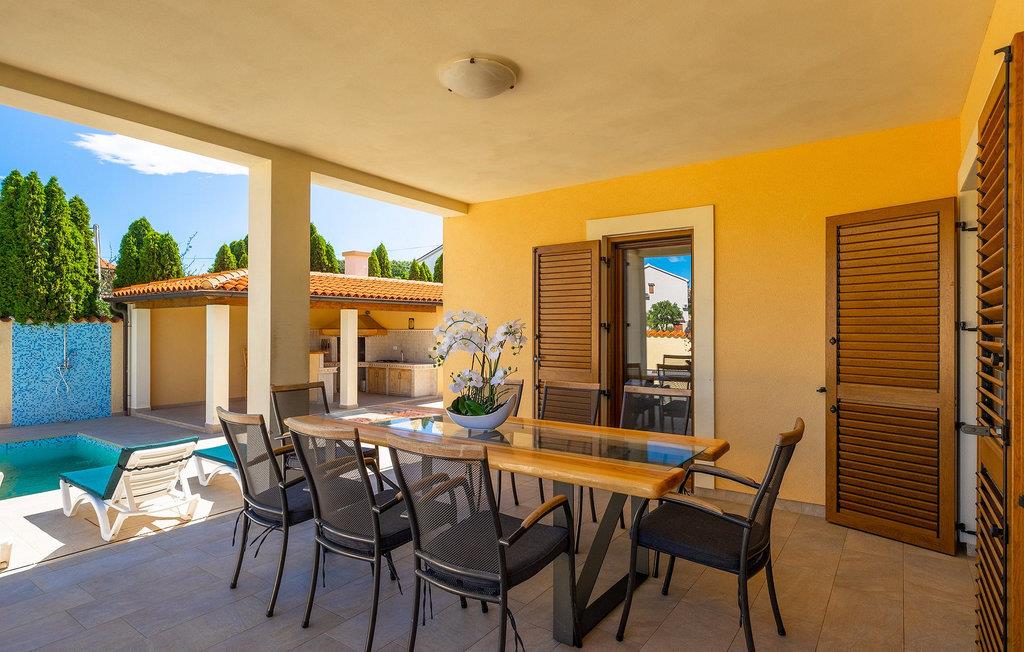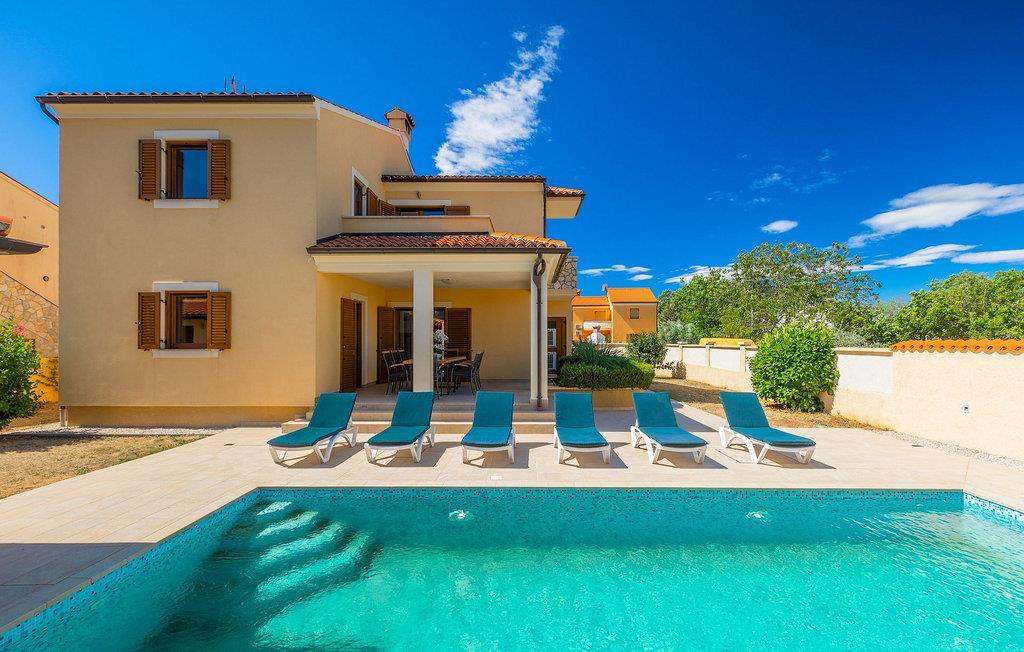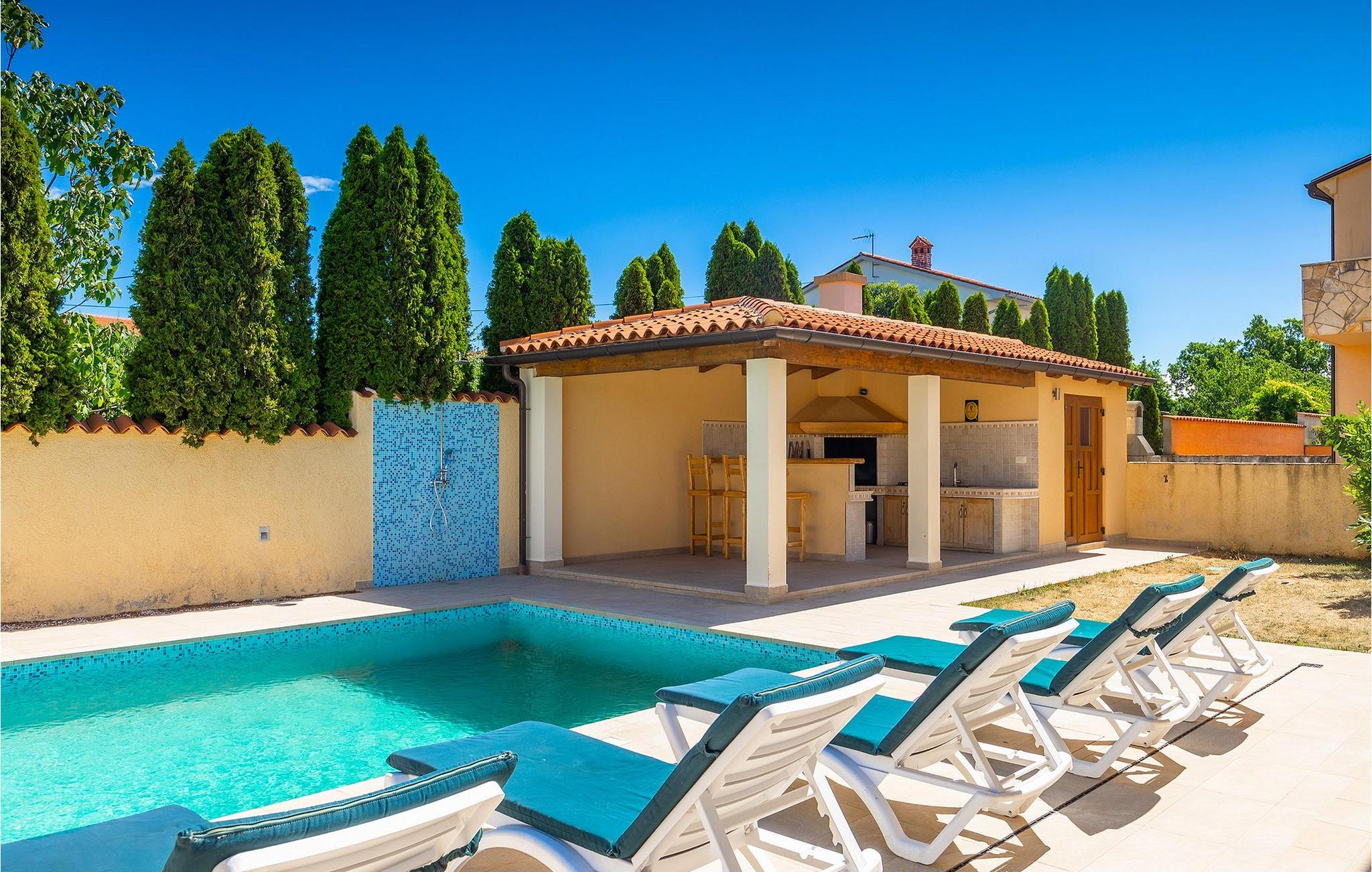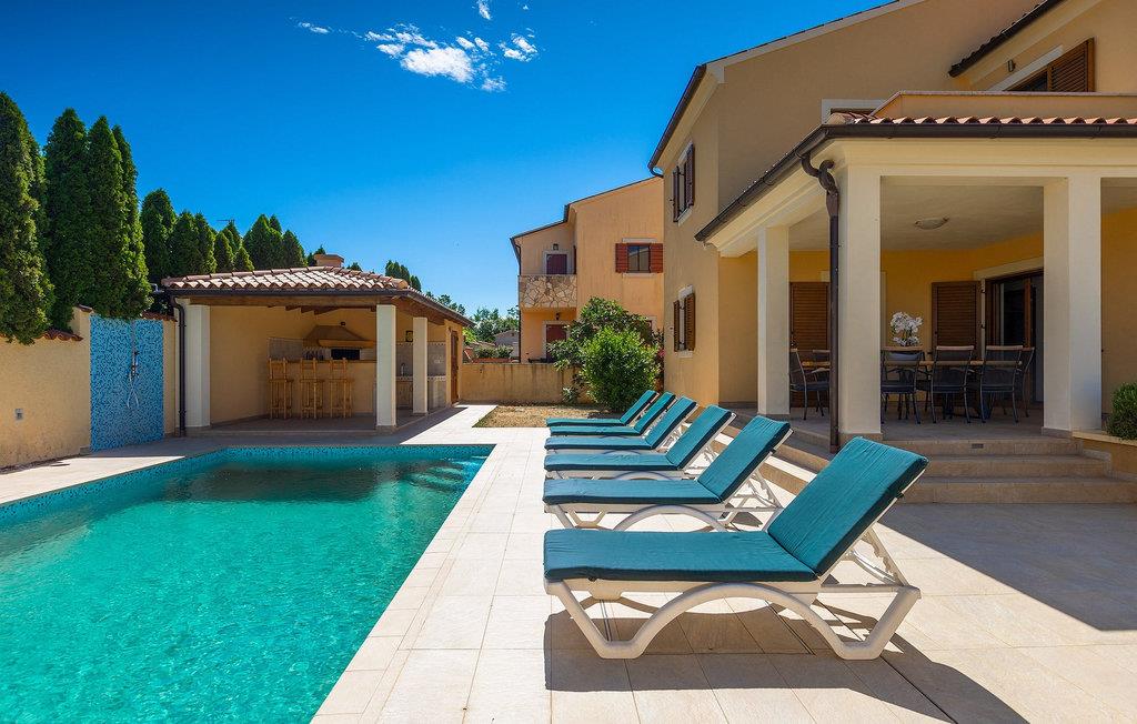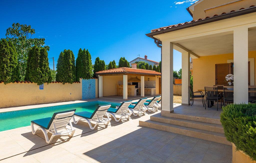 Vores Villa Marse - beliggende på østkysten af ??Istrien - er ideel til at tilbringe en fantastisk sommerferie med familie og venner. Villaen består af 2 separate enheder og kan rumme op til 12 gæster i 6 soveværelser i alt, men vi er sikre på, at I vil tilbringe det meste af jeres ferie sammen i villaens smukke udendørs område. Mens nogle hygger sig i poolen, slapper andre af og solbader på de komfortable liggestole ved poolen. I det overdækkede sommerkøkken med barstole tilberedes de lækreste specialiteter på grillen og nydes forfriskende drinks. Den overdækkede terrasse med spisebord er perfekt til at planlægge ture til regionen over morgenmad.