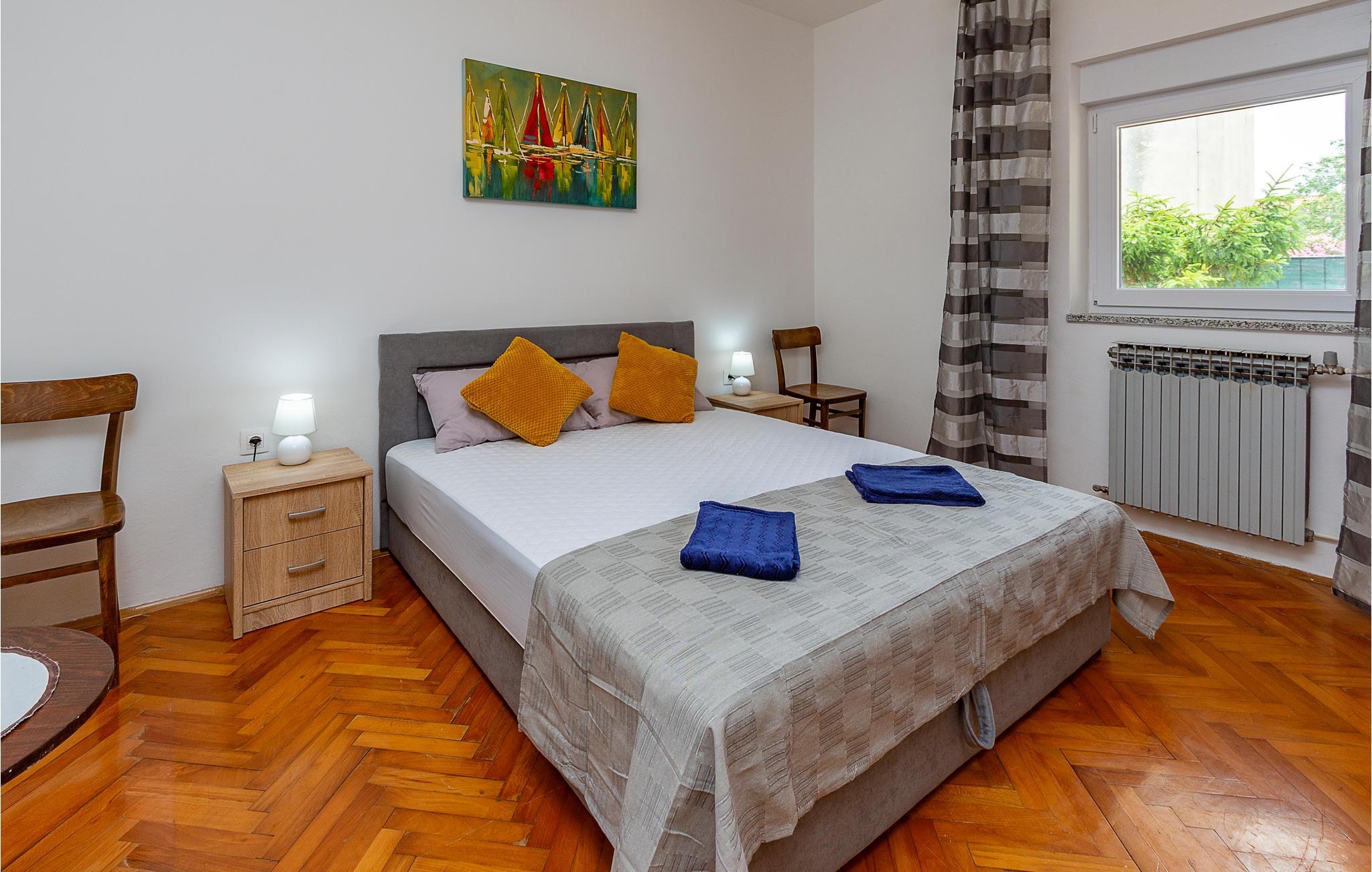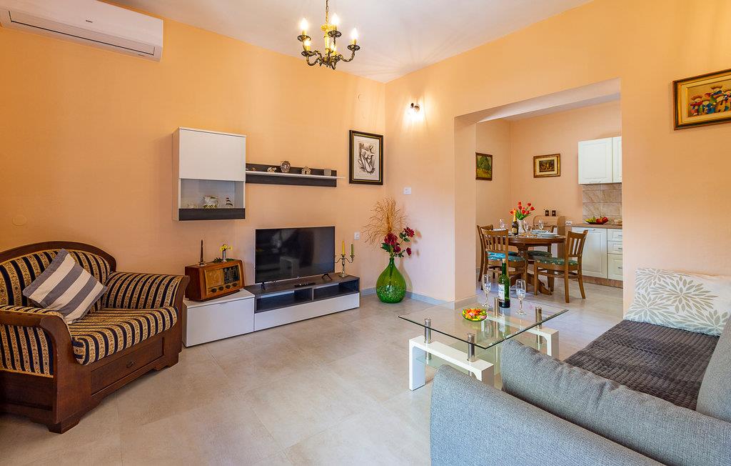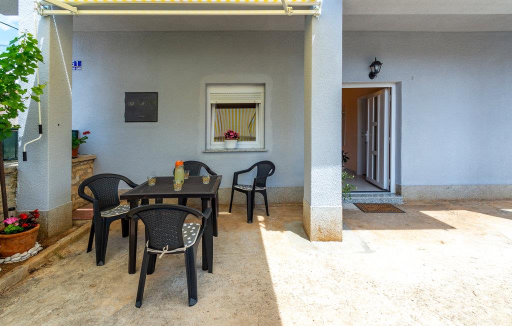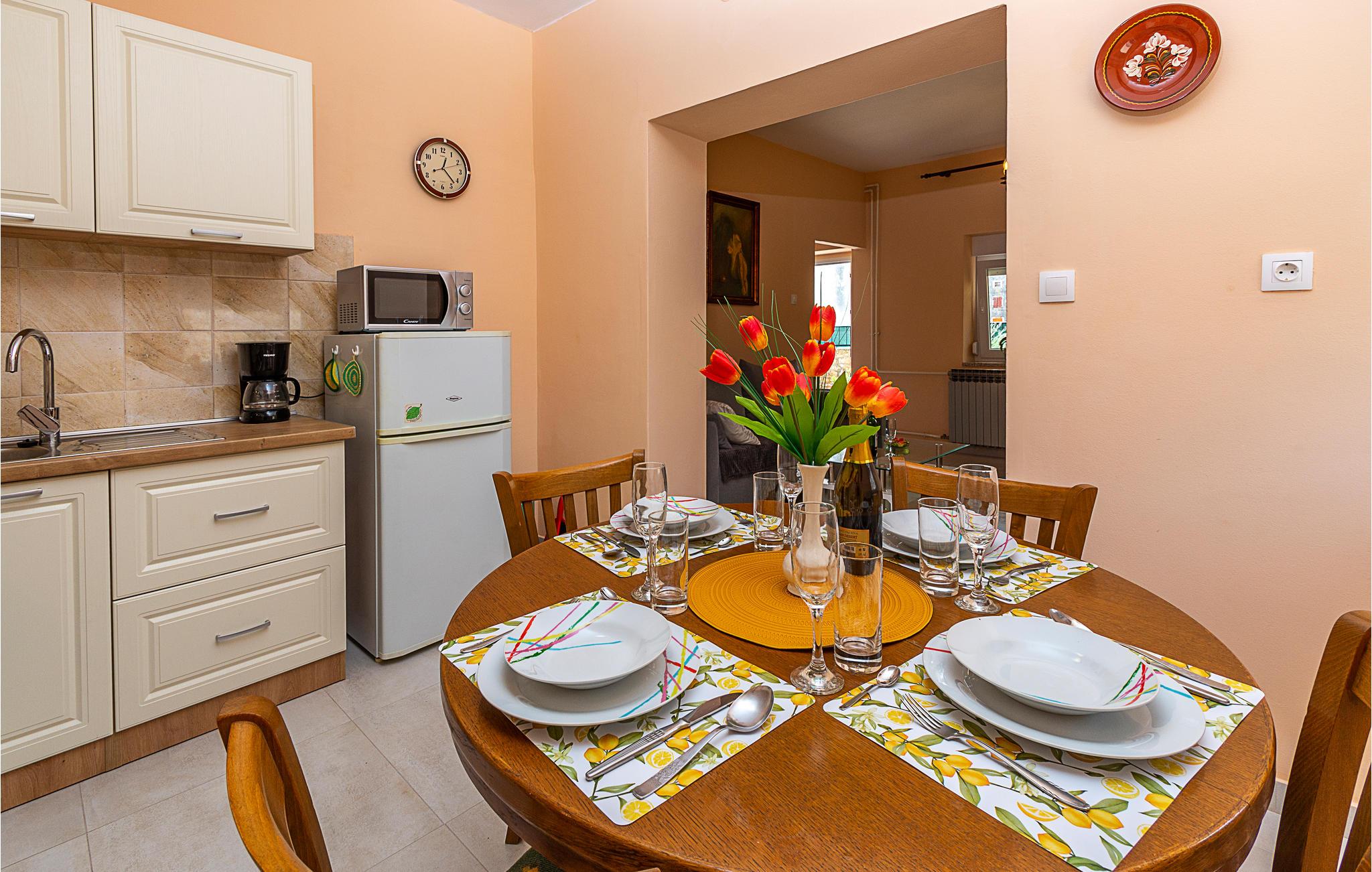 Denne lejlighed er indrettet i en blanding af klassisk kroatisk stil og moderne møbler. Udendørs er der en delvist overdækket, lukket terrasse med markise, hvor I kan slappe af i skyggen og nyde dagens måltider.