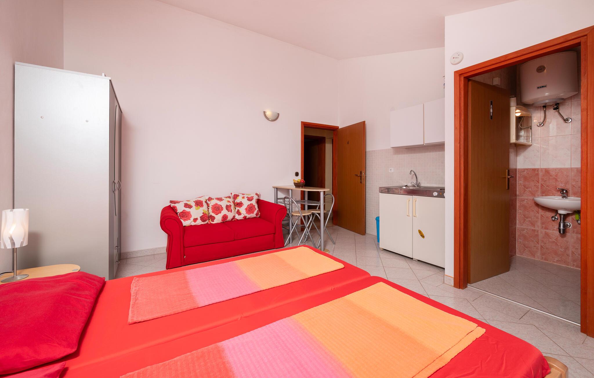 Denne lejlighed giver jer en komfortabel base, som er funktionelt og smagfuldt indrettet. Her har I alt, hvad I skal bruge til nogle fantastiske dage i Kroatien. I har også adgang til en overdækket altan, hvor I kan spise morgenmad og sidde i solen, mens I nyder udsigten til havet og Brijuni-øerne. Der er en ekstra terrasse, som er åben og deles med gæsterne i lejlighed CIP631, -32, -34 og 35. Her finder I også en udendørspool, en grill samt gynger og en vippe til børnene.