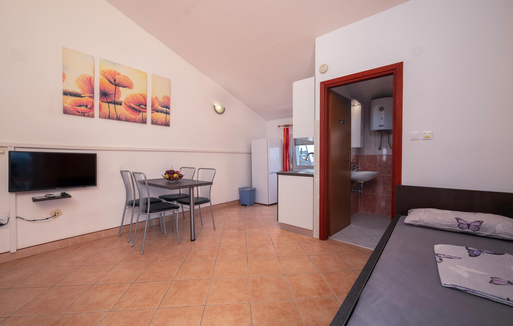 Denne lejlighed giver jer en komfortabel base, som er funktionelt og smagfuldt indrettet. Her har I alt, hvad I skal bruge til nogle fantastiske dage i Kroatien. I har også adgang til en overdækket altan, hvor I kan spise morgenmad og sidde i solen, mens I nyder udsigten til havet og Brijuni-øerne. Der er en ekstra terrasse, som er åben og deles med gæsterne i lejlighed CIP631, -32, -33 og 34. Her finder I også en udendørspool, en grill samt gynger og en vippe til børnene.