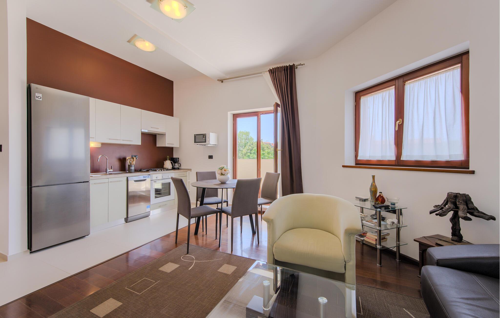 Denne indbydende lejlighed giver jer de optimale betingelser for en afslappende ferie. Nyd et uforglemmeligt ophold i de lyse værelser: Tilbered lækre måltider med familien i det moderne køkken, inden I sætter jer ved spisebordet. Find jer til rette i sofaen og tag jer tid til at nyde en god bog, lytte til jeres yndlingspodcast eller bare nippe til en friskbrygget kop kaffe.