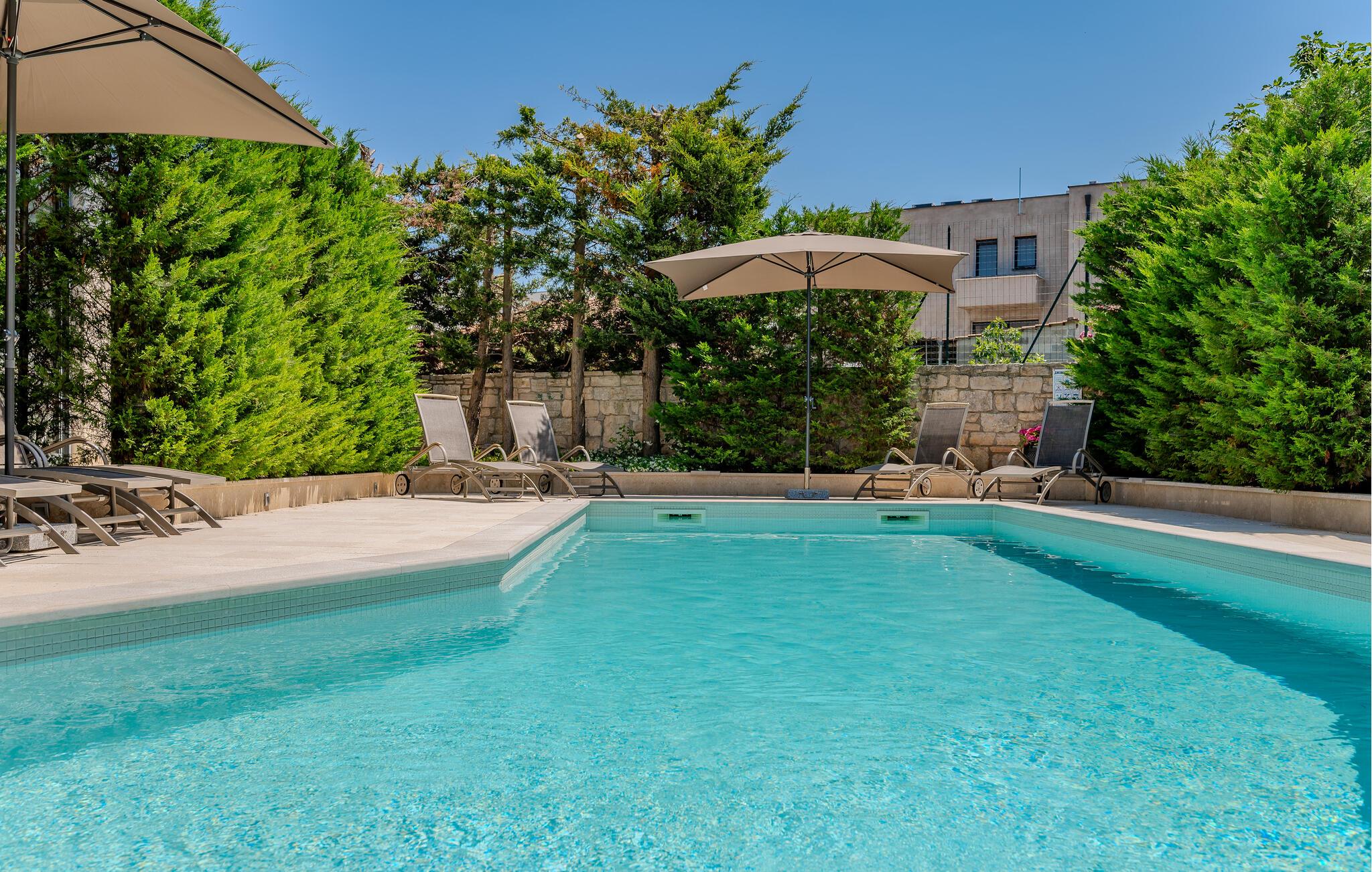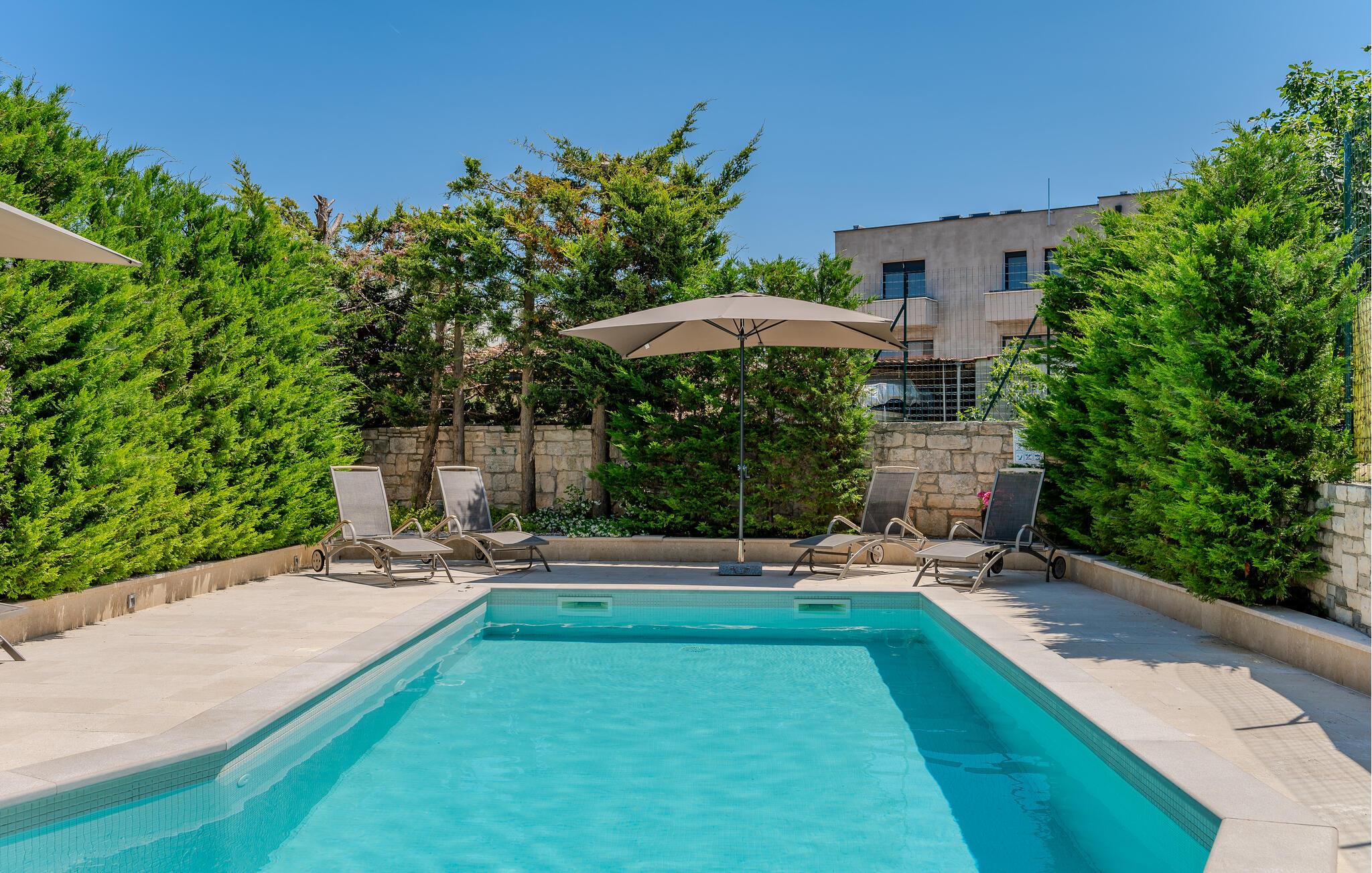 Sæt hverdagen på pause og Nyd nogle afslappende dage i denne moderne ferielejlighed med adgang til pool.
