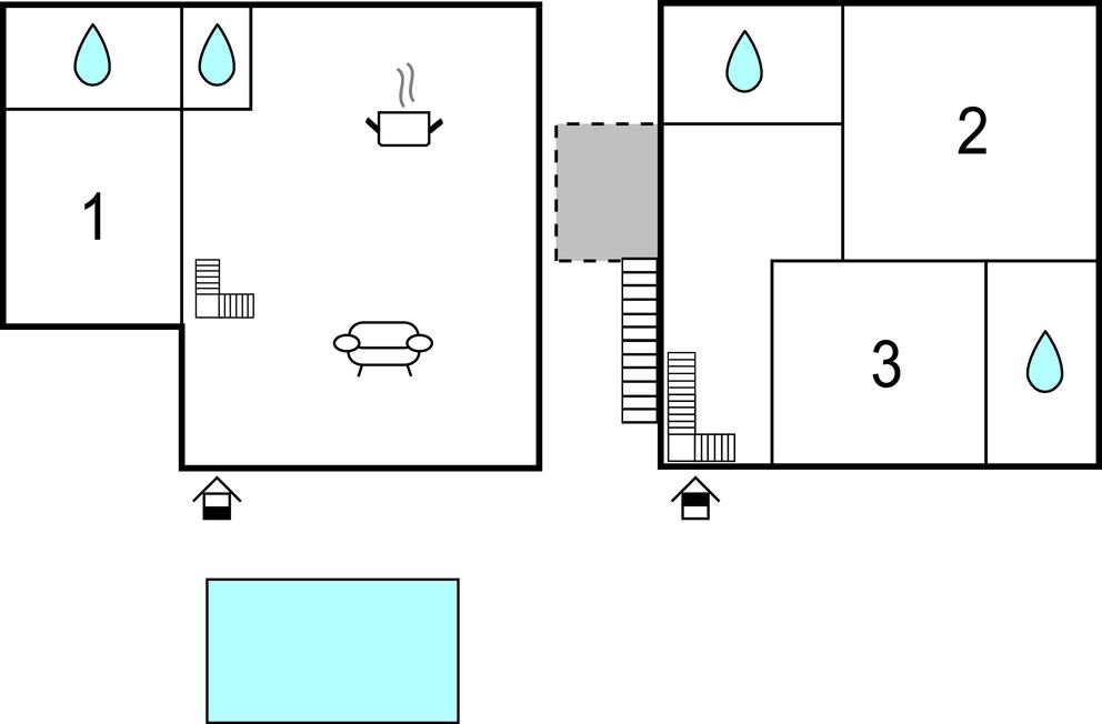Villaen strækker sig over stueetagen med køkken, stue, spisestue, soveværelse, badeværelse, toilet og på første sal to soveværelser, to badeværelser og en overdækket terrasse. Gulvene er forbundet med indvendige trapper. Den store pool tilbyder forfriskning, mens børnene kan lege uforstyrret på gynger og rutschebaner i haven.