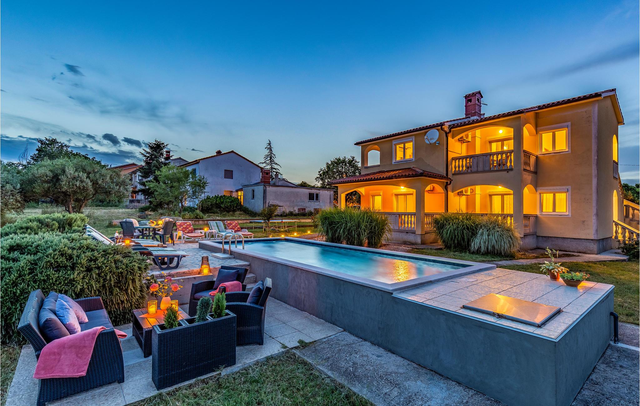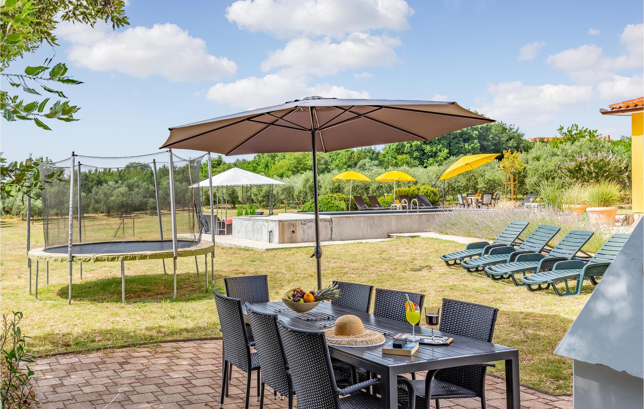 Dette dejlige feriehus består af tre boliger, som er forbundet af en udetrappe. Alle boligenenhederne er med klimaanlæg og fuldt udstyrede køkkener. Huset er velegnet til 3 familier eller en gruppe venner som ønsker at holde ferie sammen, men stadig nyde deres privatliv i deres værelser. Der er flere terrasser tilrådighed til gæsterne. På grunden er der swimmingpool, i hvis kant er mange behagelige solsenge og flere store parasoller. På grunden er også en legeplads til familiens børn. Den store terrasse med grill inviterer til mange hyggestunder både dage og aften. Ikke langt fra Valtura liggger udgravningerne af Nesakcium, som er den ældste by i Istrien. Nesakcium stammer tilbage fra romertiden. Få minutter fra huset i bil ligger der skønne sten og grusstrande med krystalklart vand. Pak picnickurven og tilbring den dejlige lange sommedag ved og i vandet.