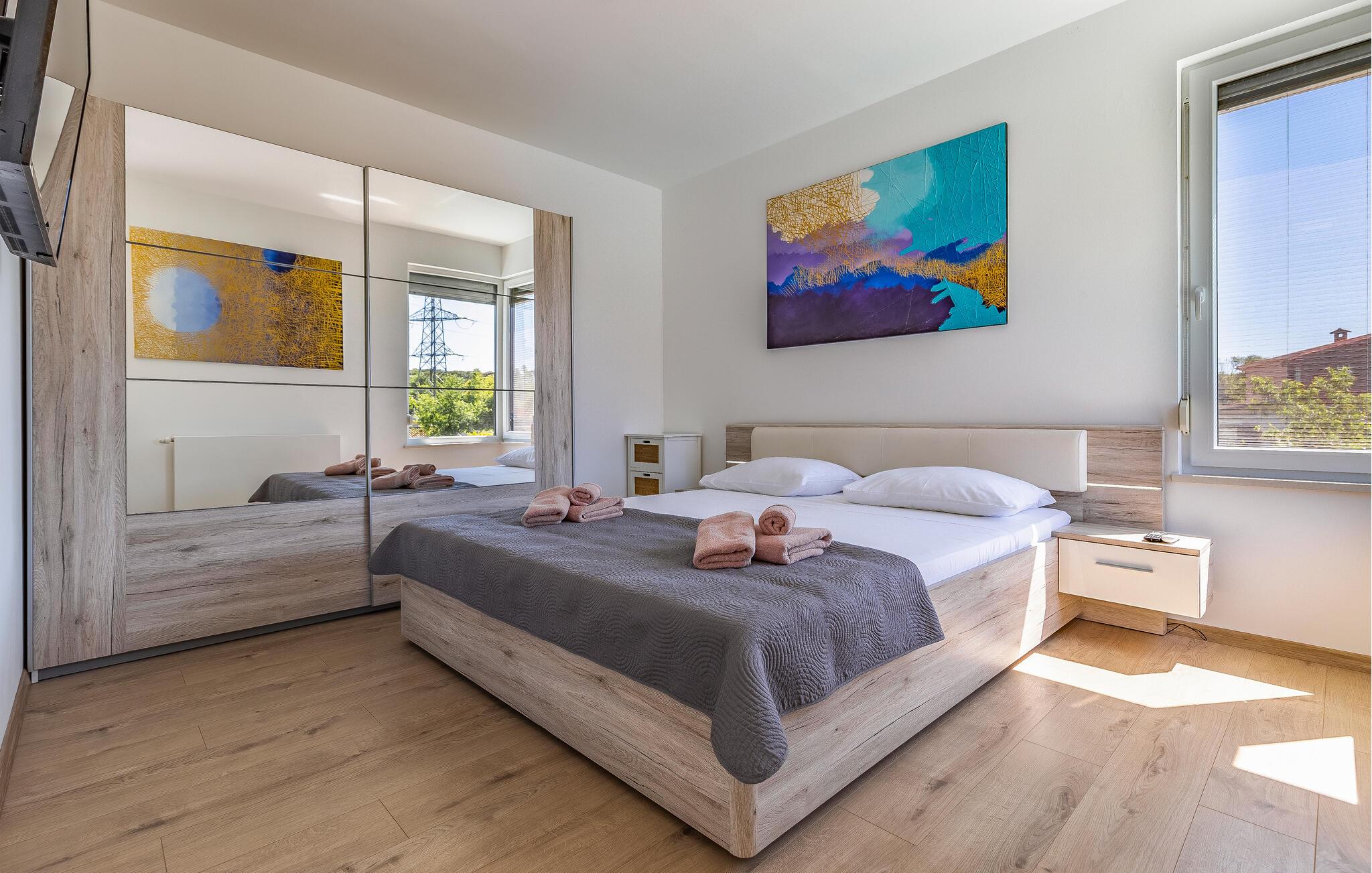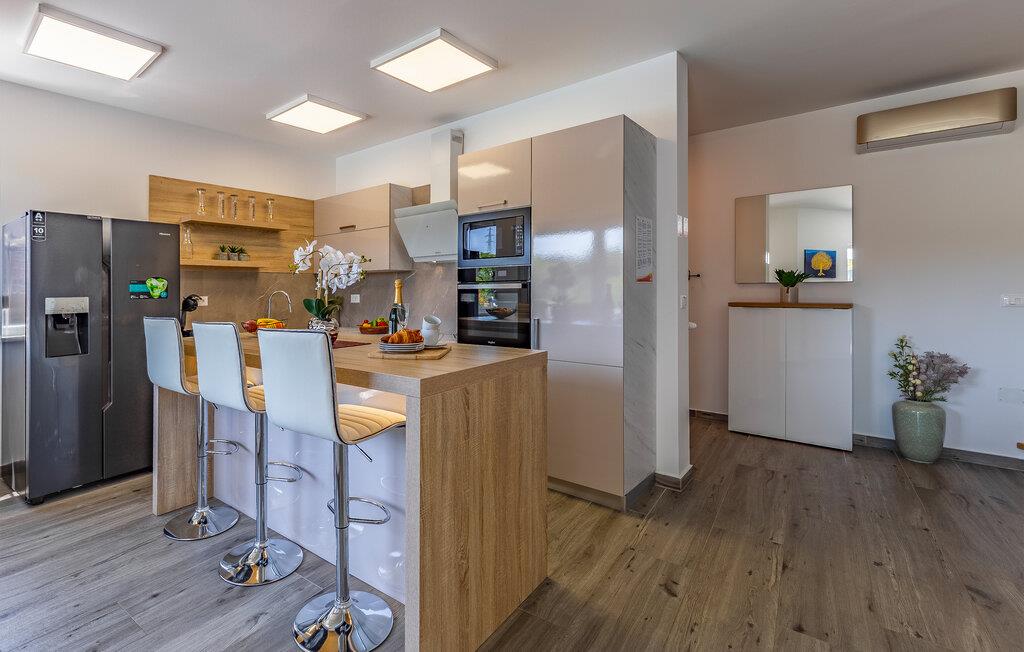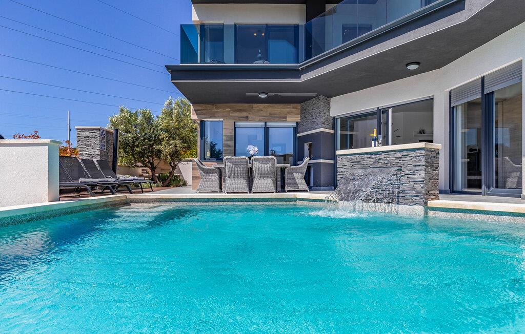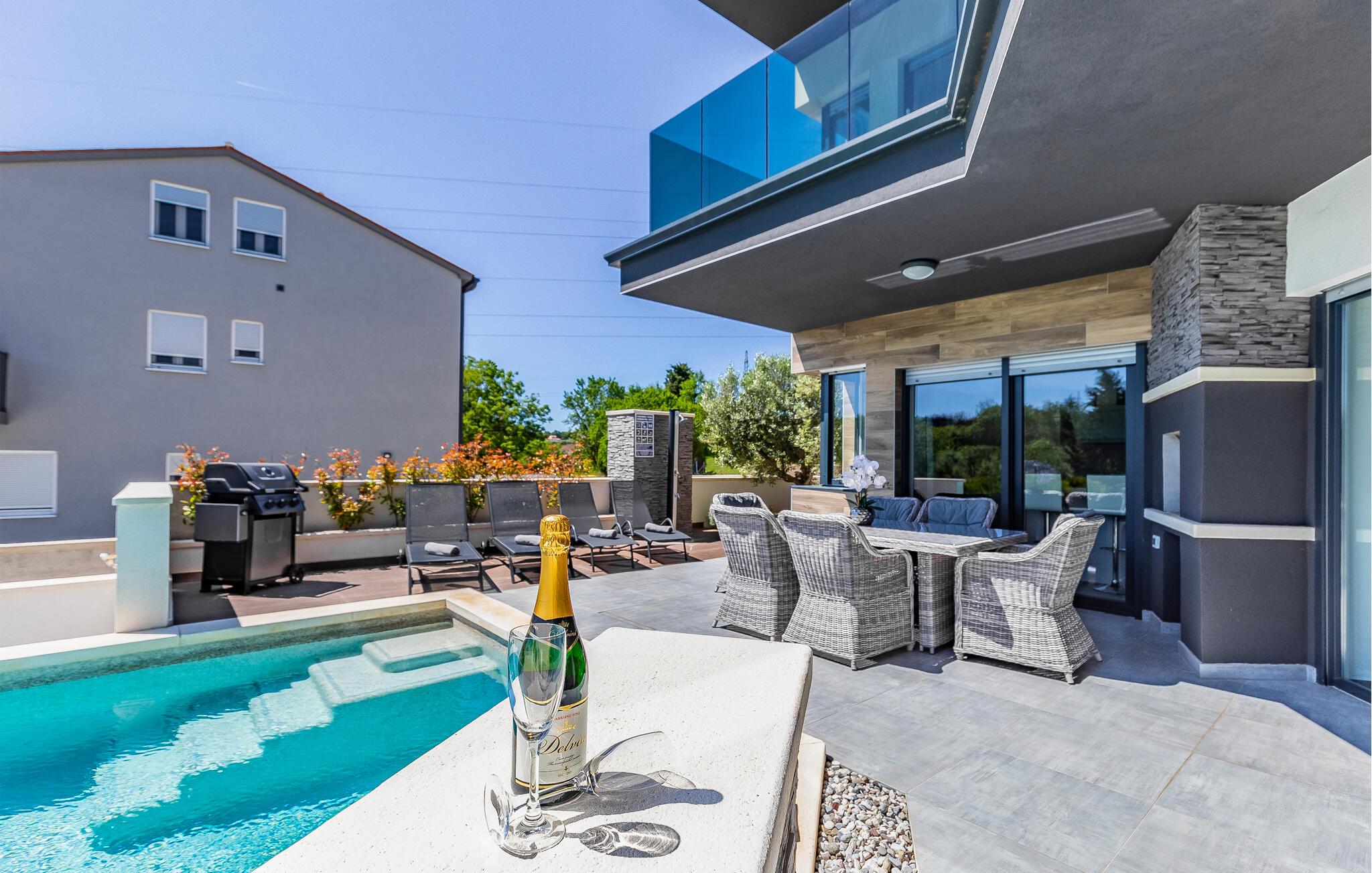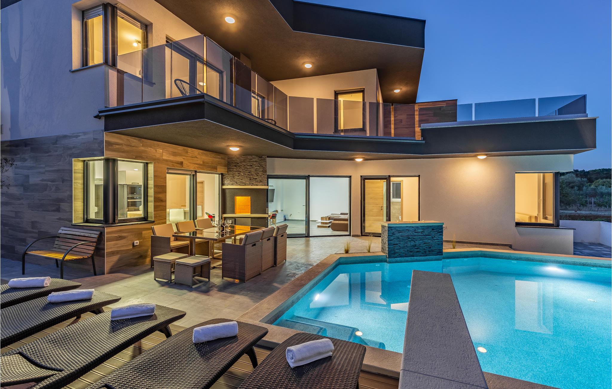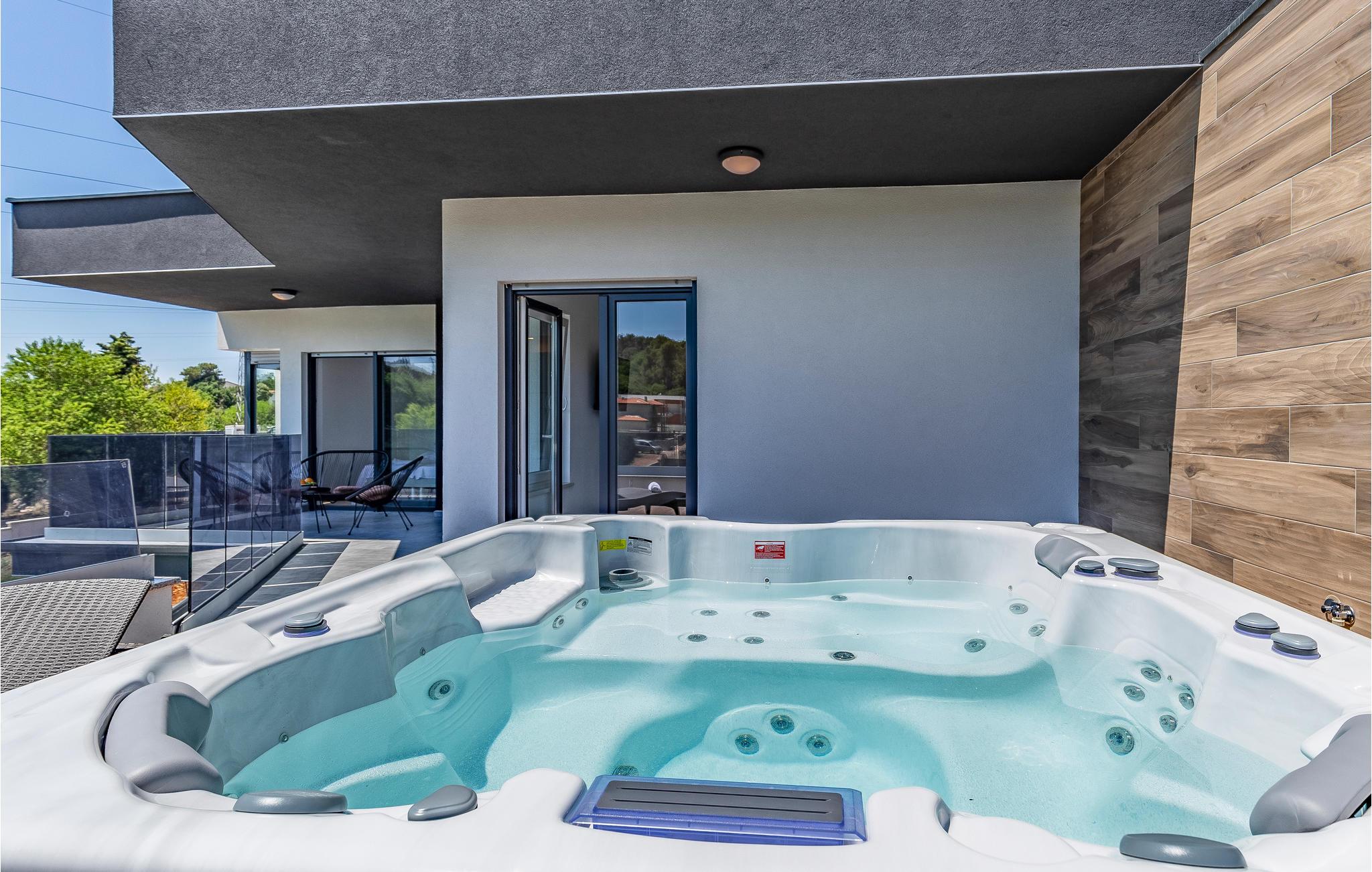 Med en rolig beliggenhed i udkanten af Pula, ligger denne flotte halvdel af et dobbelthus med privat swimmingpool. Det er bygget i morderne stil og tilbyder lækker massage i spabadet på terrassen.