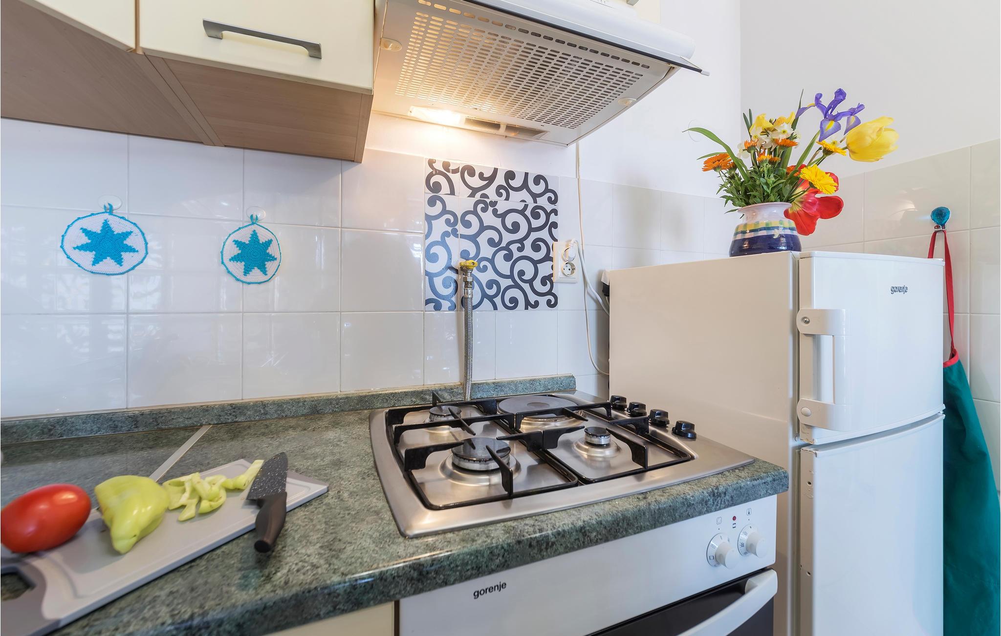 Denne bolig tilbyder jer blandt andet en kedelgrill og en afslappende terrasse med havemøbler, hvor I kan tilberede og nyde lækre feriemåltider. Inde i lejligheden kan I slappe dejligt af i komfortable møbler og nyde kølige temperaturer, når I trænger til en pause fra solen.