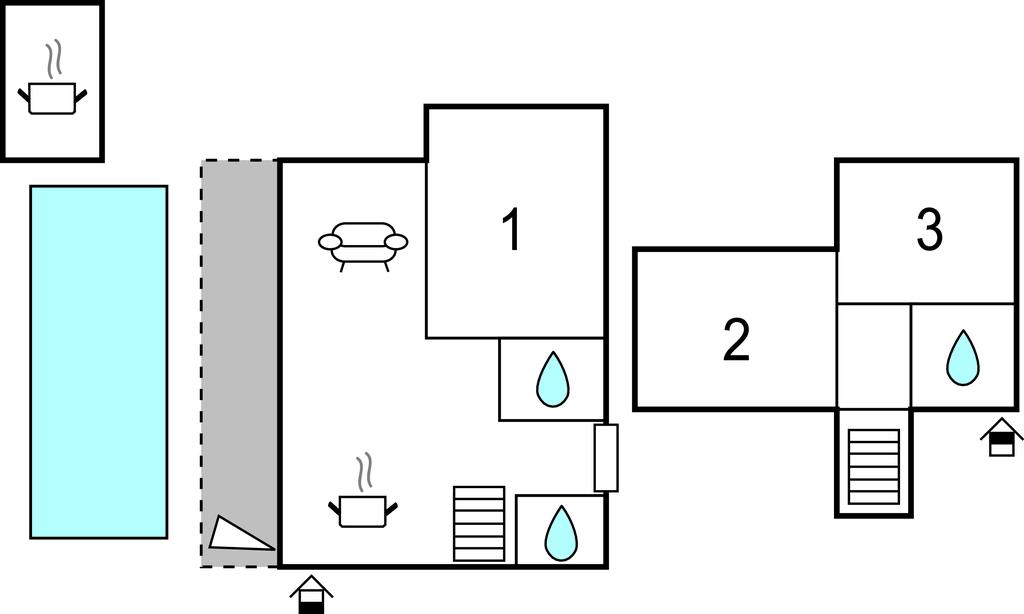 I stueetagen er der et åbent rum bestående af et køkken med spisestue og en stue med udsigt til den indre gårdhave, som består af en solterrasse med pool. Huset kan rumme seks personer i soveværelserne, mens en ekstra person kan sove i sofaen i stuen eller på en ekstra seng i rummet.