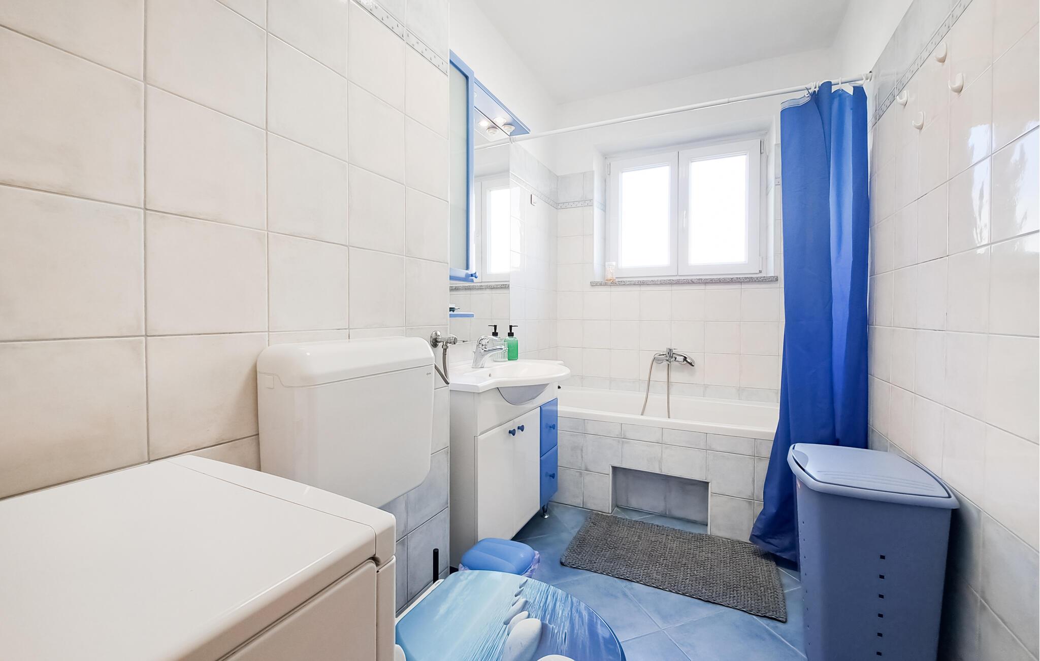 Denne moderne lejlighed med aircondition giver jer den komfort, I ønsker. Slap af i den rummelige og stilfulde stue, som er udstyret med en komfortabel sofa og et fjernsyn. Her kan I slappe af efter en dag fyldt med oplevelser i byen og nyde en filmaften med familien. Brug det åbne spiseområde til fælles måltider.