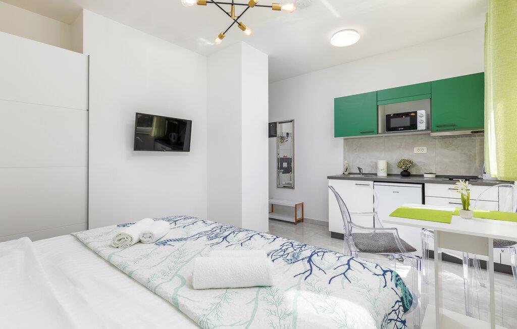 Dette moderne etværelseslejlighed tilbyder jer et hyggeligt, midlertidigt hjem i hjertet af Pula, mens I opdager nye seværdigheder i denne pulserende kystby hver dag. Planlæg jeres aktiviteter for den kommende dag ved spisebordet, tilbered små måltider i det åbne køkken, og efter en lang dag kan I streame en film eller fordybe jer i en god bog.