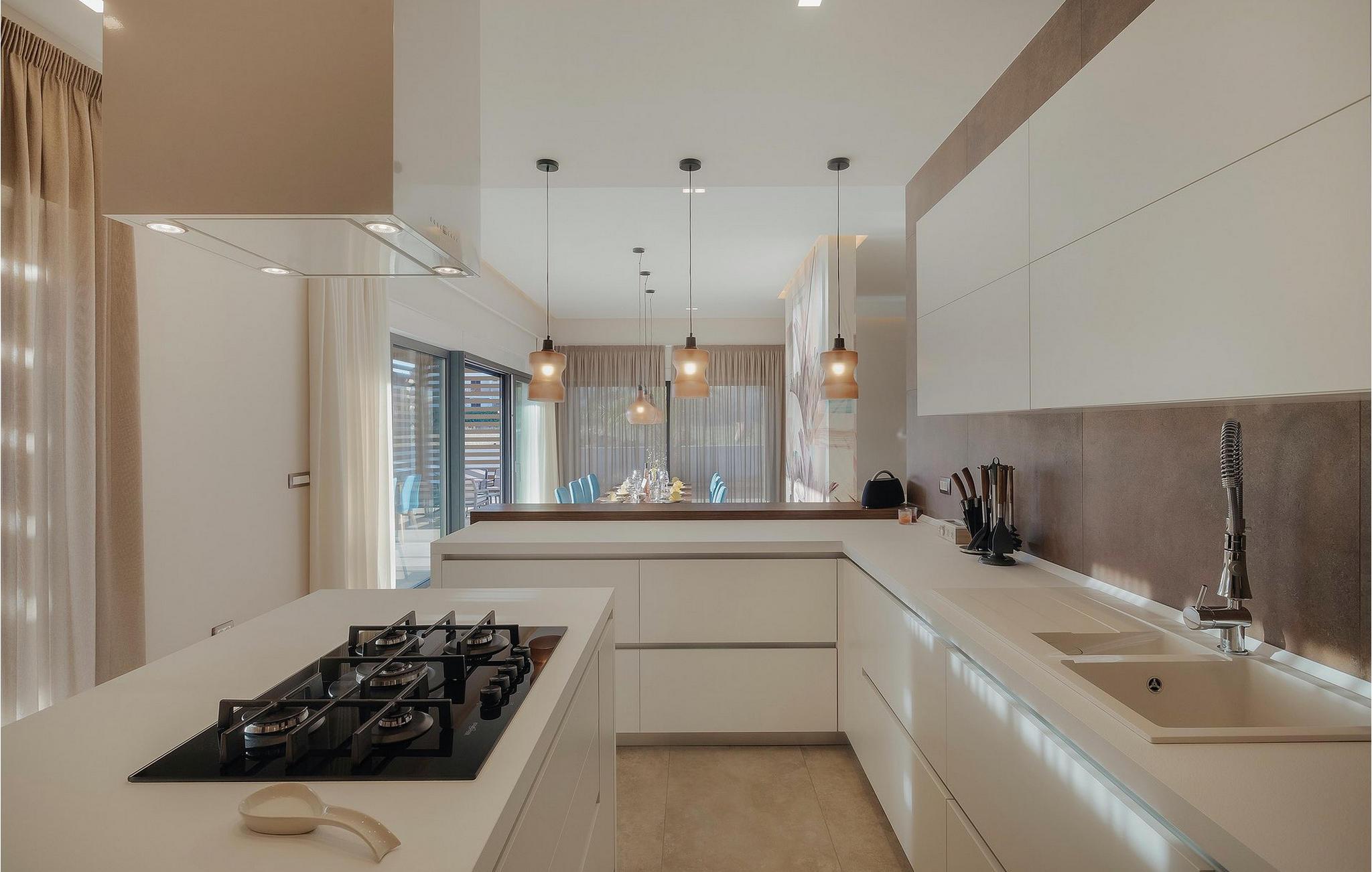 Men lad os komme til interiøret ... Stilfuldt og høj kvalitet, åbent og lyst, men meget indbydende og hyggeligt - det er boligen værelse med spiseplads og fuldt udstyret køkken, som skaber en glidende overgang til haven gennem de store vinduesfronter. 3 moderne soveværelser med dobbeltsenge og 2 smarte badeværelser er tilgængelige for gæsterne her. Et af soveværelserne fører til spabadet på få trin.