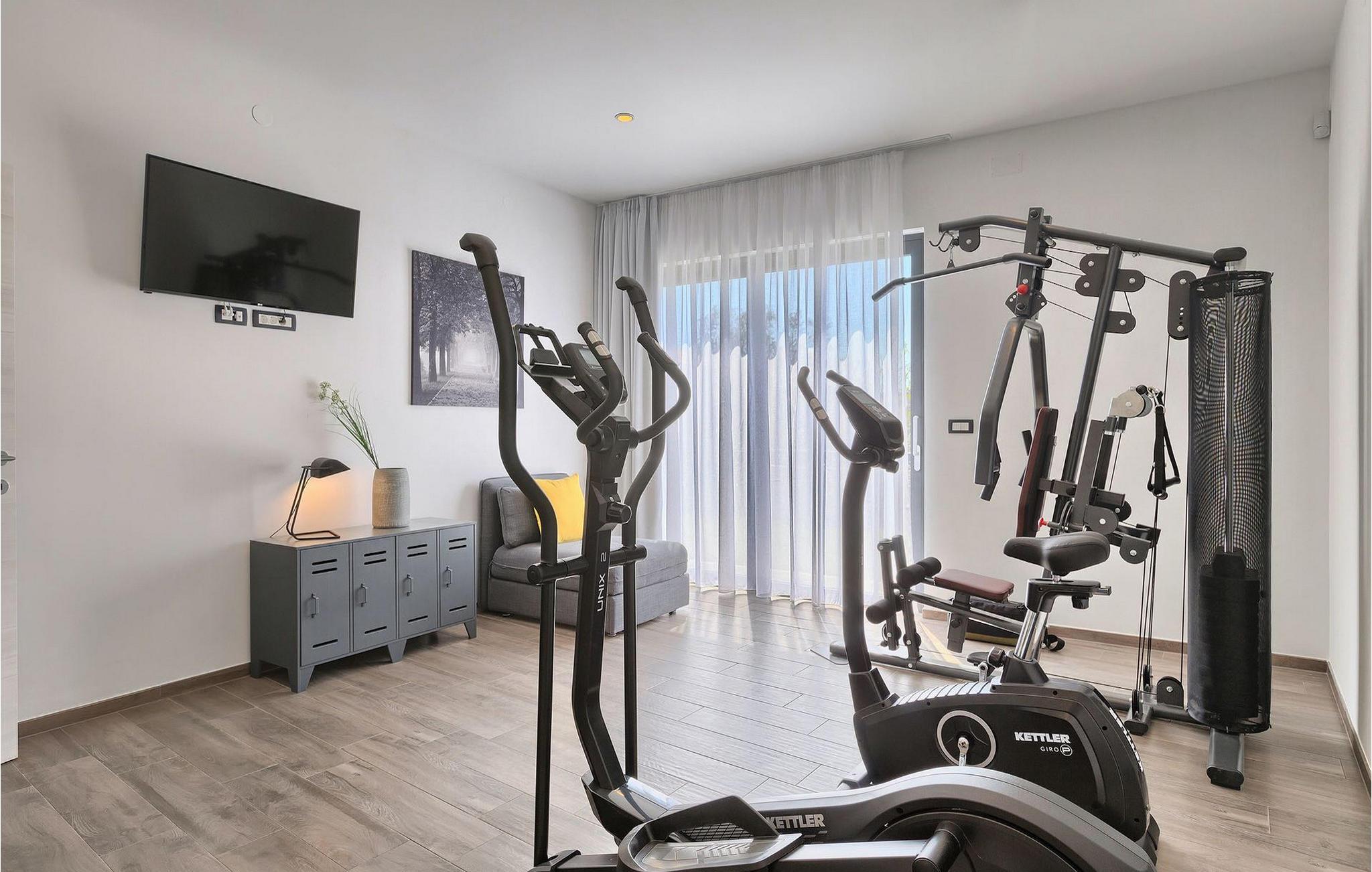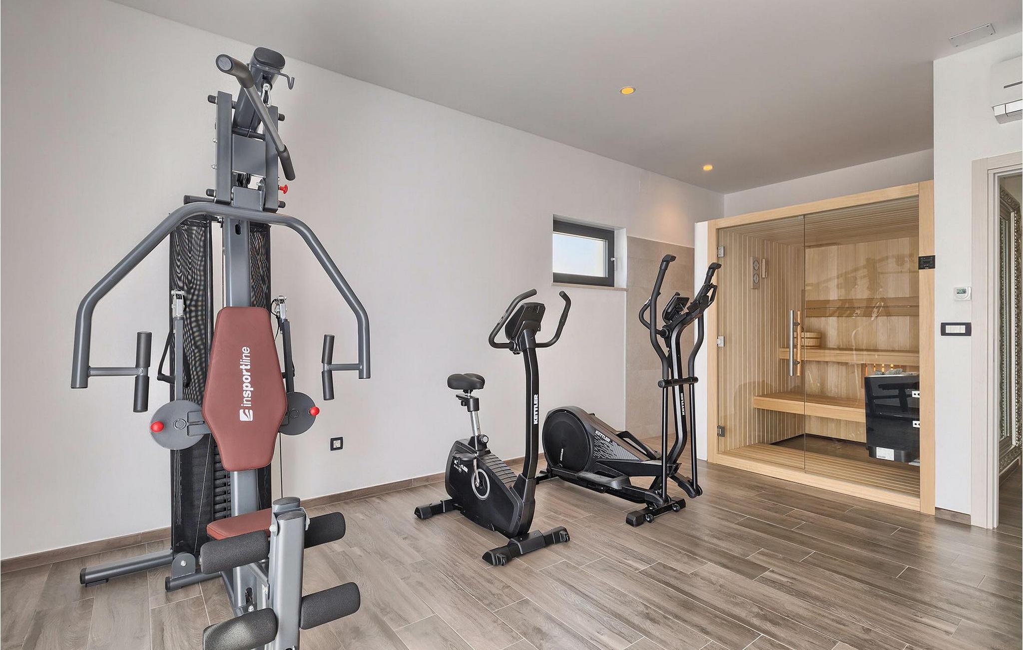 I stueetagen finder du en rummelig opholdsstue, der er forbundet med et fuldt udstyret køkken og spiseplads, et badeværelse og en finish sauna og fitnessrum med indbygget bruser. Soveværelserne, alle udstyret med en dobbeltseng, tv og aircondition-enhed, er placeret på øverste etage. Tre af de fire soveværelser har eget badeværelse for ekstra komfort.