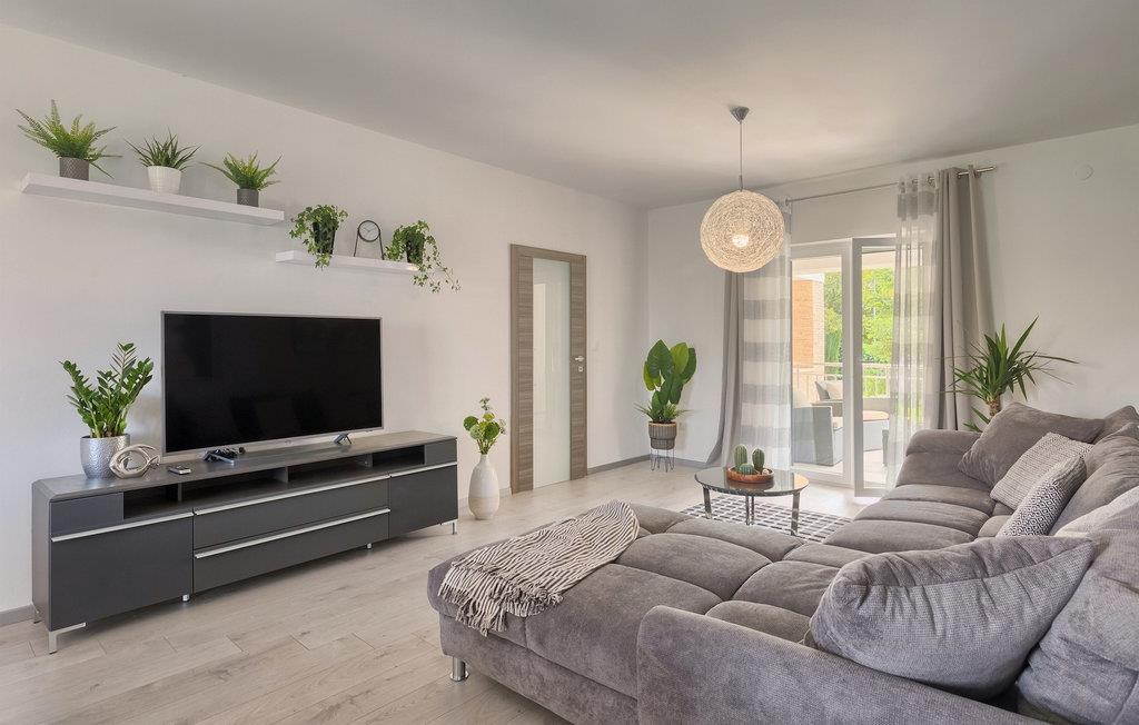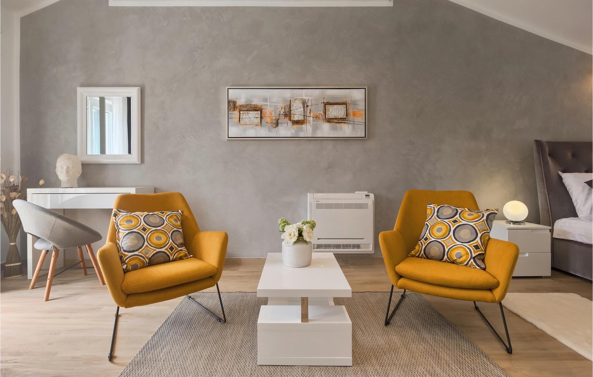 Wenn Sie sich komplett erholen möchten, bietet diese Villa eine Sauna und ein Whirlpool-Bad. Während sich die Sauna im unteren Teil des Erdgeschosses befindet, können Sie den Whirlpool in einer speziellen Ecke des modernen Schlafzimmers mit Fernseher und einem kleinen Wohnbereich im ersten Stock finden. Lassen Sie es sich es wohl sein und tauchen Sie ein in die angenehme Stimmung dieses Zimmers mit Kerzen, einem Glas Wein und dem beleuchtenden Whirlpool. Die ganze Villa wurde mit viel Stil dekoriert, sodass das offene Wohnzimmer in grauen Tönen mit farbigen Möbeln erfrischend wirkt und den ganzen Raum einen modernen Flair verleiht.