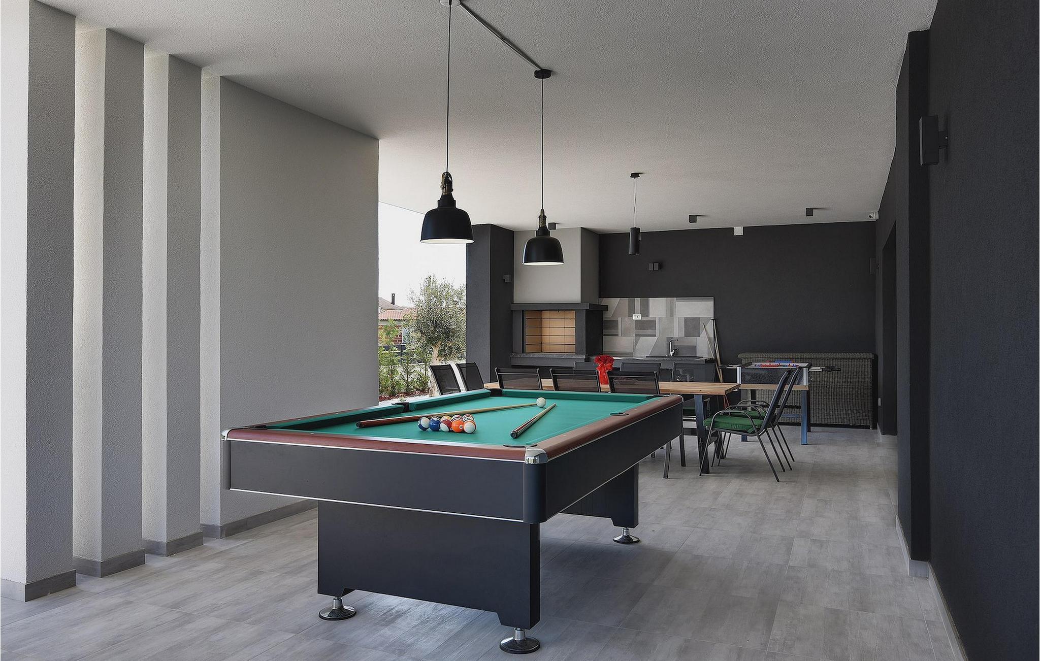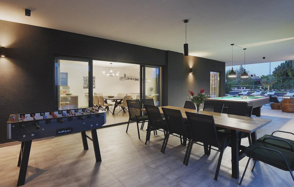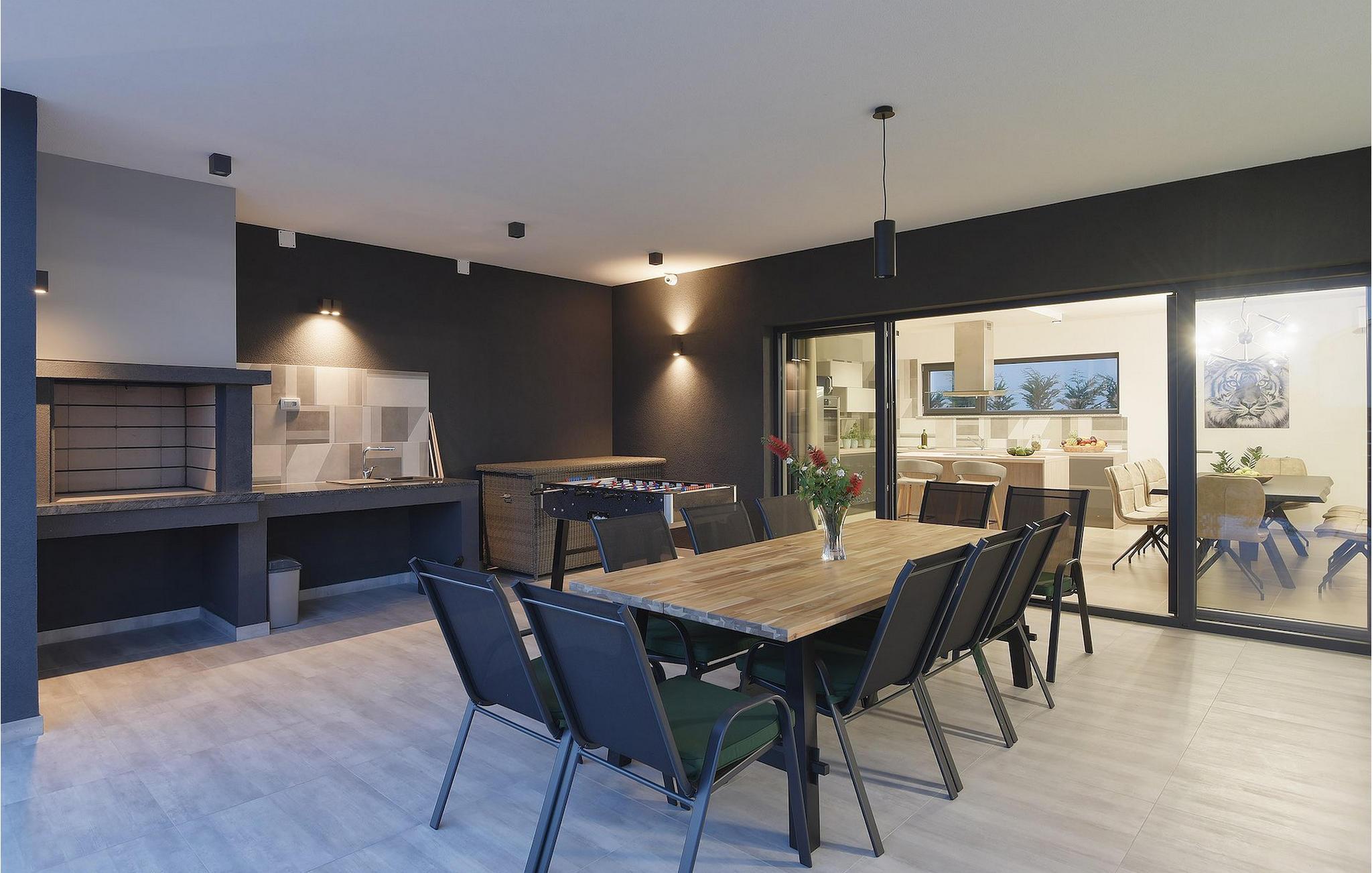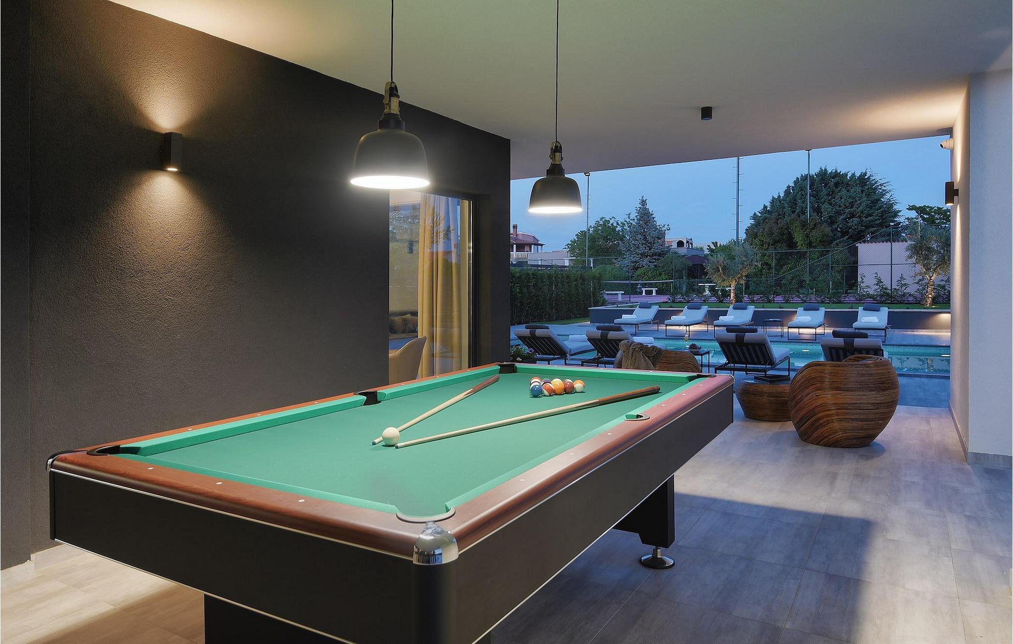Denne luksuriøse villa vil charmere dig med sit smukke, omhyggeligt gennemtænkte design, indbydende private pool og masser af underholdningsmuligheder samt sin bekvemme beliggenhed lige uden for Pula. Denne spektakulære villa på 410 kvadratmeter giver en stilfuld og moderne ferie, der perfekt kombinerer en aktiv og afslappende ferie. Villaens smagfuldt indrettede interiør består af en elegant åben stueetage med stue/spisestue og køkken, samt et soveværelse med dobbeltseng med eget badeværelse og et gæstetoilet. Fra både opholdsstuen og soveværelset har du direkte adgang til det dejlige udendørsområde og den private pool indrammet af komfortable liggestole. Den overdækkede udendørs spiseplads giver mulighed for al fresco spisning ved siden af, hvor du finder poolbordet og bordfodbolden, komplet med et loungeområde, perfekt til at tage en pause i løbet af dagen eller aftenen.