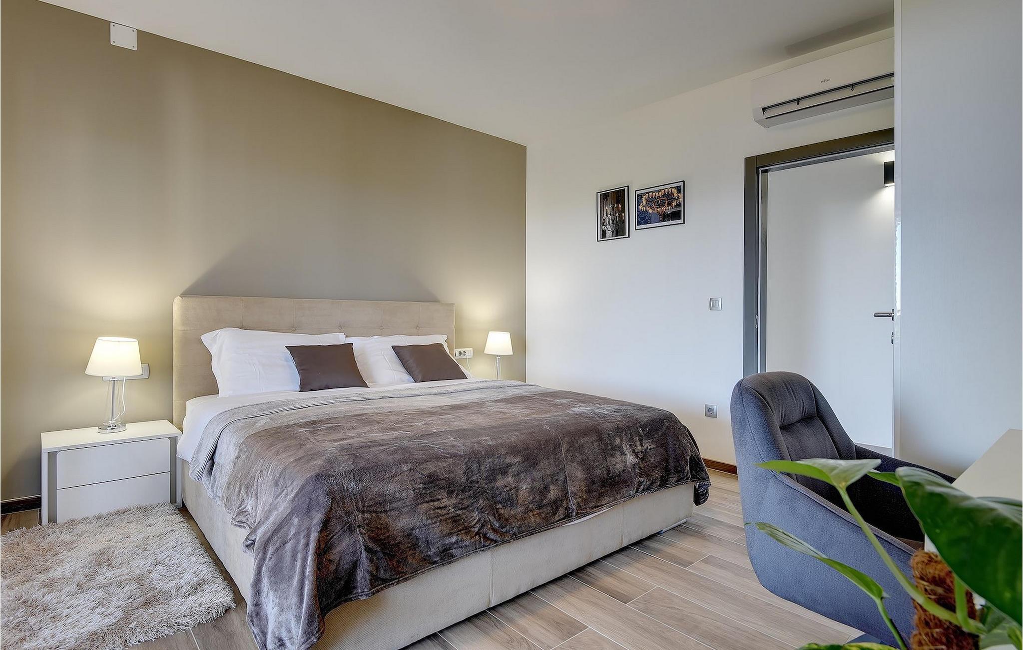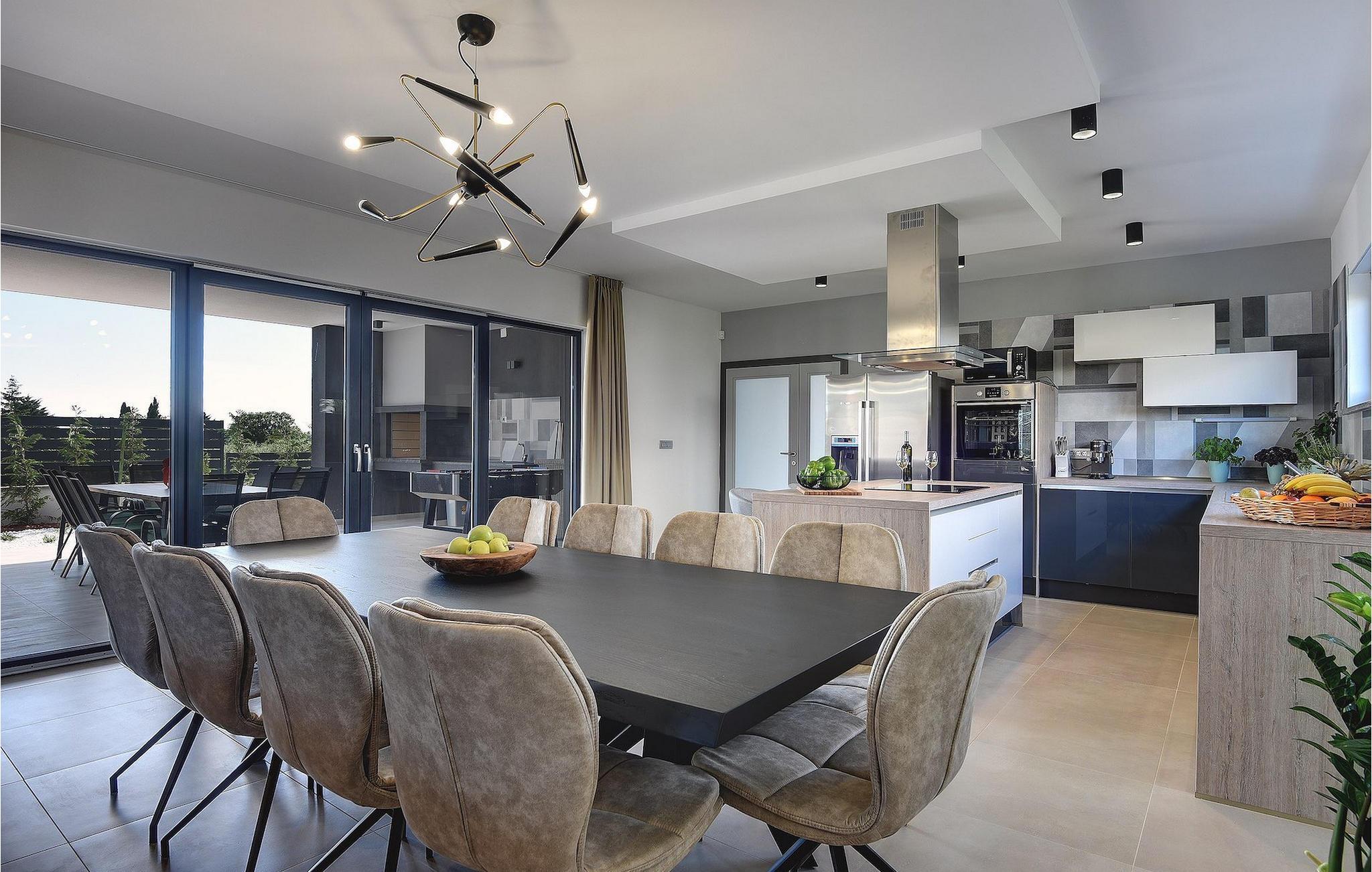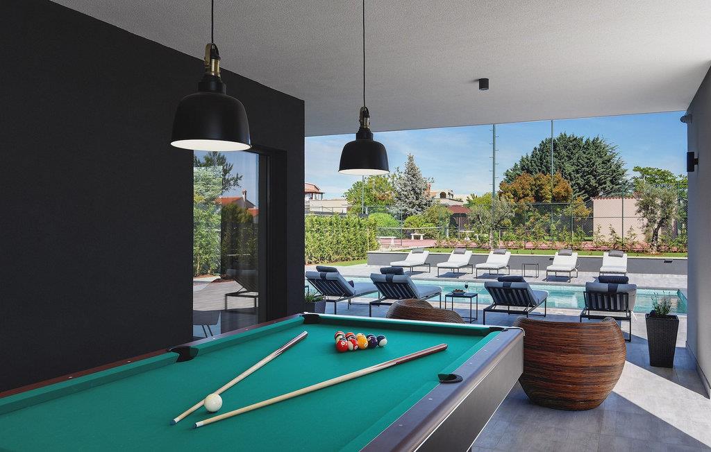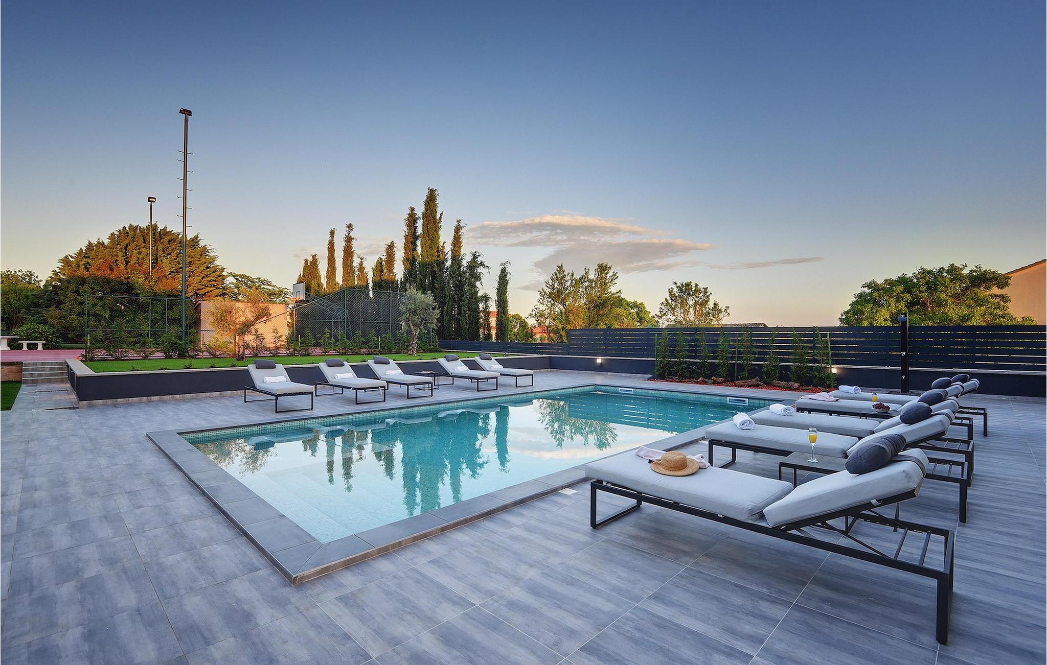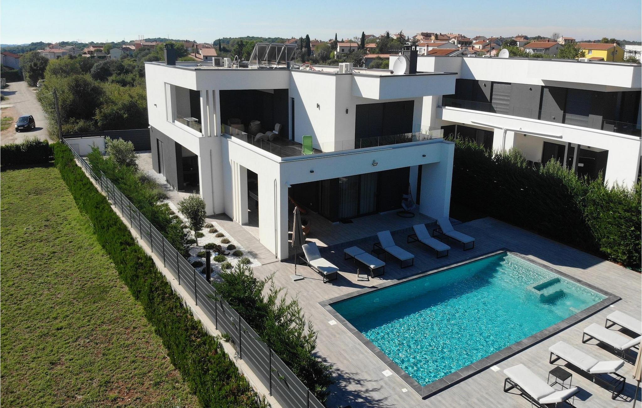 Denne luksuriøse villa vil charmere dig med sit smukke, omhyggeligt gennemtænkte design, indbydende private pool og masser af underholdningsmuligheder samt sin bekvemme beliggenhed lige uden for Pula. Denne spektakulære villa på 410 kvadratmeter giver en stilfuld og moderne ferie, der perfekt kombinerer en aktiv og afslappende ferie. Villaens smagfuldt indrettede interiør består af en elegant åben stueetage med stue/spisestue og køkken, samt et soveværelse med dobbeltseng med eget badeværelse og et gæstetoilet. Fra både opholdsstuen og soveværelset har du direkte adgang til det dejlige udendørsområde og den private pool indrammet af komfortable liggestole. Den overdækkede udendørs spiseplads giver mulighed for al fresco spisning ved siden af, hvor du finder poolbordet og bordfodbolden, komplet med et loungeområde, perfekt til at tage en pause i løbet af dagen eller aftenen.