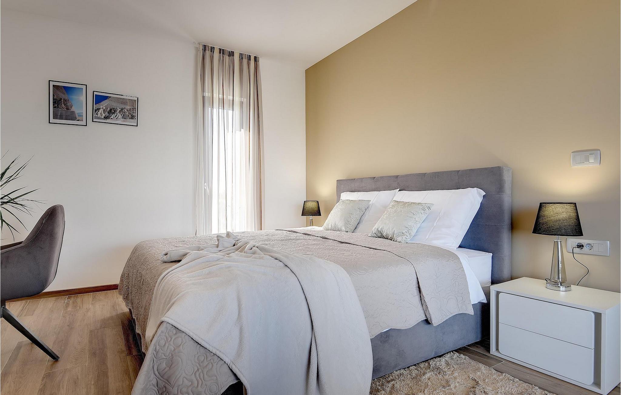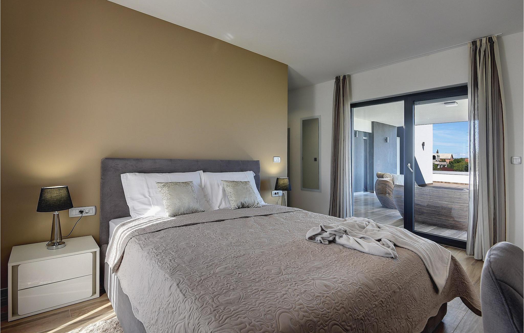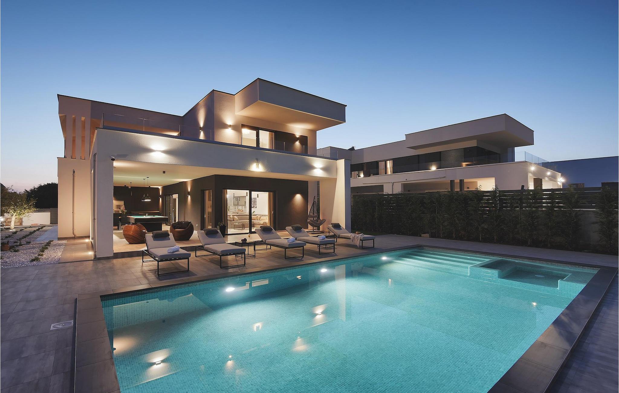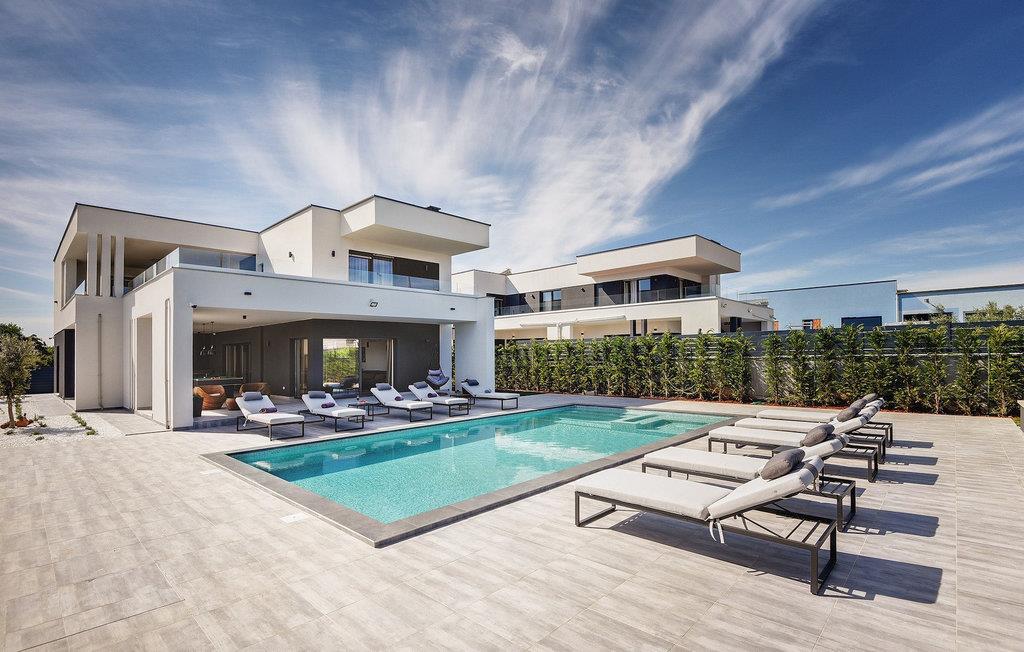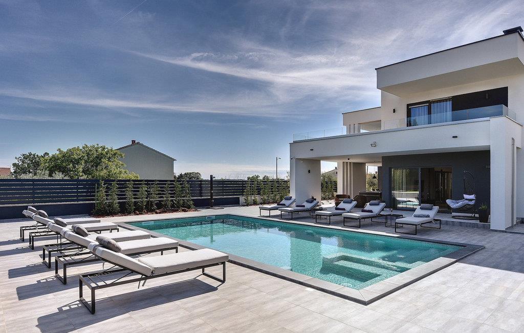 Denne luksuriøse villa vil charmere dig med sit smukke, omhyggeligt gennemtænkte design, indbydende private pool og masser af underholdningsmuligheder samt sin bekvemme beliggenhed lige uden for Pula. Denne spektakulære villa på 410 kvadratmeter giver en stilfuld og moderne ferie, der perfekt kombinerer en aktiv og afslappende ferie. Villaens smagfuldt indrettede interiør består af en elegant åben stueetage med stue/spisestue og køkken, samt et soveværelse med dobbeltseng med eget badeværelse og et gæstetoilet. Fra både opholdsstuen og soveværelset har du direkte adgang til det dejlige udendørsområde og den private pool indrammet af komfortable liggestole. Den overdækkede udendørs spiseplads giver mulighed for al fresco spisning ved siden af, hvor du finder poolbordet og bordfodbolden, komplet med et loungeområde, perfekt til at tage en pause i løbet af dagen eller aftenen.