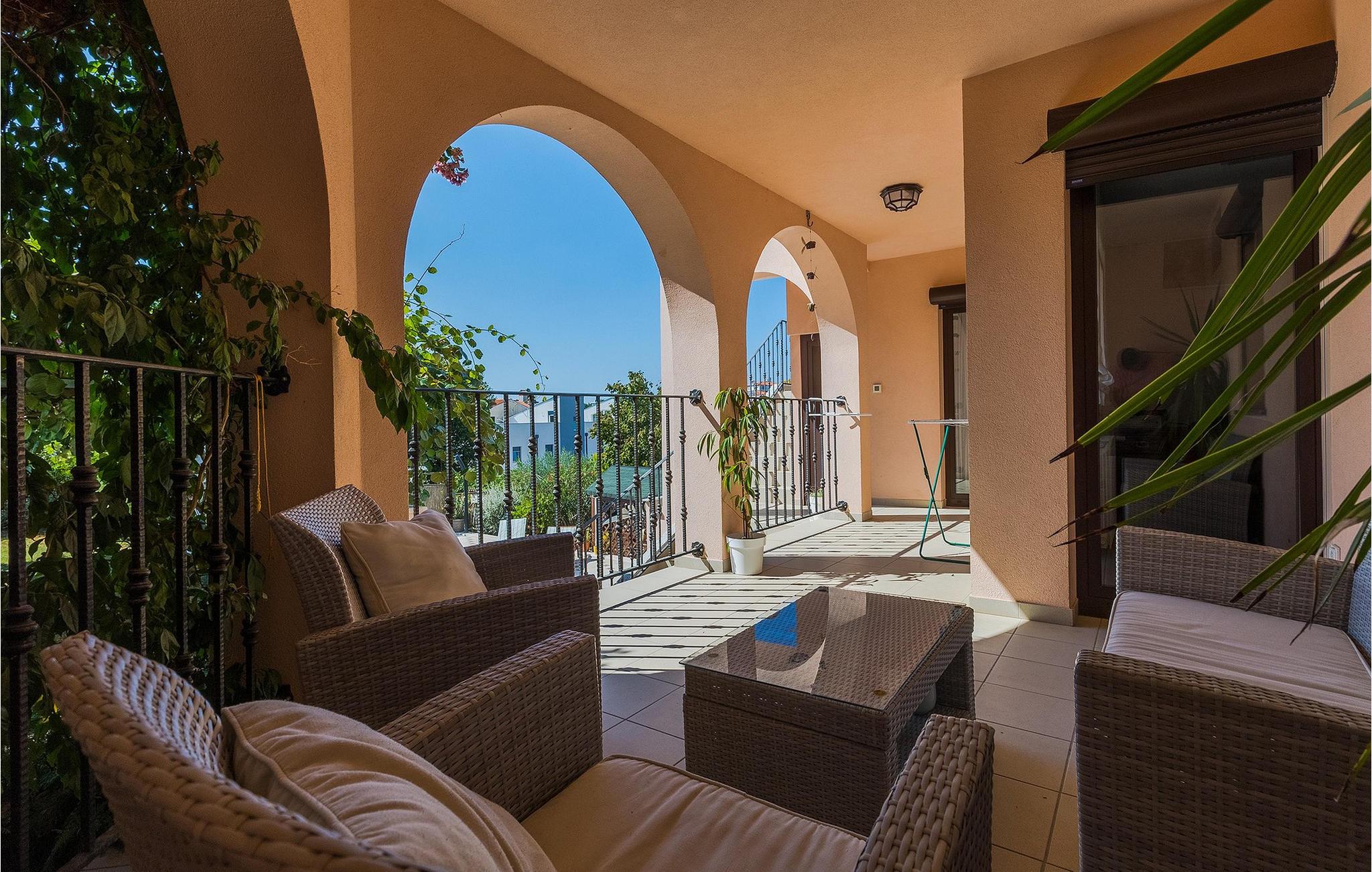 Und schließlich befinden sich im Obergeschoss zwei weitere Schlafzimmer, beide mit Doppelbetten ausgestattet, die sich ein Badezimmer teilen. Zur Verfügung stehen Ihnen auch ein Wohnzimmer mit Essbereich und Küche sowie eine halbüberdachte Terrasse, auf der Sie Ihren Morgenkaffee trinken und die Aussicht genießen können.