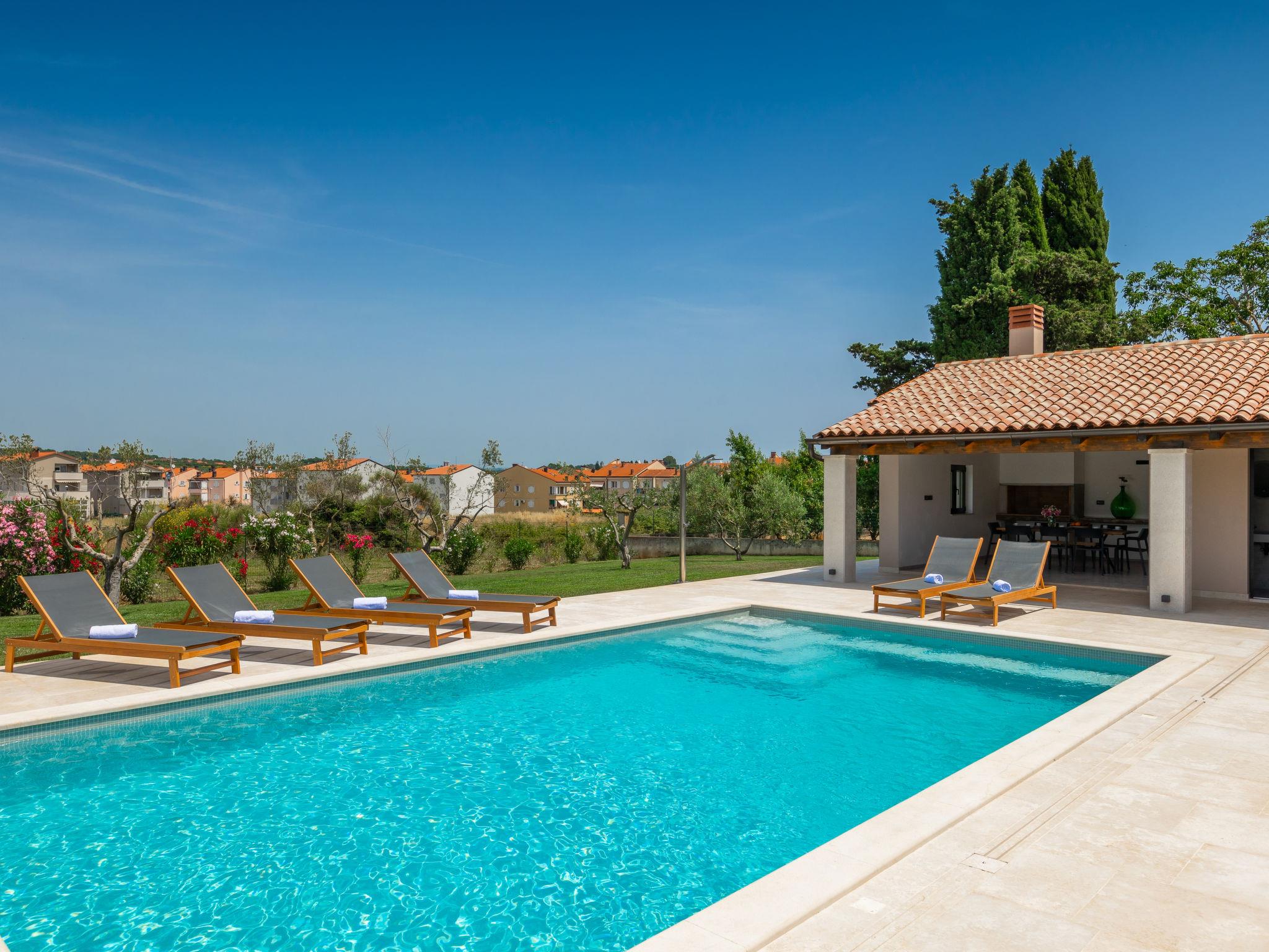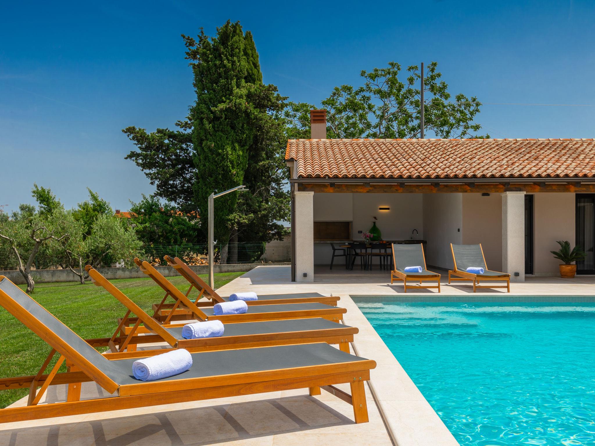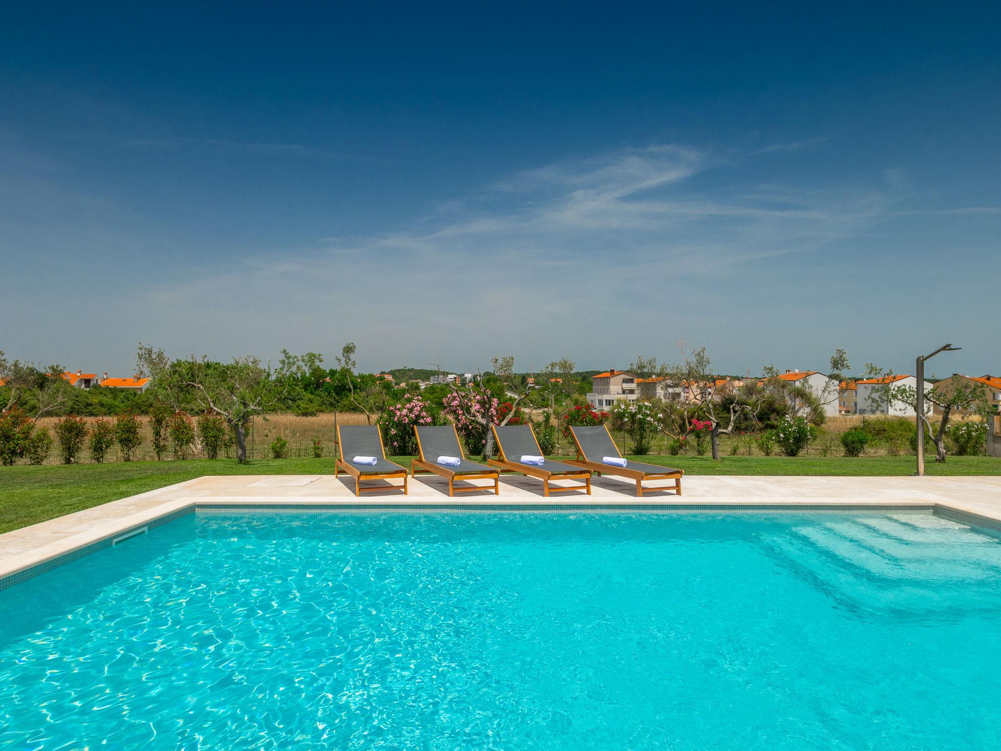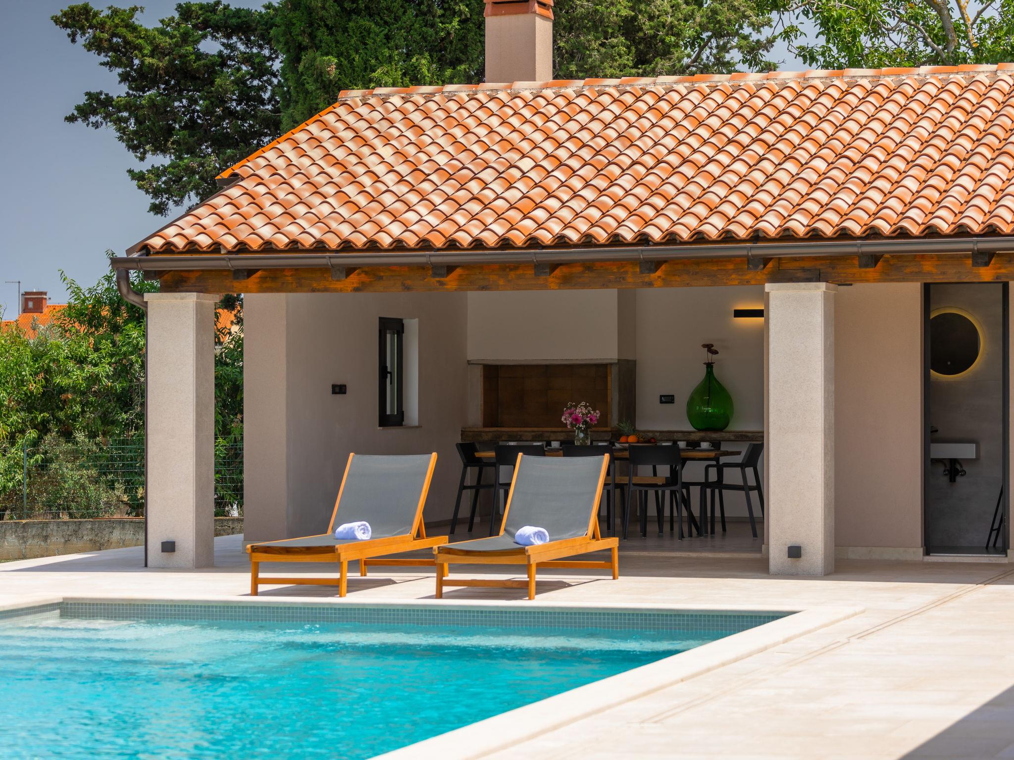 Modern, luxurious villa "Marialba". 3 km from the centre of Pula, 3.4 km from the sea, 3.4 km from the beach. Private: property 3'482 m2 (fenced), beautiful garden to relax, swimming pool angular (9 x 5 m, 45 m2, depth 135 cm, seasonal availability: 01.May. - 01.Oct.) with internal staircase. Shower/WC in the pool area, hot tub, terrace (20 m2), garden furniture, barbecue, barbecue house. In the house: internet access, air conditioning, washing machine. Parking (for 3 cars) at the house on the premises. Grocery 450 m, shopping centre 3 km, restaurant 1 km, bus stop 120 m, pebble beach 3.4 km, rocky beach 3.4 km. Groups of teenagers on request only. Please note: airfield 9.3 km from the property.