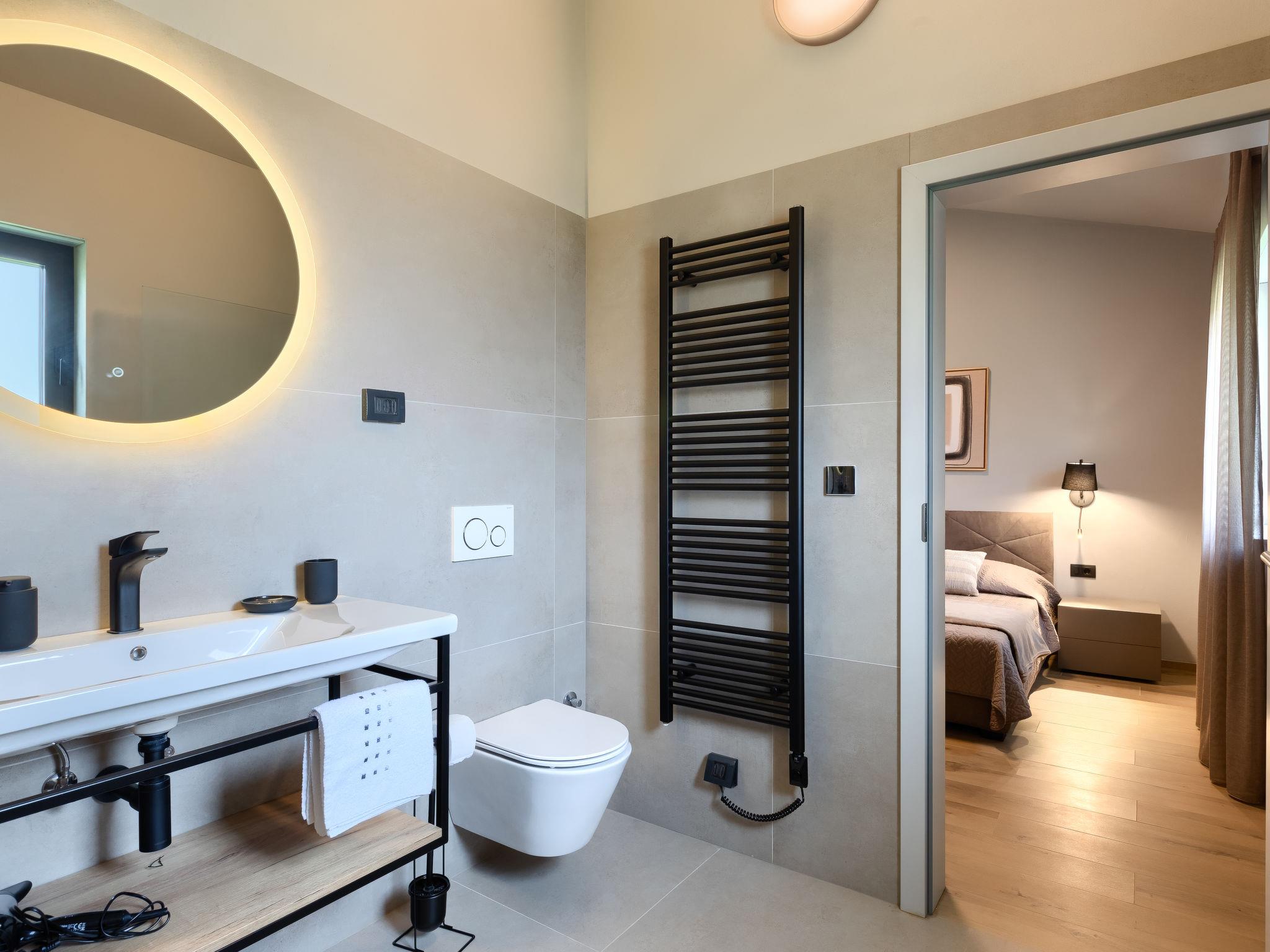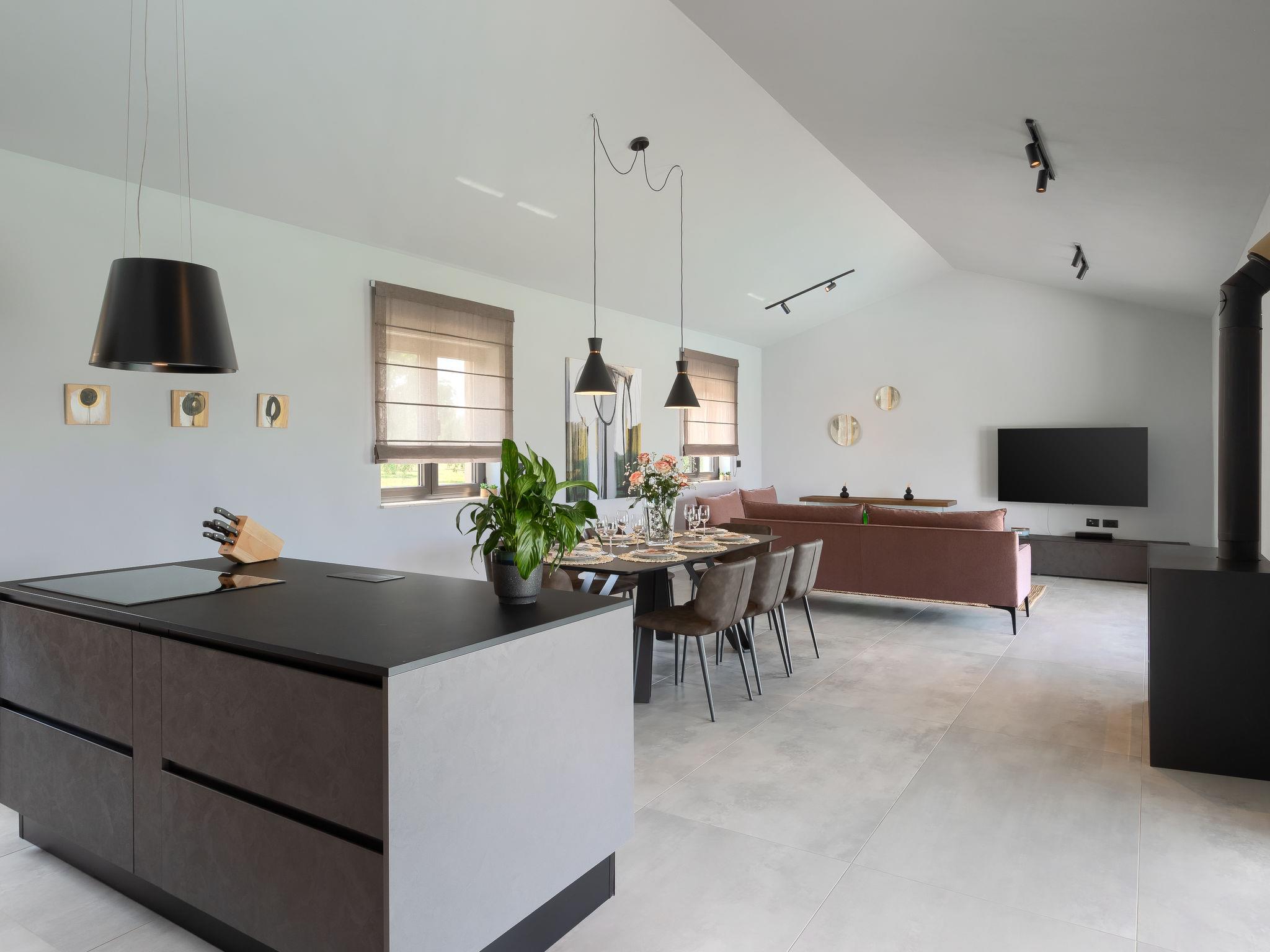 4-room villa 170 m2. Modern and luxurious furnishings: living/dining room with satellite TV and flat screen. Exit to the terrace, to the swimming pool. 3 rooms, each room with 1 double bed (160 cm, length 200 cm), shower/WC and satellite TV (flat screen). Open kitchen (oven, dishwasher, 4 ceramic glass hob hotplates, toaster, kettle, microwave, freezer, electric coffee machine). Exit to the terrace. Sep. WC. Floor heating, forced-air heating. Facilities: Internet (WiFi, free).