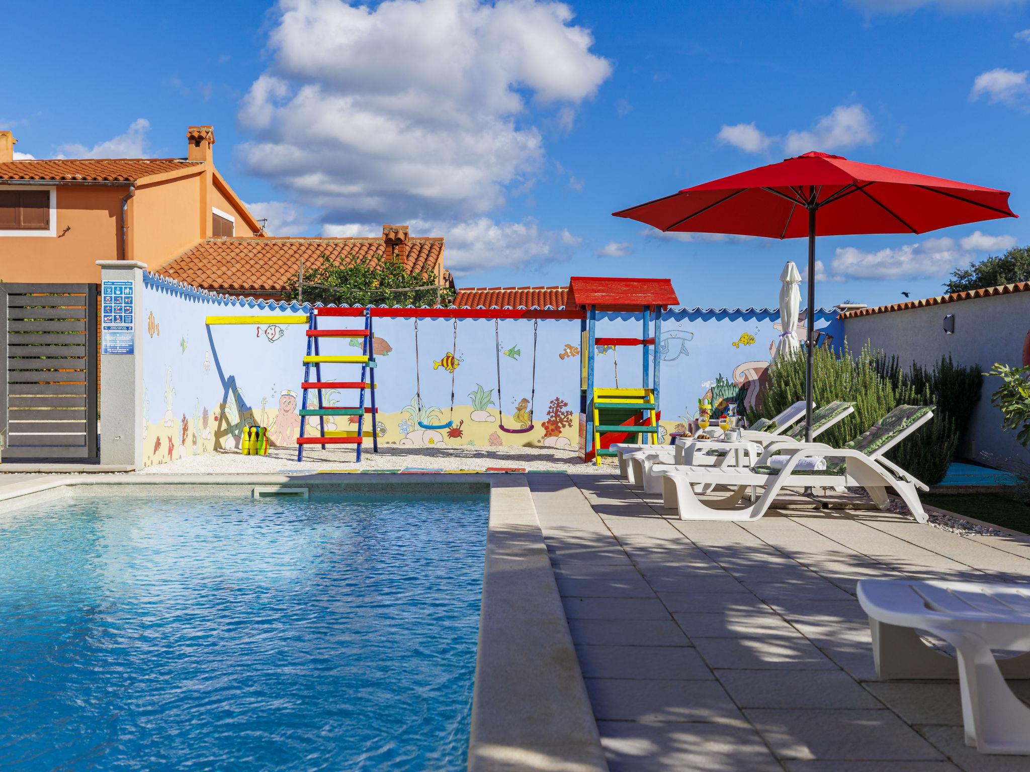 Beautiful 2-family house "David". In the hamlet Loborika 6.5 km from the centre of Pula, 6.5 km from the centre of Marcana, in a quiet, sunny position, 9 km from the sea. Private: property 250 m2 (fenced), small, beautiful garden with wildlife garden, swimming pool angular (7 x 3 m, 24 m2, depth 140 cm, seasonal availability: 27.Apr. - 28.Sep.) with internal staircase. Outdoor shower, table tennis, terrace (27 m2), barbecue, children's playground (swing). In the house: internet access. Parking at the house on the premises. Shop 1.5 km, supermarket 5 km, restaurant 1 km, café 1.5 km, bus stop 1.2 km, pebble beach 12 km. Tennis 15 km, riding stable 5 km, walking paths from the house 100 m, cycle lane 150 m. Nearby attractions: Amphitheater 8.5 km. Available: darts (included). Outdoor kitchen (2 ceramic glass hob hotplates, fridge).