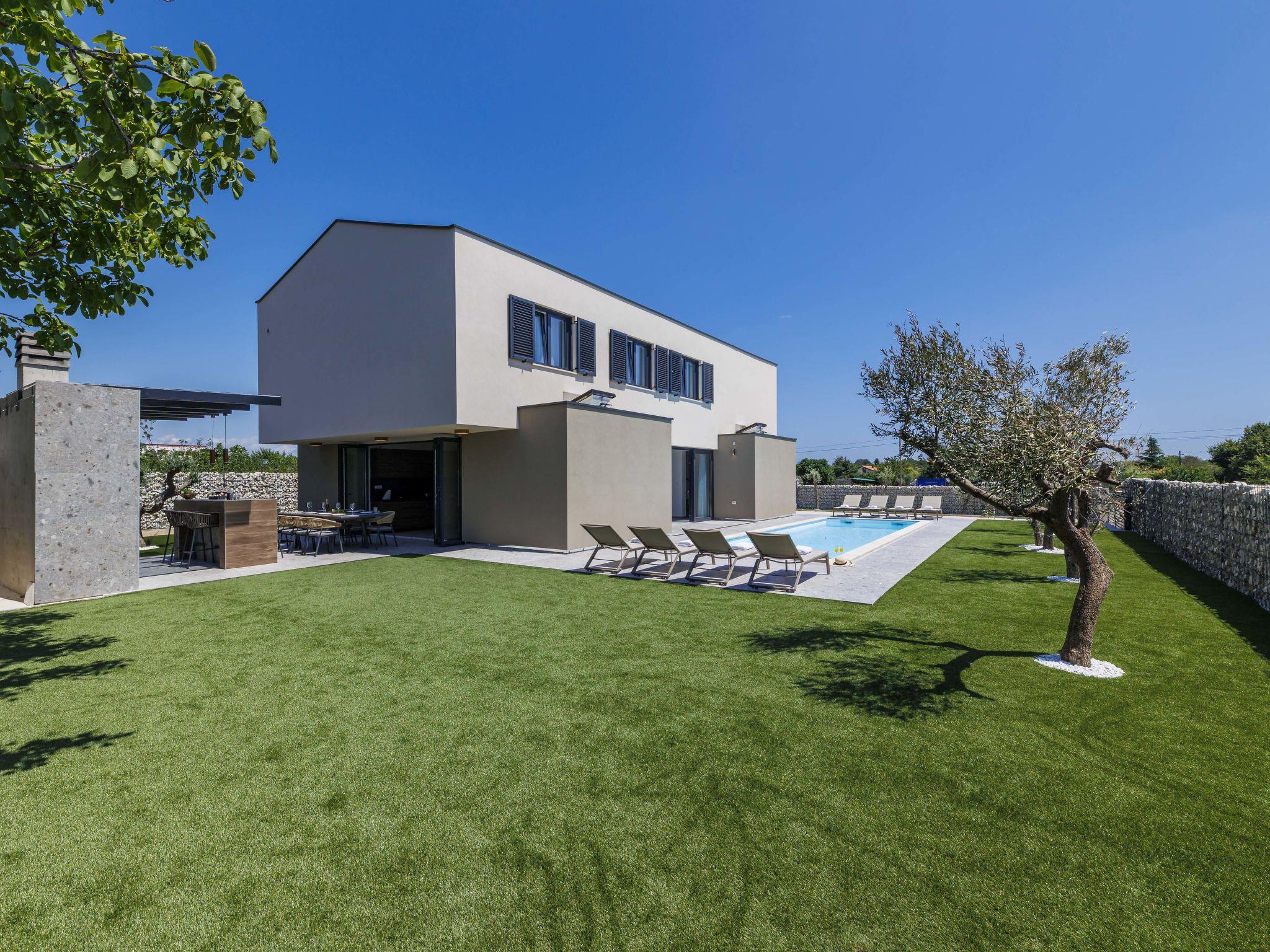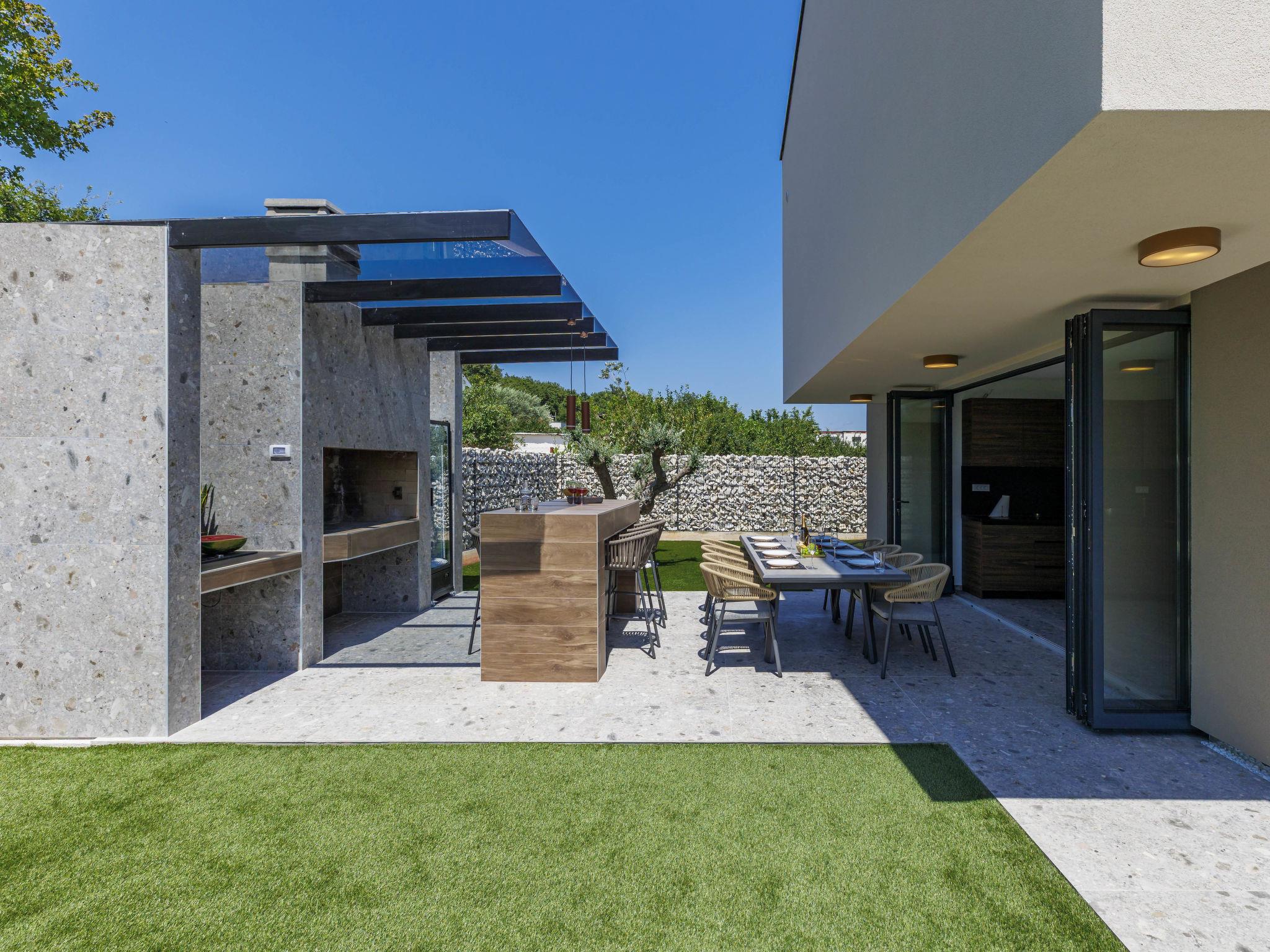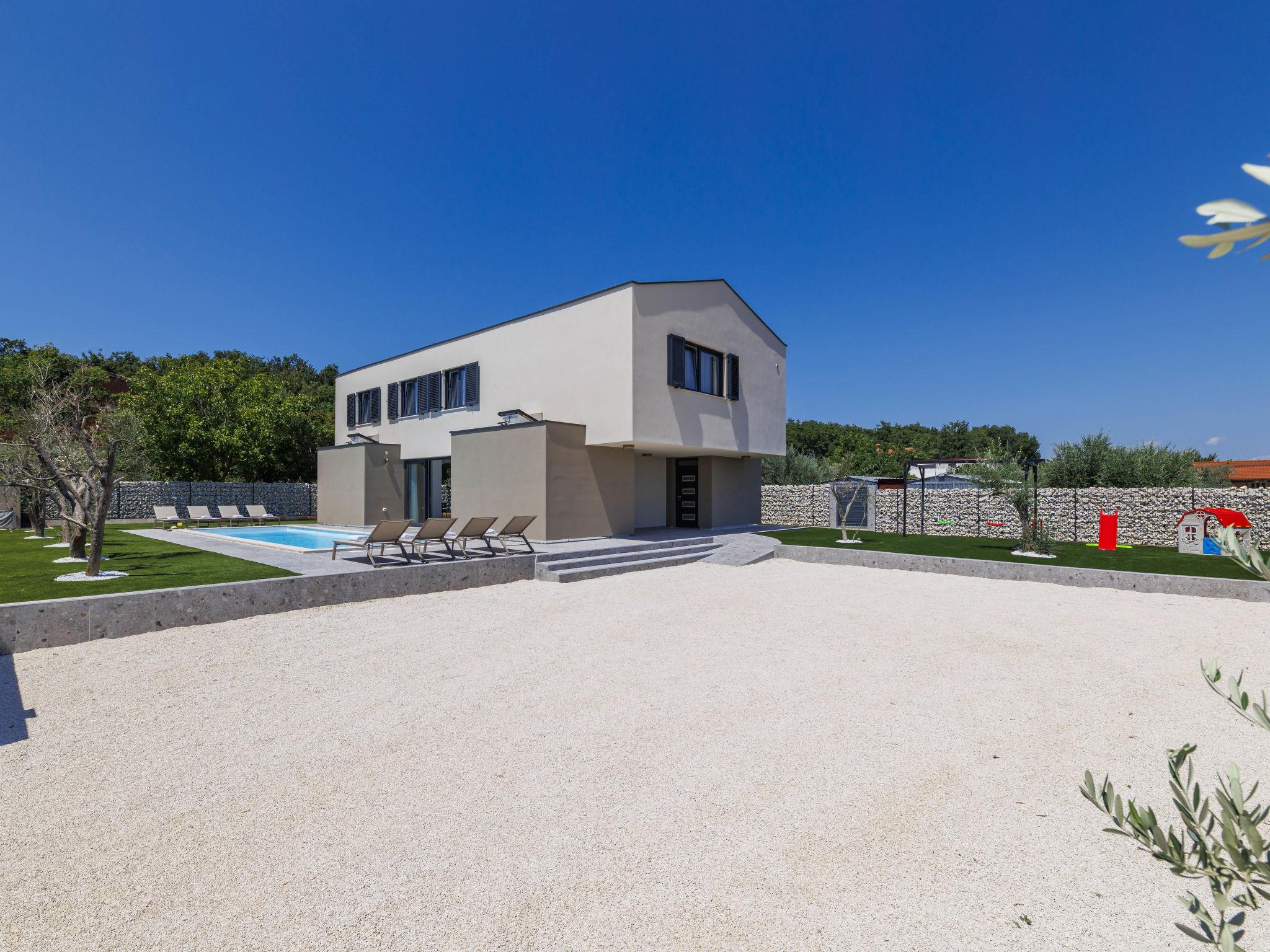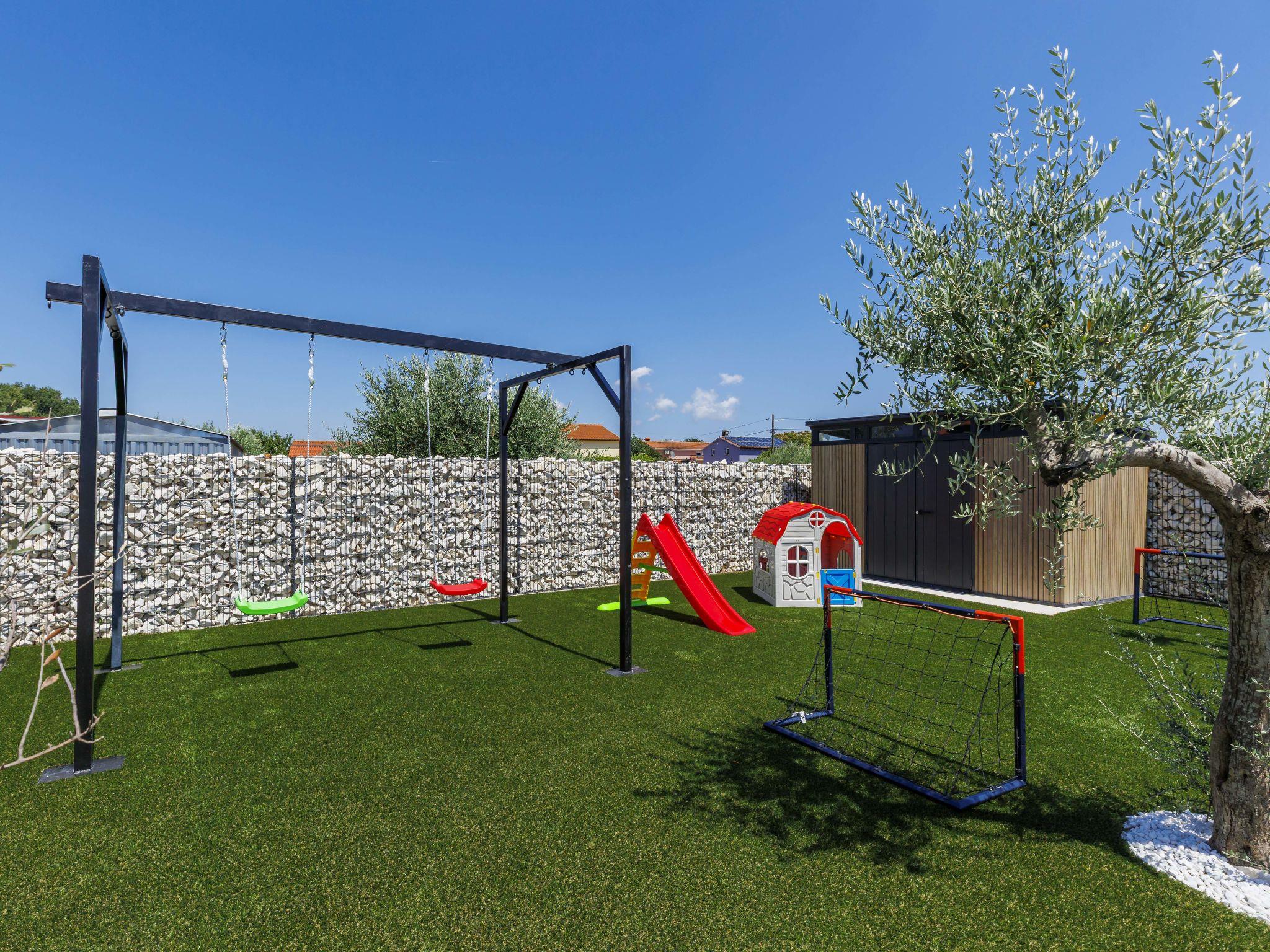 Villa "Qube n' Qube", 2 storeys. In the hamlet Loborika 6 km from the centre of Marcana, 6 km from the centre of Pula, in a quiet, sunny position, 8 km from the sea. Private: property 860 m2 (fenced), garden with wildlife garden and flowers, swimming pool angular, heated (10 x 3 m, depth 140 cm, seasonal availability: 01.Apr. - 01.Nov.) with internal staircase. Outdoor shower, terrace (30 m2), garden furniture, barbecue, children's playground (slide, swing), pool maintenance by the owner/gardener. In the house: internet access, air conditioning. Parking (for 4 cars) at the house on the premises. Shop 2.3 km, supermarket 6 km, restaurant 2 km, café 2.3 km, bus stop 2.3 km, sandy beach 16 km pebble beach 13 km. Tennis 15 km, riding stable 5 km, walking paths from the house 100 m, cycle lane 150 m. Nearby attractions: Amphitheater 8 km, National park Brijuni 14 km, Nature park Rt. Kamenjak 18 km.