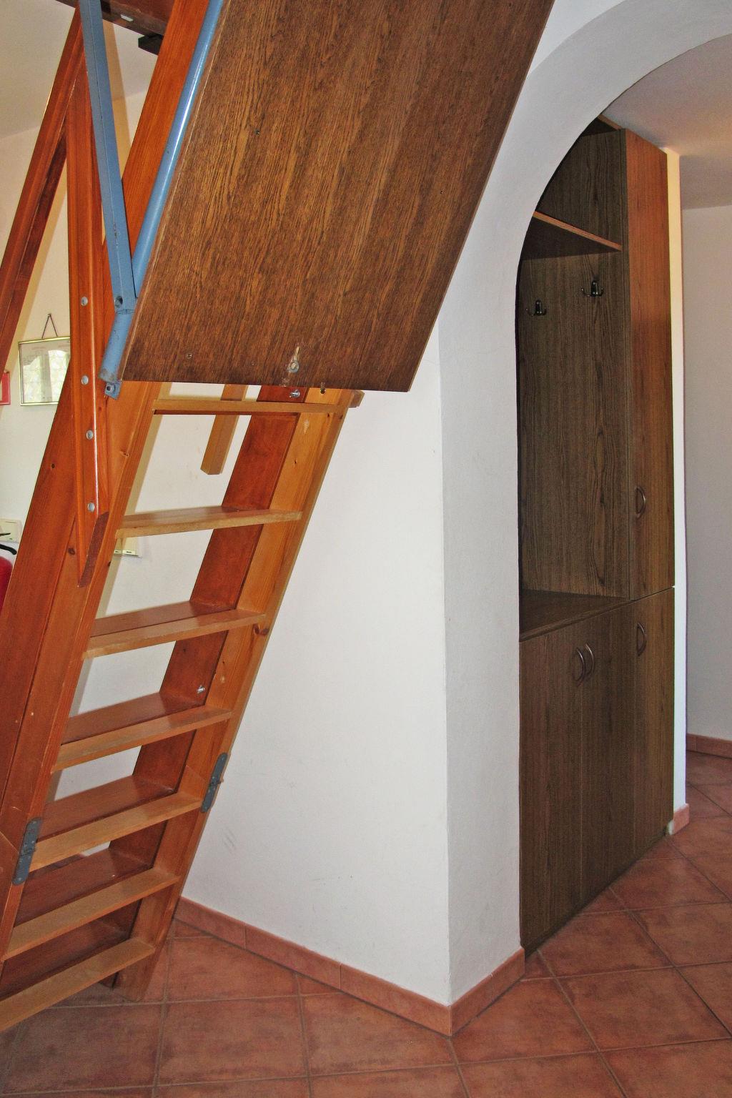 6-room apartment 125 m2 on 2 levels on 1st floor. Living/dining room with open-hearth fireplace, dining table, satellite TV and air conditioning. Exit to the terrace. 1 room with 1 double bed. Exit to the terrace. 1 room with 1 double bed. 1 room with 1 french bed. Exit to the terrace. Open kitchen (4 hot plates, oven, dishwasher, toaster, kettle, freezer, electric coffee machine). Bath/WC, shower/WC, double hand-basin. Top floor: (steep stair) living/dining room with sloping ceilings with rooflight with dining table, satellite TV and air conditioning. 1 room with sloping ceilings with rooflight with 1 bed and 1 french bed. With sloping ceilings, small kitchen (4 hot plates, oven). Shower/WC. Electric heating. Terrace 11 m2, roofed, terrace 17 m2, roofed. Terrace furniture, deck chairs. View of the sea. Facilities: baby cot. Internet (WiFi, free). Please note: non-smoking house.