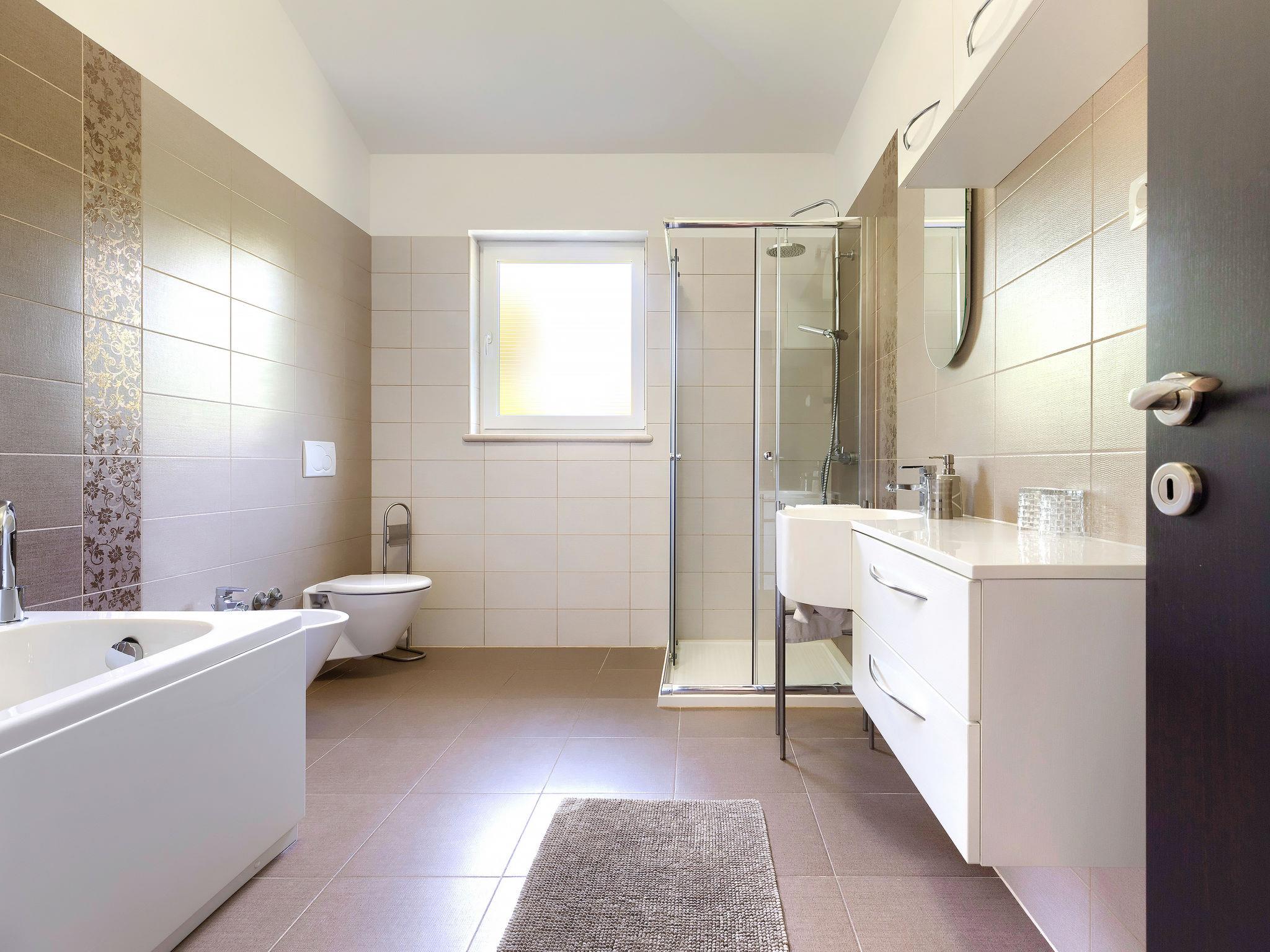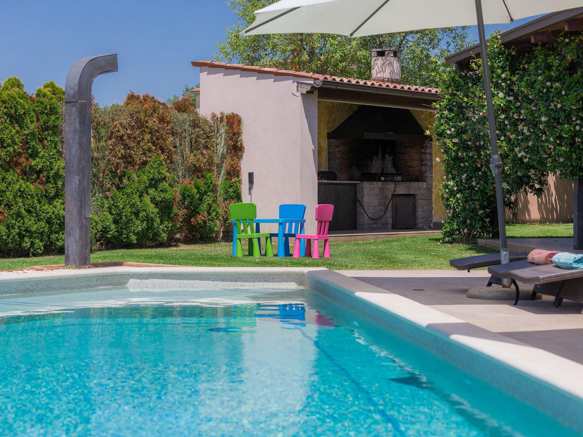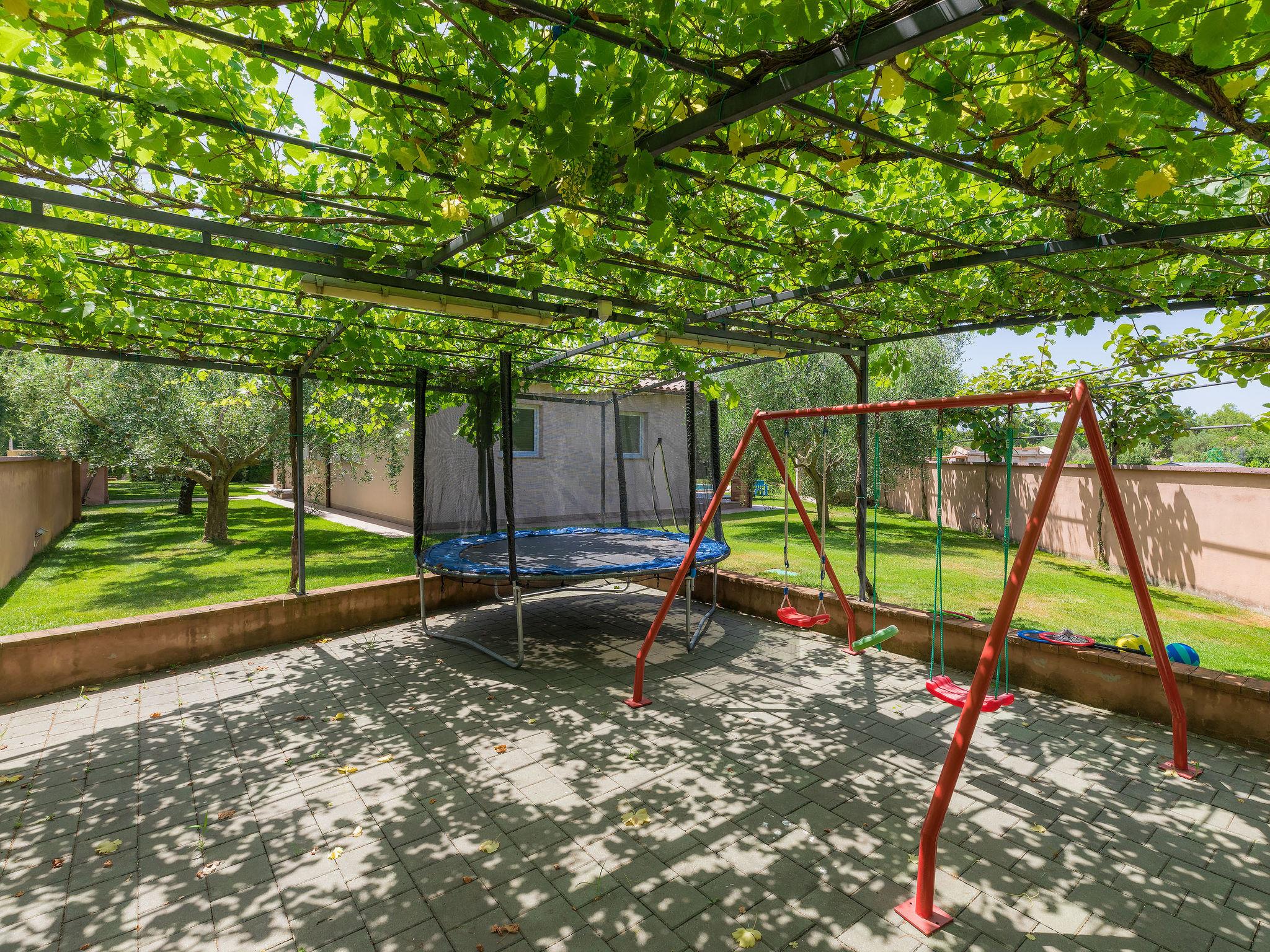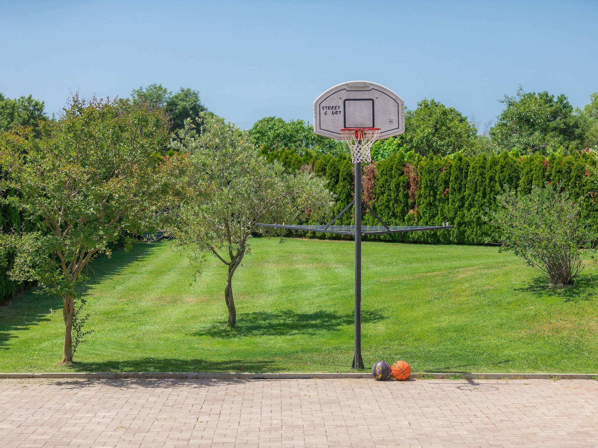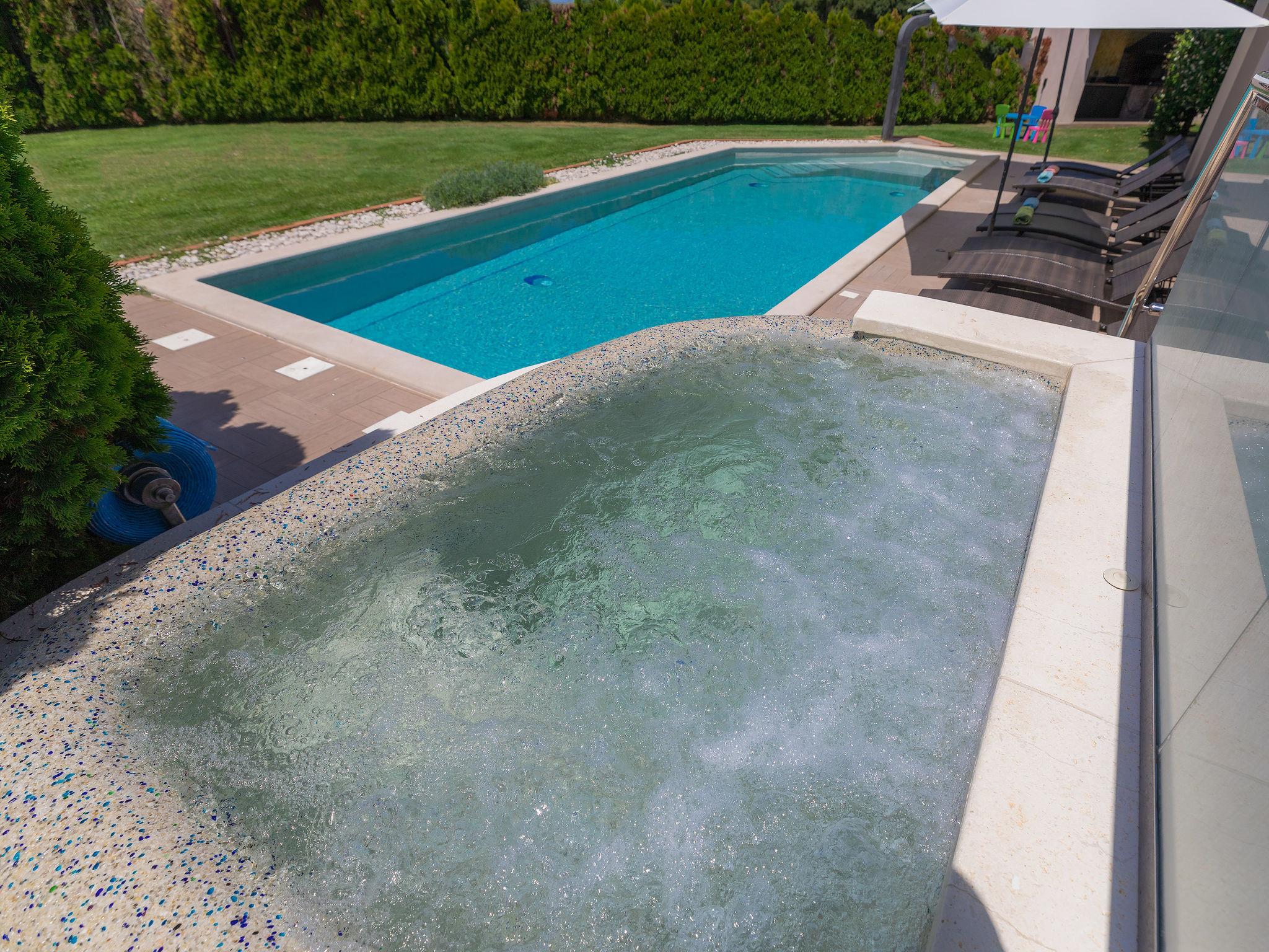 Single-family house "Villa Vela", 3 storeys. 300 m from the centre of Šišan, on the outskirts, 2 km from the centre of Ližnjan, 7 km from the centre of Pula, 3 km from the sea, 3 km from the beach. Private: property 1'600 m2 with lawn and trees, swimming pool heated (12 x 4 m, depth 135 cm, seasonal availability: 03.Apr. - 06.Nov.) with internal staircase and salt-electrolysis pool-cleaning system. Unconventional pool shape. Outdoor shower, hot tub, basketball, badminton, terrace (30 m2), garden furniture (swing). In the house: internet access, table tennis, trampoline, burglar alarm system, washing machine. Available: bicycles (2). Parking on the premises. Shop, restaurant 300 m, bus stop 450 m, pebble beach 3 km, rocky beach 3 km. Marina 5 km. Swimming pool heated (extra). Hot tub heating (extra).