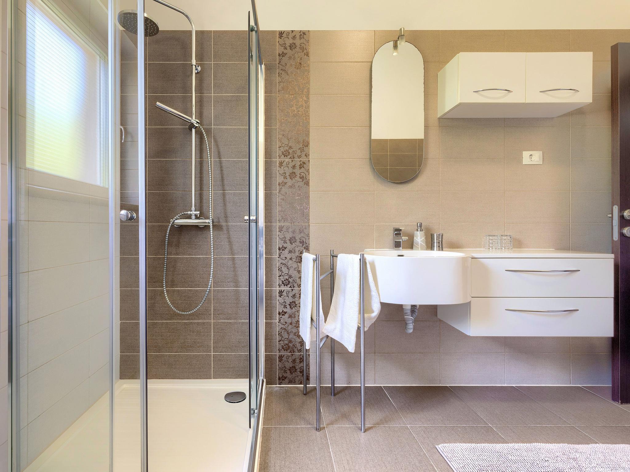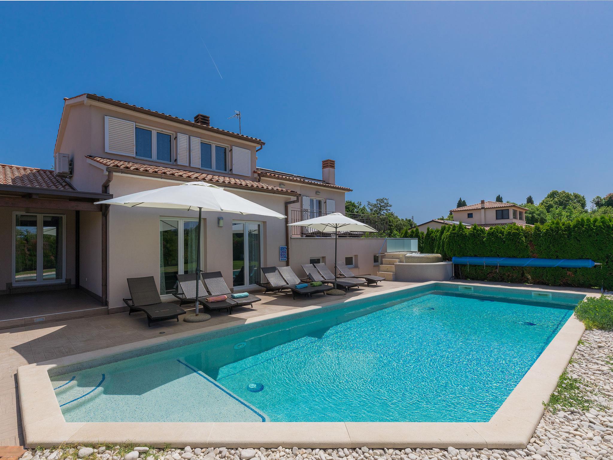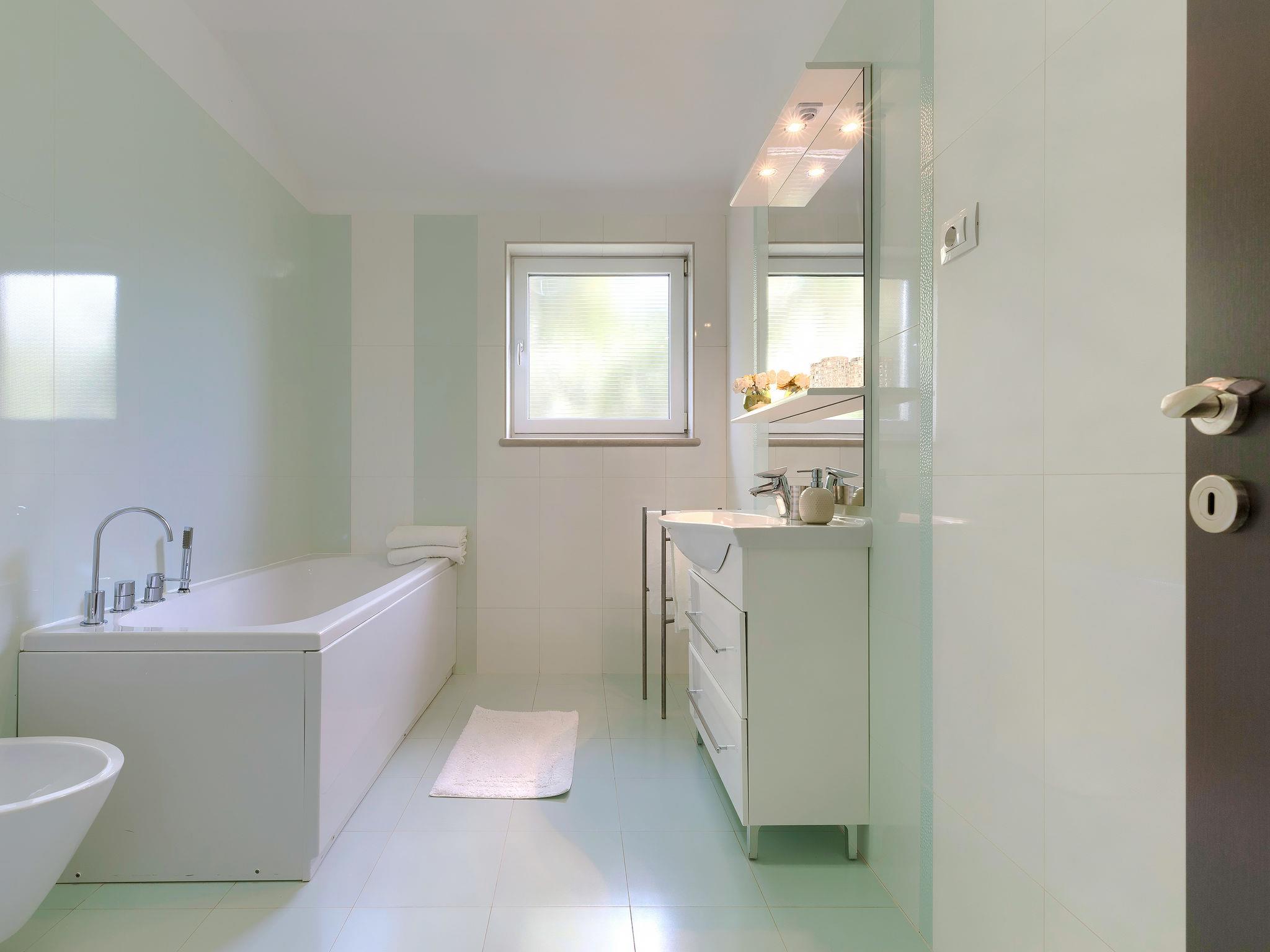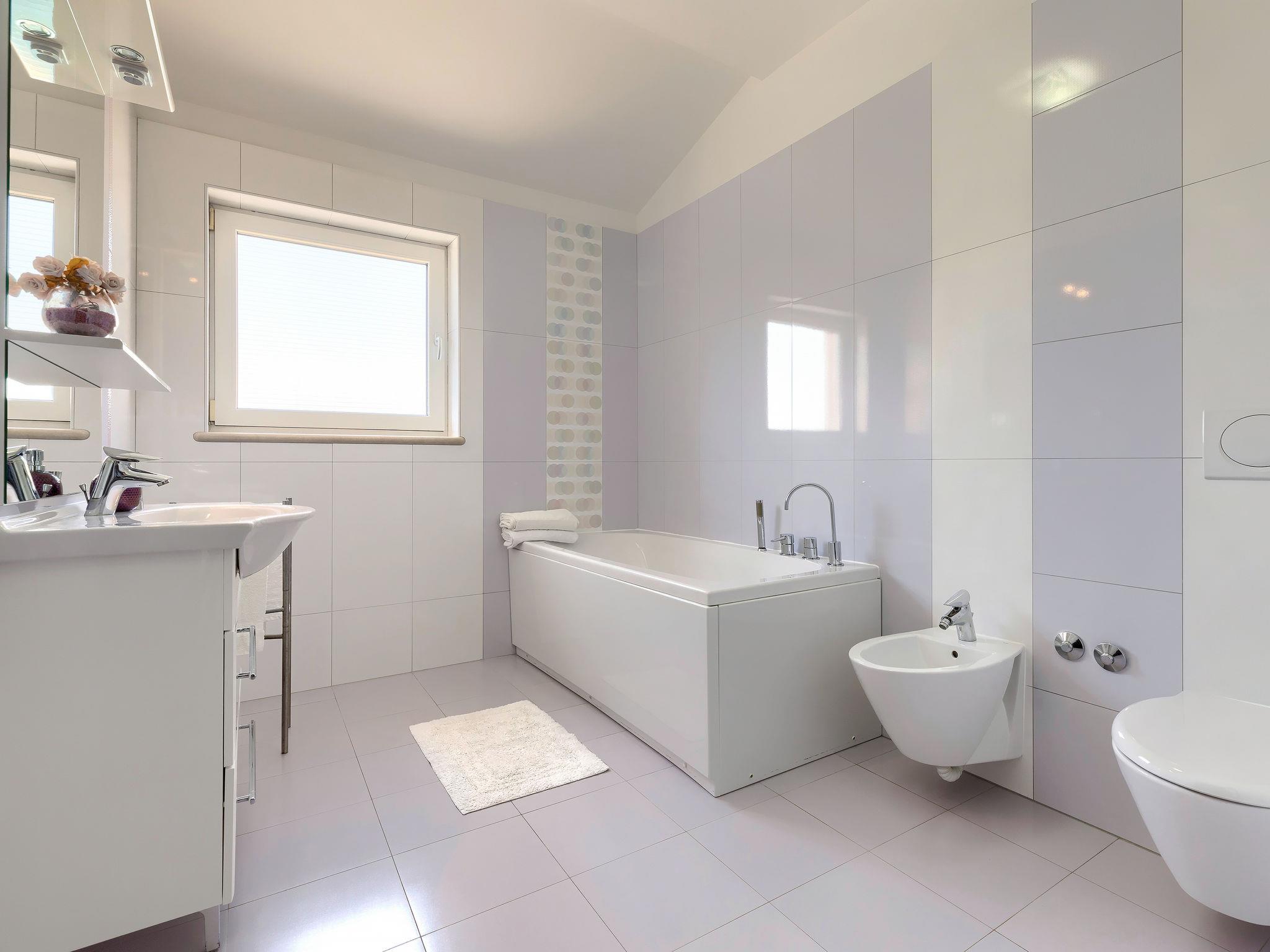 Single-family house "Villa Vela", 3 storeys. 300 m from the centre of Šišan, on the outskirts, 2 km from the centre of Ližnjan, 7 km from the centre of Pula, 3 km from the sea, 3 km from the beach. Private: property 1'600 m2 with lawn and trees, swimming pool heated (12 x 4 m, depth 135 cm, seasonal availability: 03.Apr. - 06.Nov.) with internal staircase and salt-electrolysis pool-cleaning system. Unconventional pool shape. Outdoor shower, hot tub, basketball, badminton, terrace (30 m2), garden furniture (swing). In the house: internet access, table tennis, trampoline, burglar alarm system, washing machine. Available: bicycles (2). Parking on the premises. Shop, restaurant 300 m, bus stop 450 m, pebble beach 3 km, rocky beach 3 km. Marina 5 km. Swimming pool heated (extra). Hot tub heating (extra).